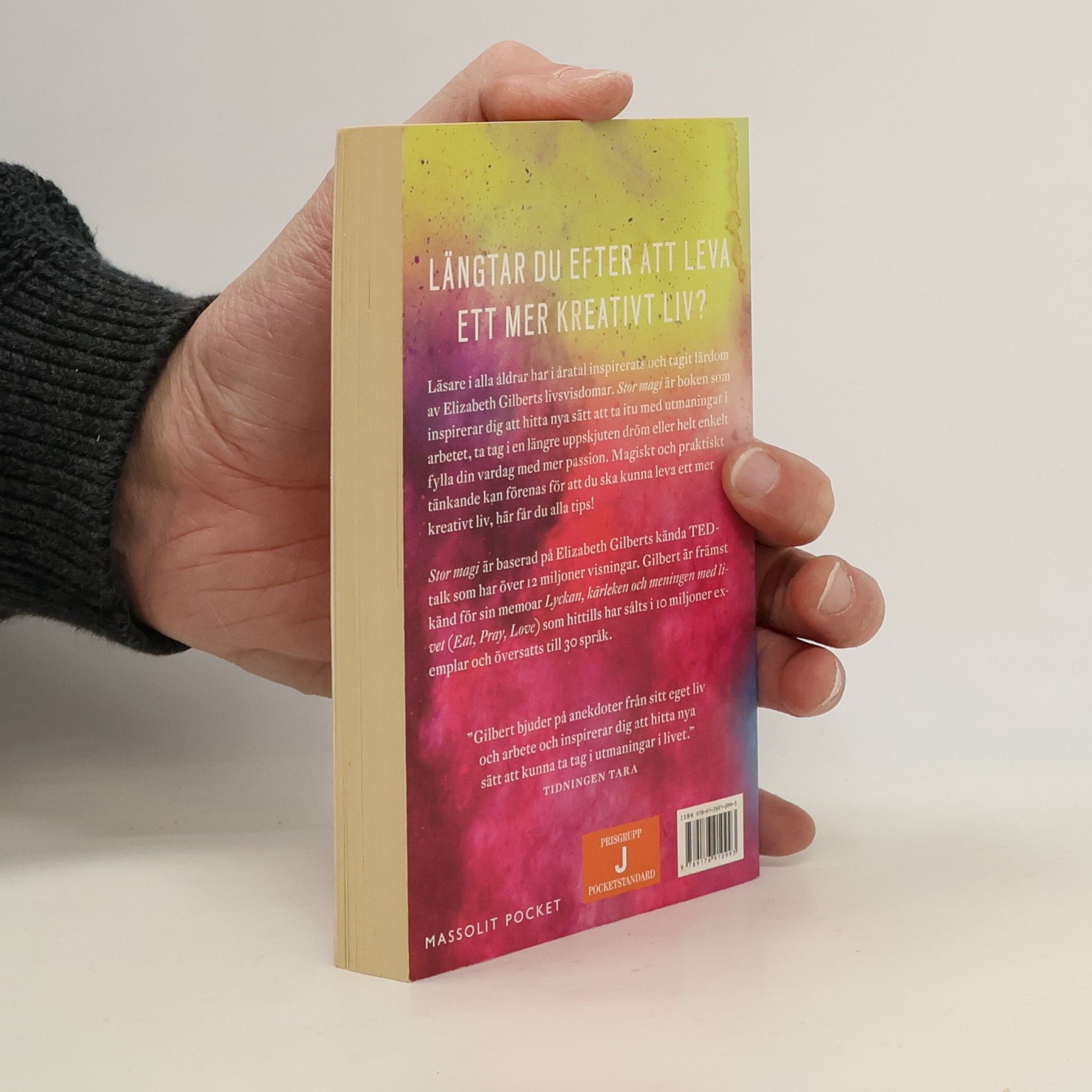 Läsare i alla åldrar och samhällsklasser har inspirerats och tagit lärdom av Elizabeth Gilberts böcker i åratal. Den här gången gräver den omtyckta författaren ner sig i sin egen kreativa process för att dela sin visdom och att ge sitt eget unika perspektiv om att vara kreativ. Med djup empati och strålande generositet erbjuder hon storartade insikter om inspirationens mystiska natur. Hon ber oss att omfamna vår nyfikenhet och släppa taget om det onödiga lidandet. Hon visar oss hur vi griper oss an det vi älskar mest och hur vi hanterar våra största rädslor. Hon diskuterar de attityder, tillvägagångssätt och vanor vi behöver för att kunna leva vårt liv på det mest kreativa sättet. Hon balanserar mellan själfull andlighet och munter saklighet. Gilbert uppmuntrar oss att upptäcka de konstiga juvelerna vi alla har inom oss. Oavsett om vi funderar på att skriva en bok, göra konst, hitta nya sätt att hantera utmaningar i vårt arbete, ta tag i en sedan länge uppskjuten dröm eller helt enkelt ingjuta vardagen med mer mindfulness och passion. Stor magi öppnar en ny värld full av förundran och glädje.