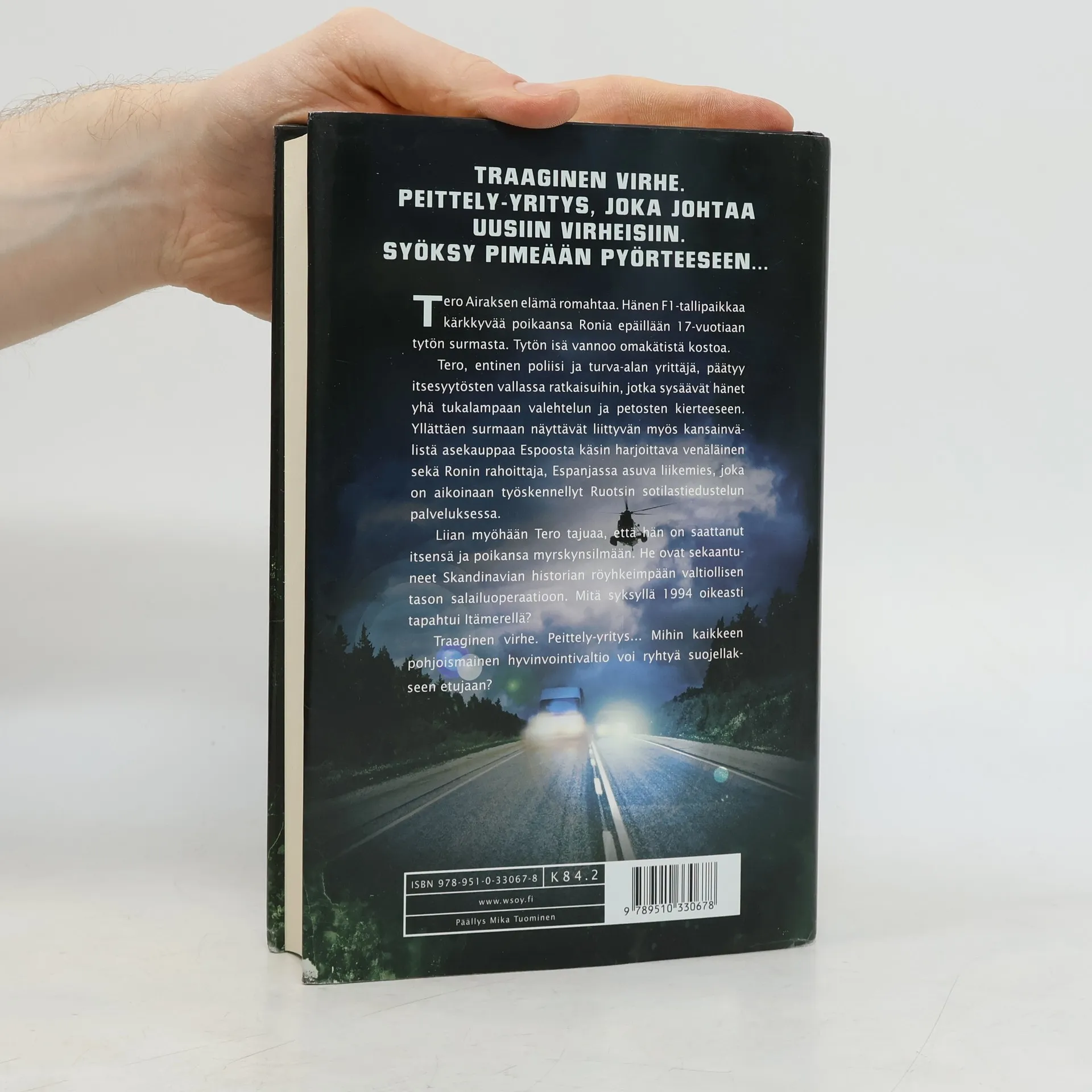 Tero Airaksen elämä romahtaa. Hänen F1-tallipaikkaa kärkkyvää poikaansa Ronia epäillään 17-vuotiaan tytön surmasta. Tytön isä vannoo omakätistä kostoa.Tero, entinen poliisi ja turva-alan yrittäjä, päätyy itsesyytösten vallassa ratkaisuihin, jotka sysäävät hänet yhä tukalampaan valehtelun ja petosten kierteeseen. Yllättäen surmaan näyttävät liittyvän myös kansainvälistä asekauppaa Espoosta käsin harjoittava venäläinen sekä Ronin rahoittaja, Espanjassa asuva liikemies, joka on aikoinaan työskennellyt Ruotsin sotilastiedustelun palveluksessa.Liian myöhään Tero tajuaa, että hän on saattanut itsensä ja poikansa myrskynsilmään. He ovat sekaantuneet Skandinavian historian röyhkeimpään valtiollisen tason salailuoperaatioon. Mitä syksyllä 1994 oikeasti tapahtui Itämerellä?Traaginen virhe. Peittely-yritys… Mihin kaikkeen pohjoismainen hyvinvointivaltio voi ryhtyä suojellakseen etujaan?