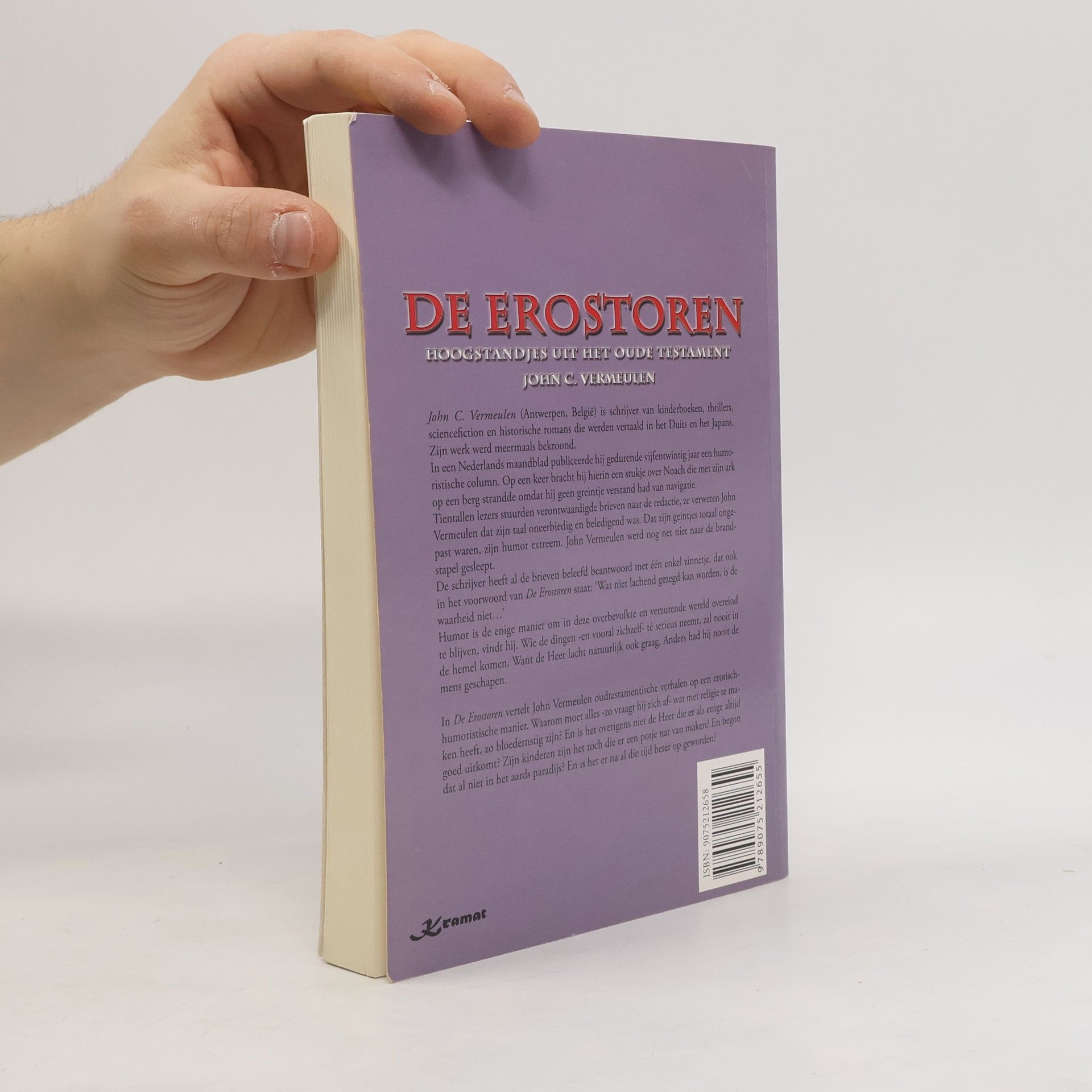 John C. Vermeulen (Antwerpen, België) is schrijver van kinderboeken, thrillers, sciencefiction en historische romans die werden vertaald in het Duits en het Japans. Zijn werk werd meermaals bekroond. In een Nederlands maandblad publiceerde hij gedurende vijfentwintig jaar een humoristische column. Op een keer bracht hij hierin een stukje over Noach die met zijn ark op een berg strandde omdat hij geen greintje verstand had van navigatie. Tientallen lezers stuurden verontwaardigde brieven naar de redactie, ze verweten John Vermeulen dat zijn taal oneerbiedig en beledigend was. Dat zijn geintjes totaal ongepast waren, zijn humor extreem. John Vermeulen werd nog net niet naar de brandstapel gesleept. De schrijver heeft al de brieven beleefd beantwoord met één enkel zinnetje, dat ook in het voorwoord van 'De Erostoren' staat: 'Wat niet lachend gezegd kan worden, is de waarheid niet...'. Humor is de enige manier om in deze overbevolkte en verzurende wereld overeind te blijven, vindt hij. Wie de dingen - en voorval zichzelf - té serieus neemt, zal nooit in de hemel komen. Want de Heer lacht natuurlijk ook graag. Anders had hij nooit de mens geschapen.