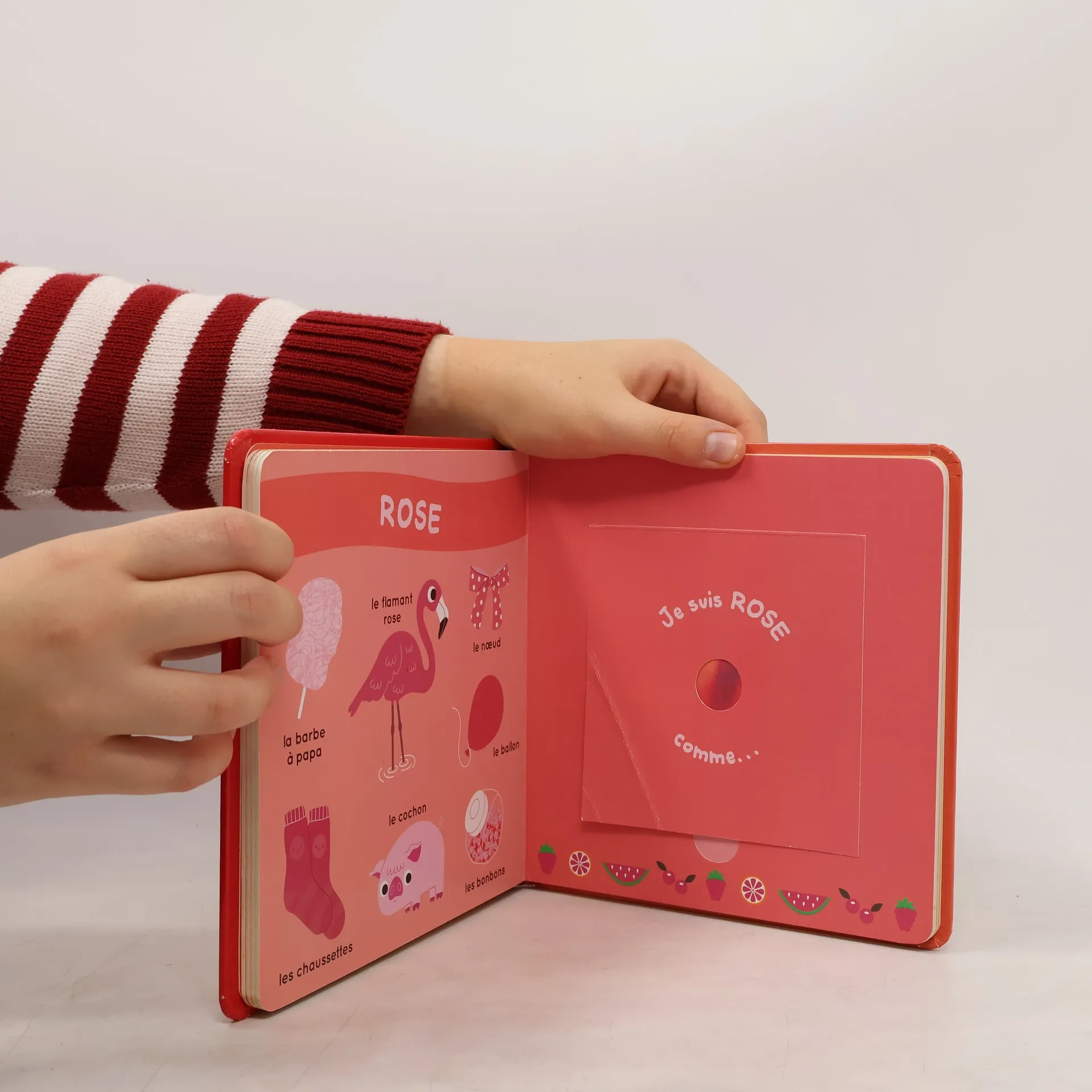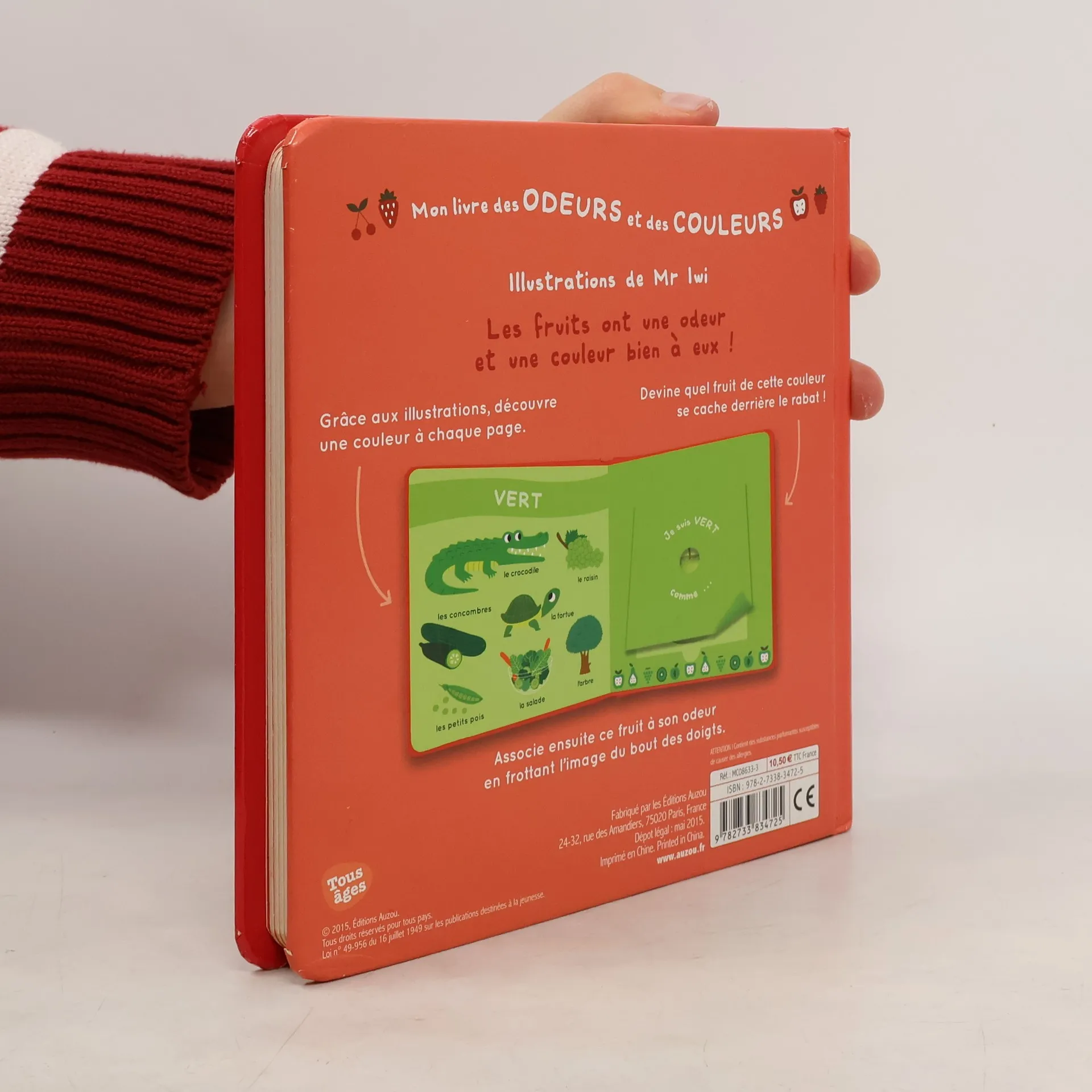 Chaque page de gauche prsente une couleur grce de jolies illustrationssimples et enfantines mais quel fruit de cette couleur se cache-t-il derrire le rabat En frottant son doigt sur le fruit l'enfant y dcouvrira son odeur.