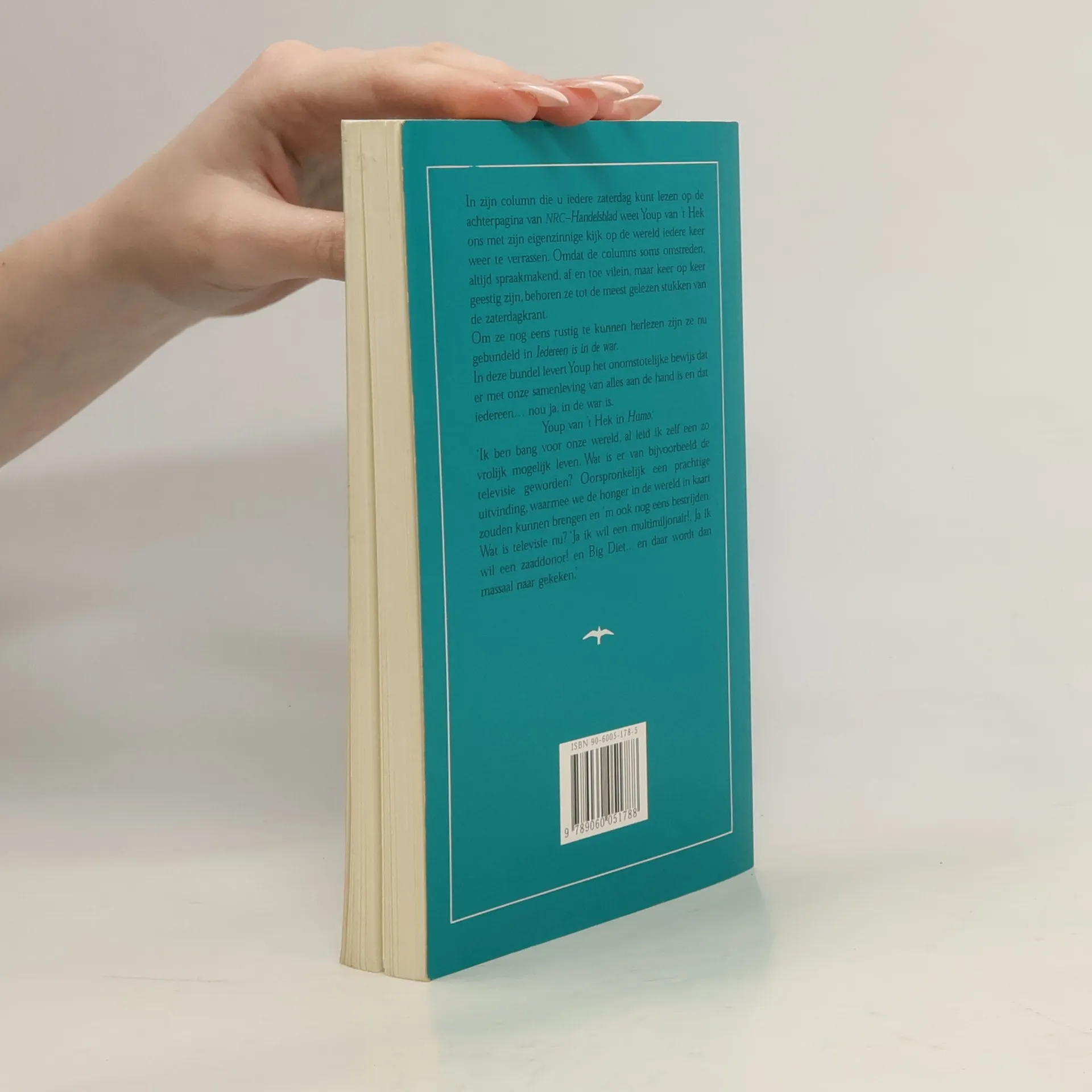 In zijn column die u iedere zaterdag kunt lezen op de achterpagina van NRC Handelsblad weet Youp van 't Hek ons met zijn eigenzinnige kijk op de wereld iedere keer weer te verrassen. Omdat de columns soms omstreden, altijd spraakmakend, af en toe vilein, maar keer op keer geestig zijn, behoren ze tot de meest gelezen stukken van de zaterdagkrant. Om ze nog eens rustig te kunnen herlezen zijn ze nu gebundeld in Iedereen is in de war.In deze bundel levert Youp het onomstotelijke bewijs dat er met onze samenleving van alles aan de hand is en dat iedereen... nou ja, in de war is. Youp van 't Hek in Humo:'Ik ben bang voor onze wereld, al leid ik zelf een zo vrolijk mogelijk leven. Wat is er van bijvoorbeeld de televisie geworden? Oorspronkelijk een prachtige uitvinding, waarmee we de honger in de wereld in kaart zouden kunnen brengen en 'm ook nog eens bestrijden. Wat is televisie nu? Ja ik wil een een multimiljonair!, Ja, ik wil een zaaddonor! en Big Diet.... en daar wordt dan massaal naar gekeken.'