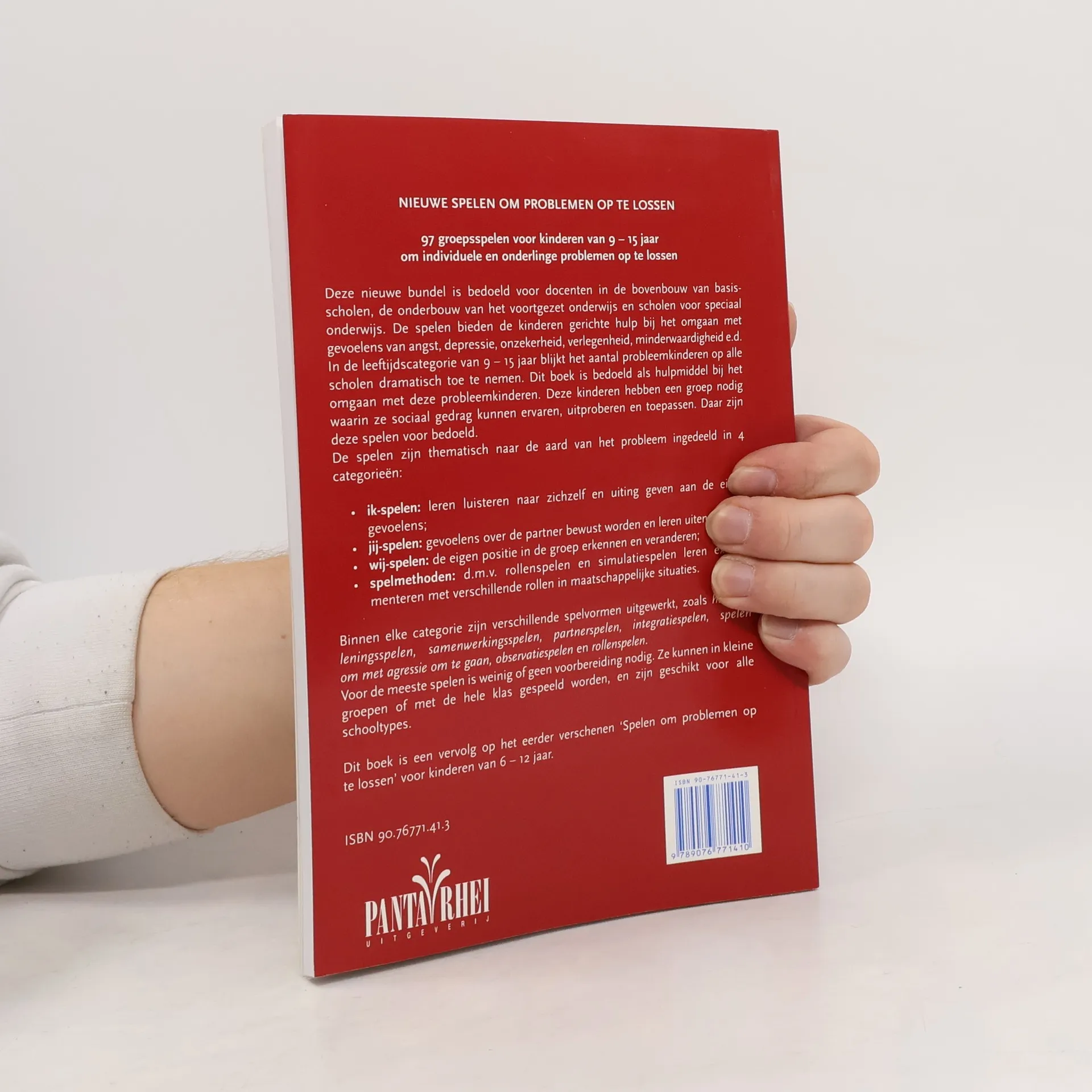 De spelen bieden de kinderen gerichte hulp bij het omgaan met gevoelens van angst, depressie, onzekerheid, verlegenheid, minderwaardigheid, enz. In deze leeftijdscategorie blijkt het aantal probleemkinderen op alle scholen dramatisch toe te nemen. Dit boek is bedoeld als hulpmiddel bijh et omgaan met deze probleemkinderen. Deze kinderen hebben een groep nodig waarin ze sociaal gedrag kunnen ervaren, uitproberen en toepassen. De spelen zijn thematisch naar de aard van het probleem ingedeeld in 4 categorieën: ik-spelen: leren luisteren naar zichzelf en uiting geven aan de eigen gevoelens; jij-spelen: bewust worden van gevoelens over de partner en dit leren uiten; wij-spelen: de eigen positie in de groep erkennen en veranderen; spelmethoden: d.m.v. rollenspelen en simulatiespelen leren experimenteren met verschillende rollen in maatschappelijke situaties. Binnen elke categorie zijn verschillende spelvormen uitgewerkt, zoals hulpverleningsspelen, samenwerkingsspelen, partnerspelen, integratiespelen, spelen om met agressie om te gaan, observatiespelen en rollenspelen. Voor de meeste spelen is weinig of geen voorbereiding nodig. Ze kunnen in kleine groepen of met de hele klas gespeeld worden. Dit boek is een vervolg op het eerder verschene 'Spelen om problemen op te lossen' voor kinderen van 6 tot 12 jaar.