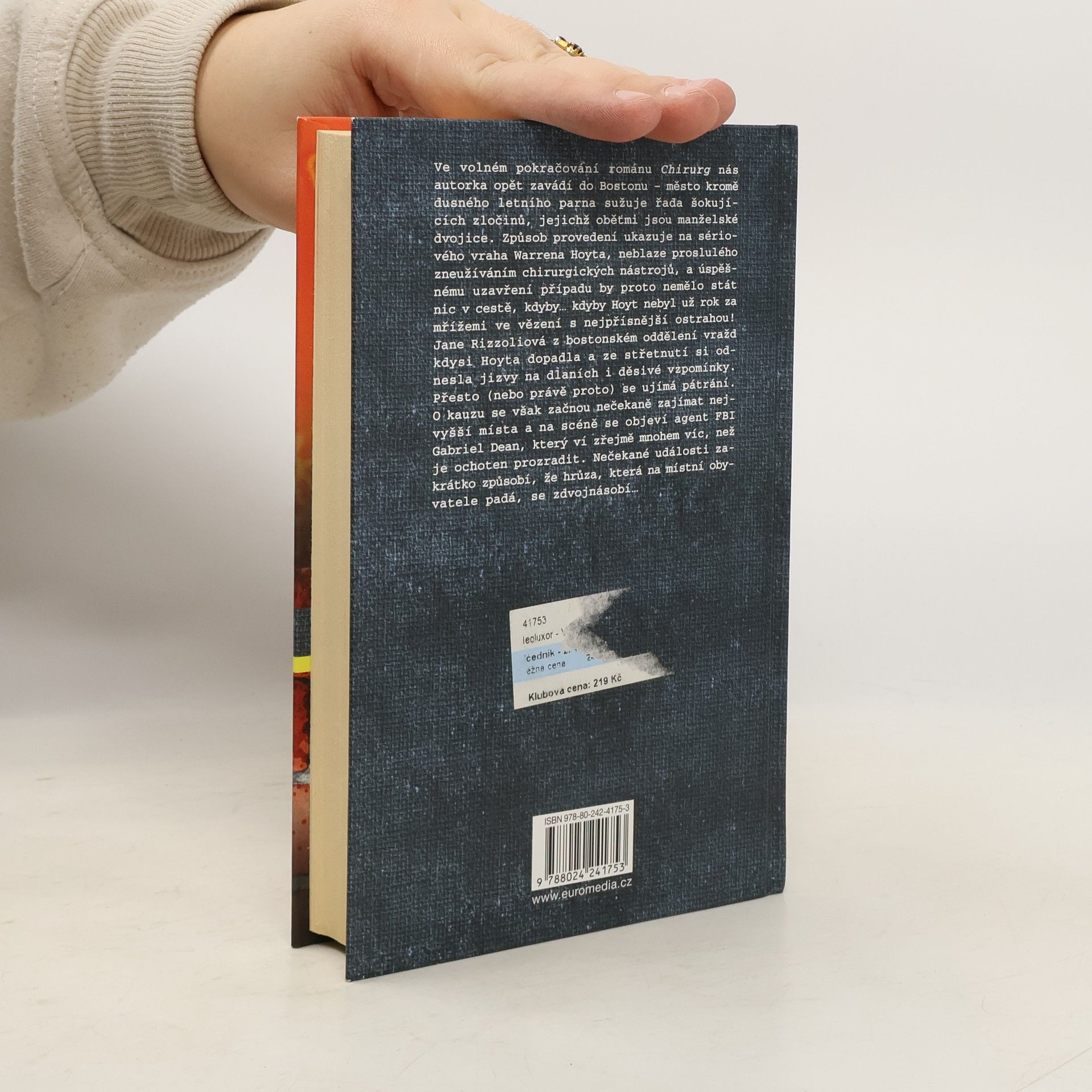 Volné pokračování románu Chirurg – Boston sužuje řada šokujících vražd manželských dvojic. Způsob provedení ukazuje na sériového pachatele Warrena Hoyta přezdívaného Chirurg, úspěšnému uzavření případu by proto nemělo stát nic v cestě, kdyby… Kdyby Hoyt neseděl už rok ve vězení s nejpřísnější ostrahou! Jane Rizzoliová z bostonském oddělení vražd kdysi Hoyta dopadla a ze střetnutí si odnesla jizvy na dlaních i děsivé vzpomínky. Přesto (nebo právě proto) se ujímá pátrání. Nečekané události zakrátko způsobí, že hrůza, která na místní obyvatele padá, se zdvojnásobí…