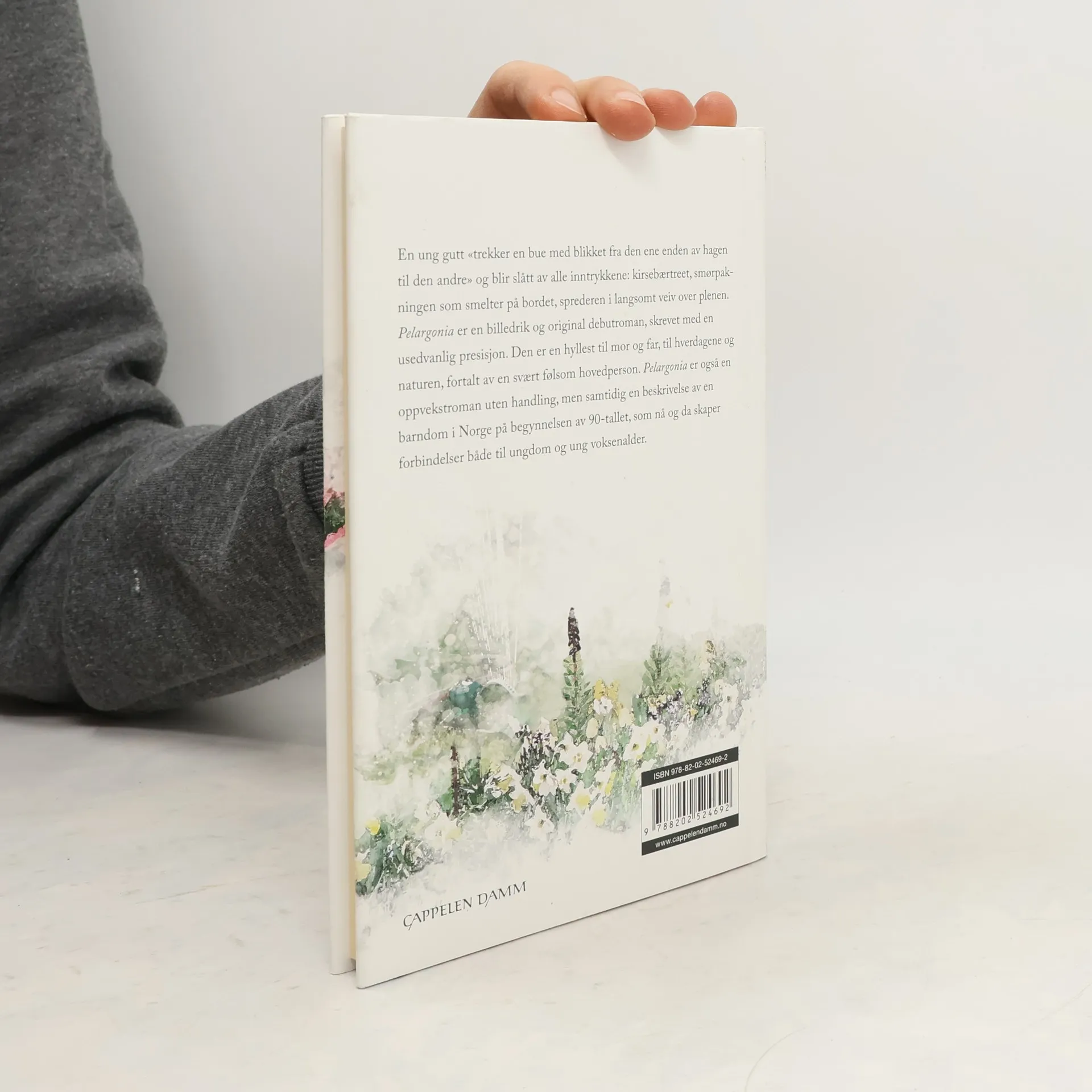 En ung gutt «trekker en bue med blikket fra den ene enden av hagen til den andre» og blir slått av alle inntrykkene: kirsebærtreet, smørpakningen på bordet, sprederen i langsomt veiv over plenen. Pelargonia er en billedrik og original debutroman skrevet med en usedvanlig presisjon. Den er en hyllest til mor og far, til hverdagene og naturen, fortalt av en svært følsom hovedperson.