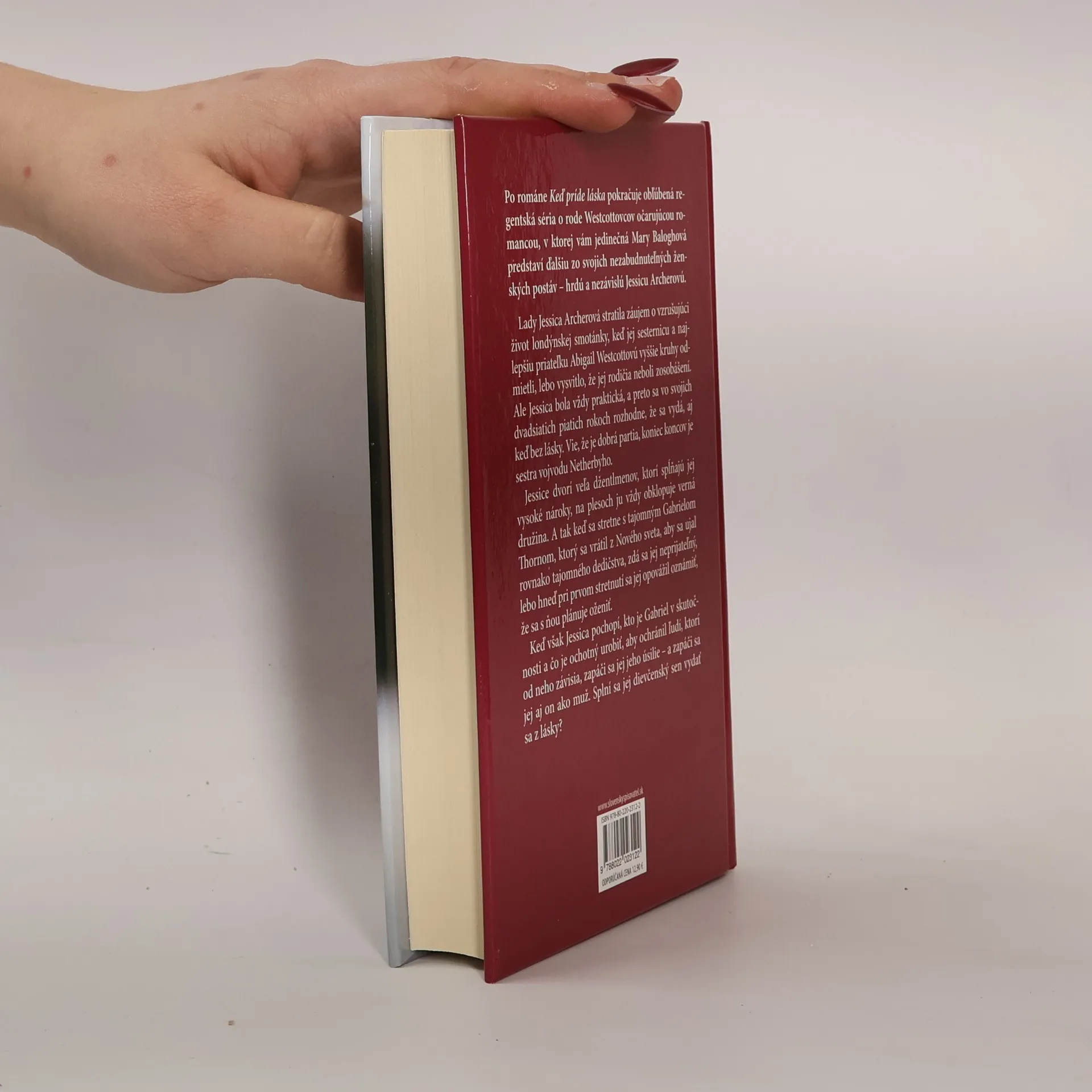 Po románe Keď príde láska pokračuje obľúbená regentská séria o rode Westcottovcov očarujúcou romancou, v ktorej vám jedinečná Mary Baloghová predstaví ďalšiu zo svojich nezabudnuteľných ženských postáv – hrdú a nezávislú Jessicu Archerovú. Lady Jessica Archerová stratila záujem o vzrušujúci život londýnskej smotánky, keď jej sesternicu a najlepšiu priateľku Abigail Westcottovú vyššie kruhy odmietli, lebo vysvitlo, že jej rodičia neboli zosobášení. Ale Jessica bola vždy praktická, a preto sa vo svojich dvadsiatich piatich rokoch rozhodne, že sa vydá, aj keď bez lásky. Vie, že je dobrá partia, koniec koncov je sestra vojvodu Netherbyho. Jessice dvorí veľa džentlmenov, ktorí spĺňajú jej vysoké nároky, na plesoch ju vždy obklopuje verná družina. A tak keď sa stretne s tajomným Gabrielom Thornom, ktorý sa vrátil z Nového sveta, aby sa ujal rovnako tajomného dedičstva, zdá sa jej neprijateľný, lebo hneď pri prvom stretnutí sa jej opovážil oznámiť, že sa s ňou plánuje oženiť. Keď však Jessica pochopí, kto je Gabriel v skutočnosti a čo je ochotný urobiť, aby ochránil ľudí, ktorí od neho závisia, zapáči sa jej jeho úsilie – a zapáči sa jej aj on ako muž. Splní sa jej dievčenský sen vydať sa z lásky?