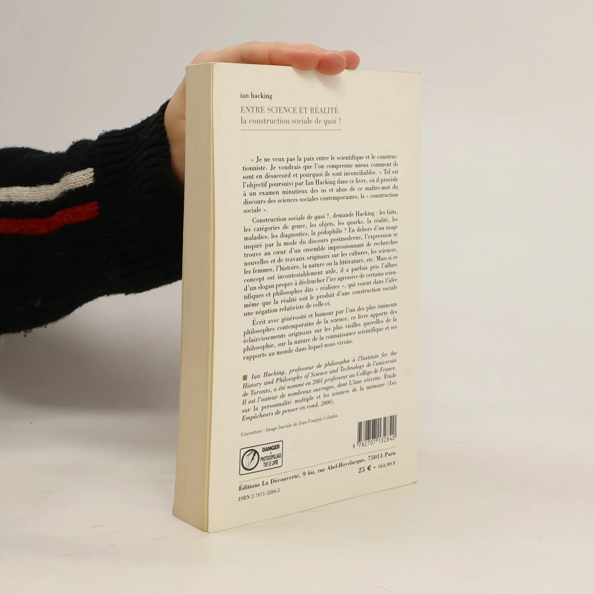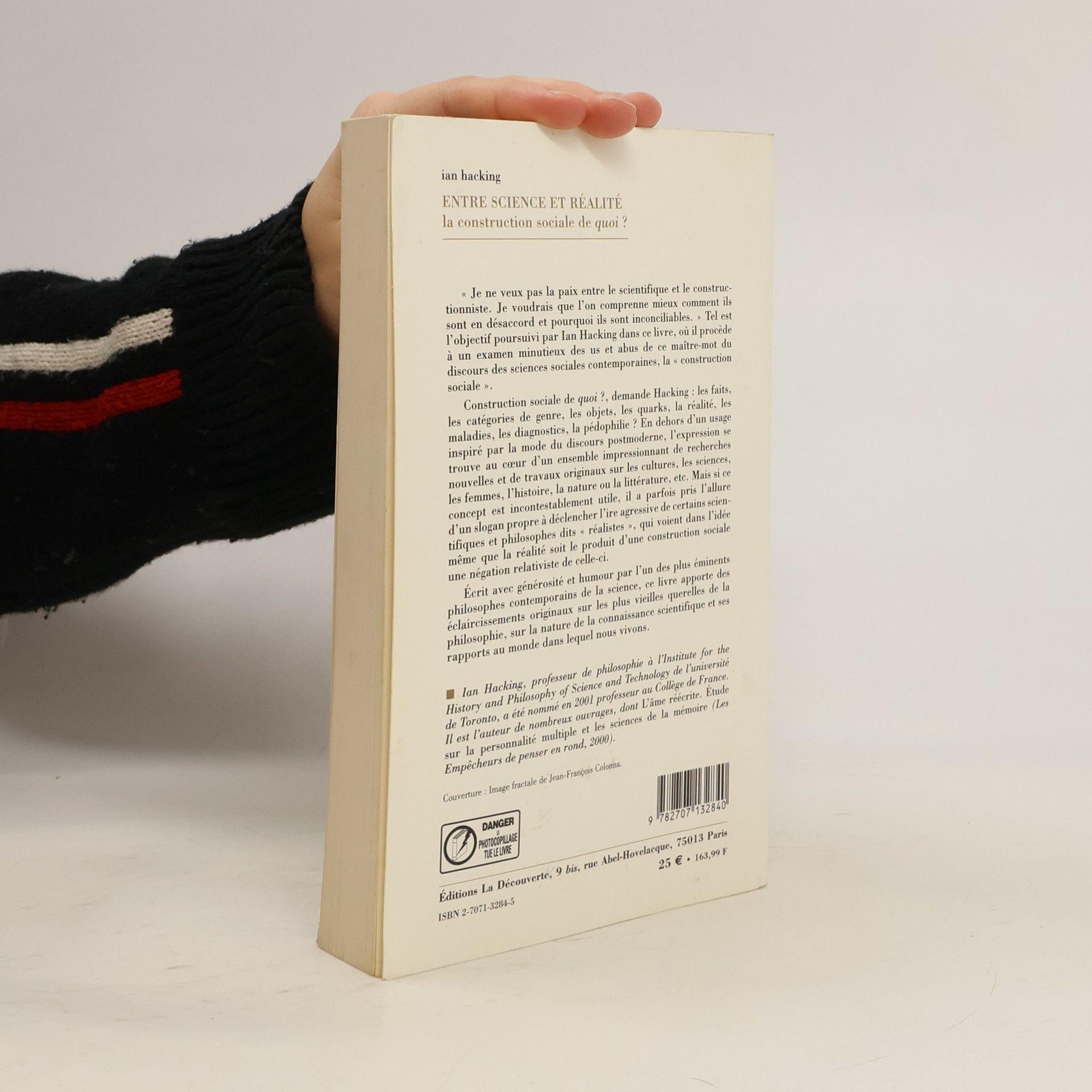 " Je ne veux pas la paix entre le scientifique et le constructionniste. Je voudrais que l'on comprenne mieux comment ils sont en désaccord et pourquoi ils sont inconciliables. " Tel est l'objectif poursuivi par Ian Hacking dans ce livre, où il procède à un examen minutieux des us et abus de ce maître-mot du discours des sciences sociales contemporaines, la " construction sociale ". Construction sociale de quoi ?, demande Hacking : les faits, les catégories de genre, les objets, les quarks, la réalité, les maladies, les diagnostics, la pédophilie ? En dehors d'un usage inspiré par la mode du discours postmoderne, l'expression se trouve au cœur d'un ensemble impressionnant de recherches nouvelles et de travaux originaux sur les cultures, les sciences, les femmes, l'histoire, la nature ou la littérature, etc. Mais si ce concept est incontestablement utile, il a parfois pris l'allure d'un slogan propre à déclencher l'ire agressive de certains scientifiques et philosophes dits " réalistes ", qui voient dans l'idée même que la réalité soit le produit d'une construction sociale une négation relativiste de celle-ci. Écrit avec générosité et humour par l'un des plus éminents philosophes contemporains de la science, ce livre apporte des éclaircissements originaux sur les plus vieilles querelles de la philosophie, sur la nature de la connaissance scientifique et ses rapports au monde dans lequel nous vivons.