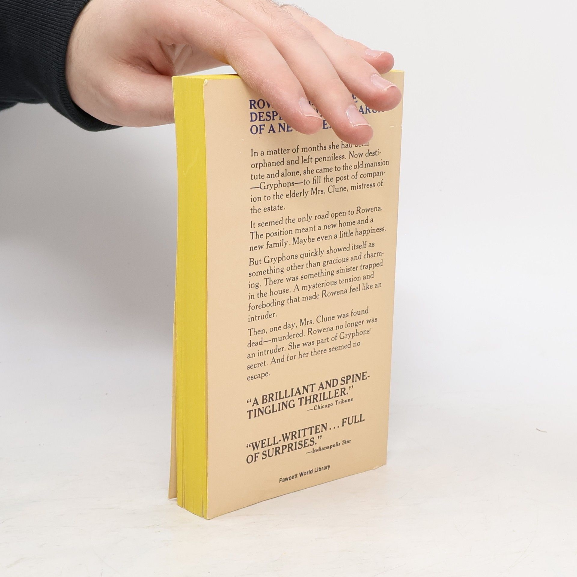 ROWEN A MANVILLE WAS DESPERATELY IN SEARCH OF A NEW LIFE.... In a matter of months she had been orphaned and left penniless. Now destitute and alone, she came to the old mansion — Gryphons — to fill the post of companion to the elderly Mrs. dune, mistress of the estate. It seemed the only road open to Rowena. The position meant a new home and a new family. Maybe even a little happiness. But Gryphons quickly showed itself as something other than gracious and charming. There was something sinister trapped in the house. A mysterious tension and foreboding that made Rowena feel like an intruder. Then, one day. Mrs. Clune was found dead — murdered. Rowena no longer was an intruder. She was part of Gryphons' secret. And for her there seemed no escape.