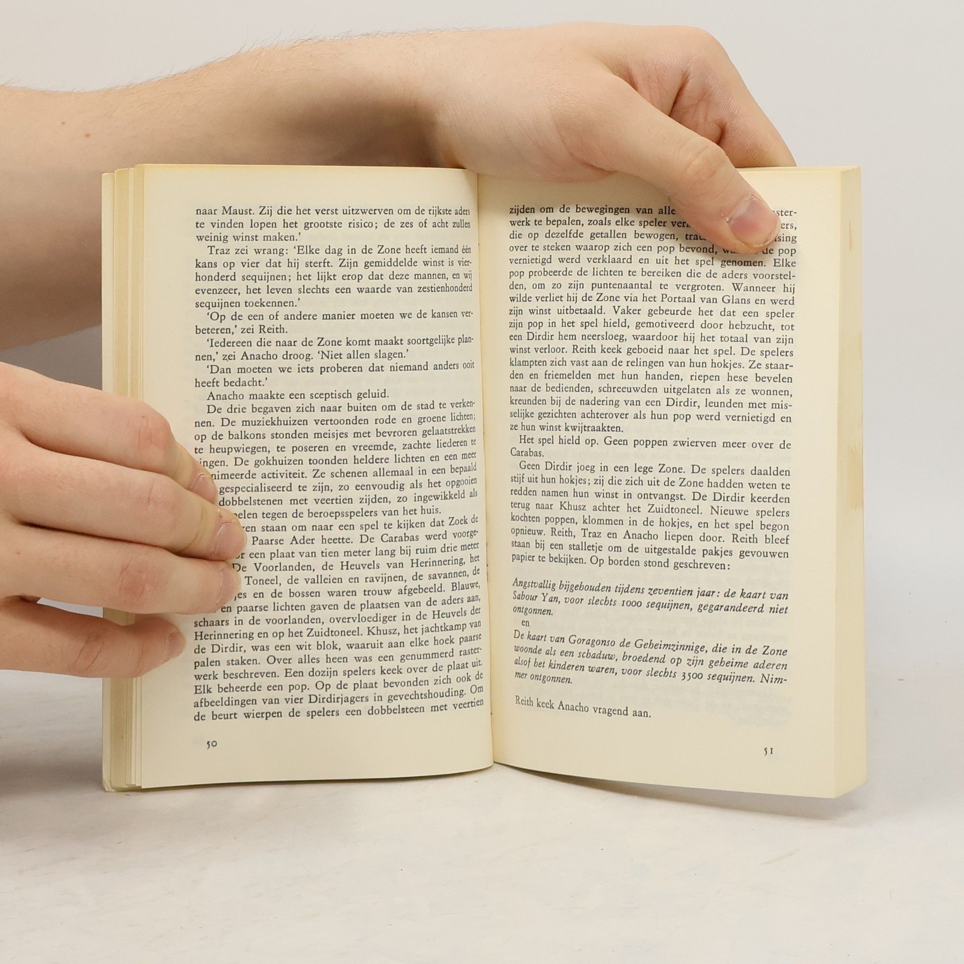 Anacho sloop naar de ingang van de grot en keek voorzichtig naar buiten. Hij sprong terug. "Ze hebben ons spoor verloren, ze cirkelen." Reith doofde de zaklamp en spiedde voorzichtig naar buiten. Honderd meter verderop daalde de glider geruisloos als een verwelkt blad naar de grond. Vijf Dirdir stapten uit. Een moment bleven ze staan en overlegden. Toen gingen ze naar de opening in de palissade. Als op een teken sprongen twee als zilveren leoparden vooruit en keken naar de grond. De anderen volgden hen met geladen wapens. De twee leiders stopten even en praatten in vreemde piep- en grunzgeluiden. Het was duidelijk dat ze precies wisten dat de prooi heel dichtbij was. Reith richtte met zijn pistool, maar de Dirdir bewogen voortdurend hun schilden en verhinderden zijn bedoeling...
