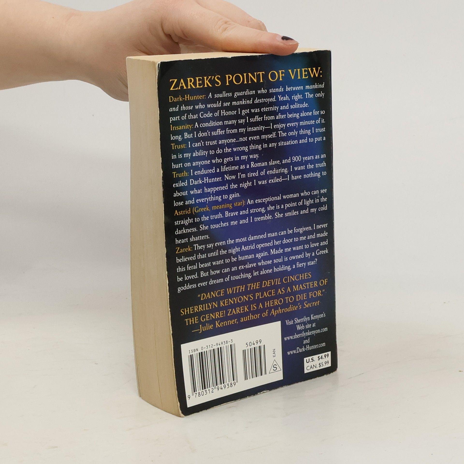Zarek's Point of View: Dark-Hunter: A soulless guardian who stands between mankind and those who would see mankind destroyed. Yeah, right. The only part of that Code of Honor I got was eternity and solitude. Insanity: A condition many say I suffer from after being alone for so long. But I don't suffer from my insanity-I enjoy every minute of it. Trust: I can't trust anyone...not even myself. The only thing I trust in is my ability to do the wrong thing in any situation and to hurt anyone who gets in my way. Truth: I endured a lifetime as a Roman slave, and 900 years as an exiled Dark-Hunter. Now I'm tired of enduring. I want the truth about what happened the night I was exiled-I have nothing to lose and everything to gain. Astrid (Greek, meaning star): An exceptional woman who can see straight to the truth. Brave and strong, she is a point of light in the darkness. She touches me and I tremble. She smiles and my cold heart shatters. Zarek: They say even the most damned man can be forgiven. I never believed that until the night Astrid opened her door to me and made this feral beast want to be human again. Made me want to love and be loved. But how can an ex-slave whose soul is owned by a Greek goddess ever dream of touching, let alone holding, a fiery star?
