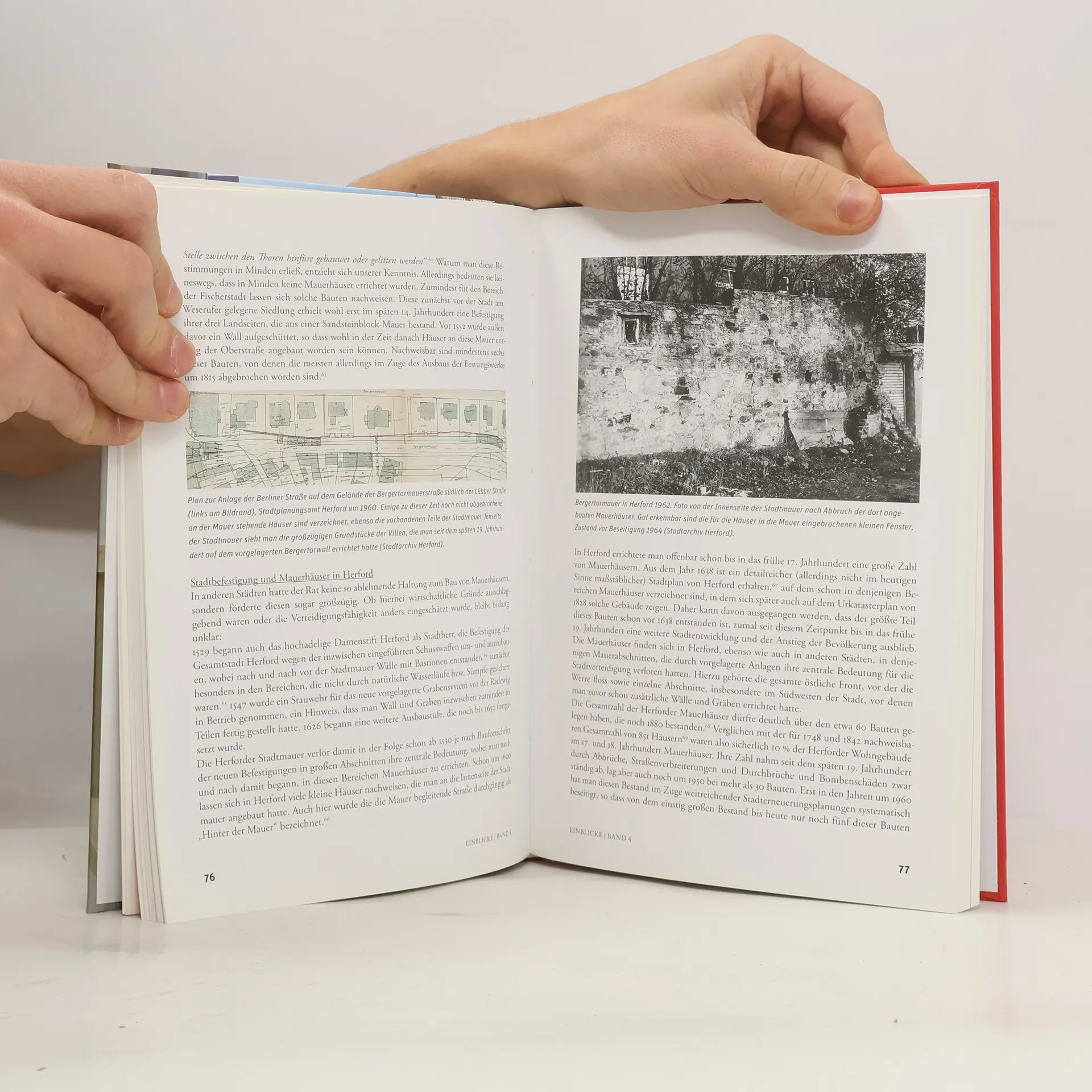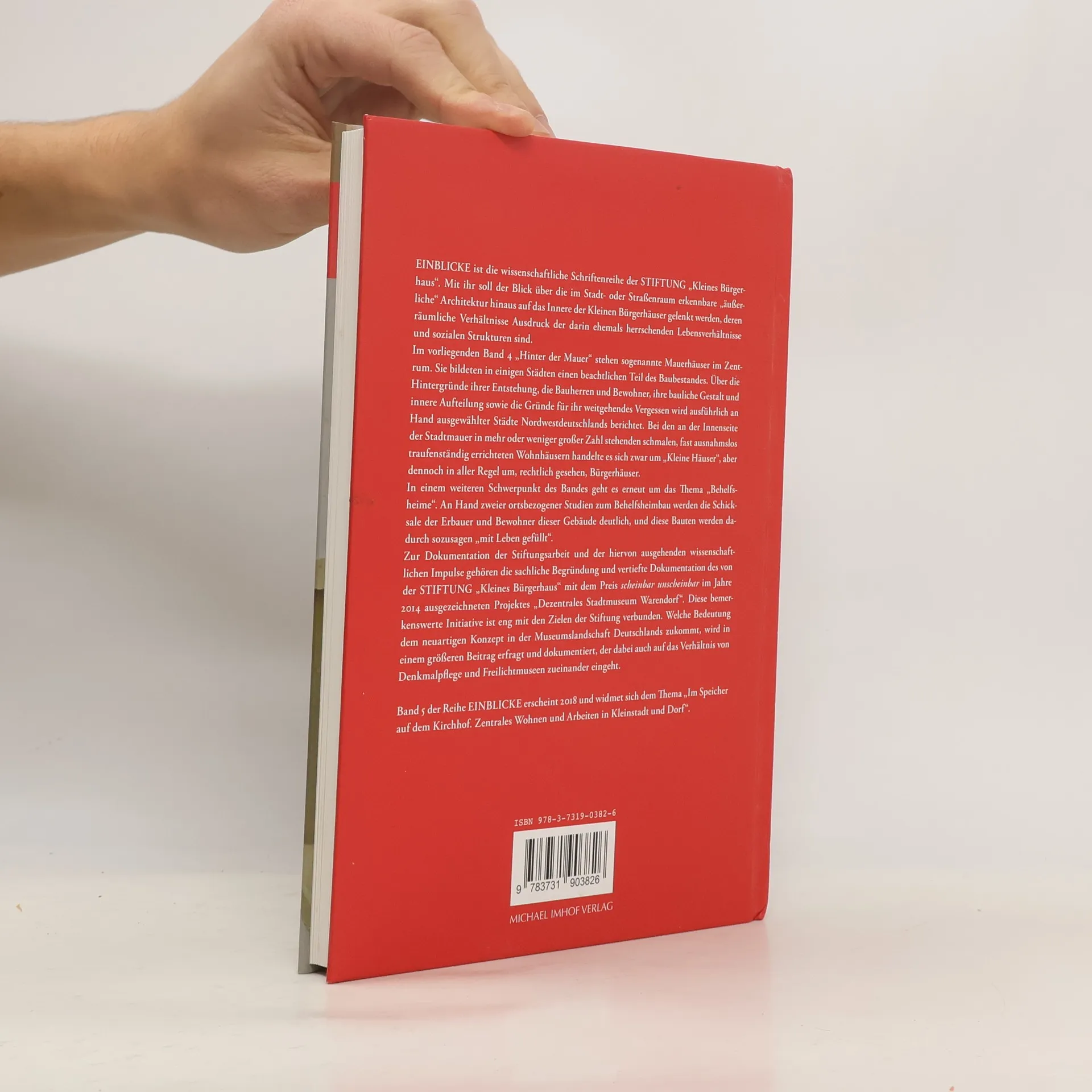 EINBLICKE ist die wissenschaftliche Schriftenreihe der Stiftung „Kleines Bürgerhaus“. Mit ihr soll der Blick über die im Stadtoder Straßenraum erkennbare „äußerliche“ Architektur hinaus auf das Innere der Kleinen Bürgerhäuser gelenkt werden, deren räumliche Verhältnisse Ausdruck der darin ehemals herrschenden Lebensverhältnisse und sozialen Strukturen sind. Im vorliegenden Band 4 „Hinter der Mauer“ stehen so genannte Mauerhäuser im Zentrum. Sie bildeten in einigen Städten einen beachtlichen Teil des Baubestandes. Über die Hintergründe ihrer Entstehung, die Bauherren und Bewohner, ihre bauliche Gestalt und innere Aufteilung sowie die Gründe für ihr weitgehendes Vergessen wird ausführlich anhand ausgewählter Städte Nordwestdeutschlands berichtet. Bei den an der Innenseite der Stadtmauer in mehr oder weniger großer Zahl stehenden schmalen, fast ausnahmslos traufenständig errichteten Wohnhäusern handelte es sich zwar um „Kleine Häuser“, aber dennoch in aller Regel um, rechtlich gesehen, Bürgerhäuser. In einem weiteren Schwerpunkt des Bandes geht es erneut um das Thema „Behelfsheime“. Anhand zweier ortsbezogener Studien zum Behelfsheimbau werden die Schicksale der Erbauer und Bewohner dieser Gebäude deutlich, wodurch diese Bauten sozusagen wieder „mit Leben gefüllt“ werden.