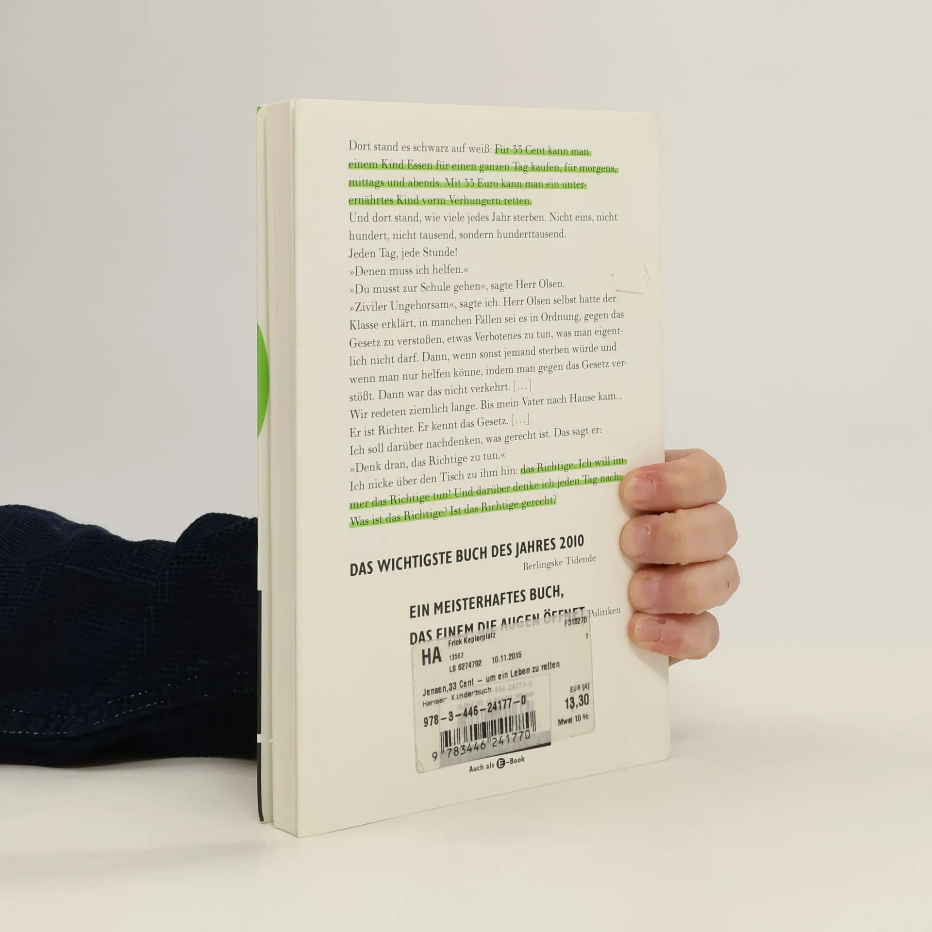Kann ein Einzelner mit Idealismus und Engagement die Armut in der Welt bekämpfen? Als der Erzähler dieser Geschichte erfährt, dass man nur 33 Cent täglich braucht, um das Leben eines afrikanischen Kindes zu retten, beschließt er zu handeln. Er jobbt im Supermarkt, sammelt Spenden und verkauft die Hälfte seiner Sachen. Er will Zivilcourage zeigen. Dafür nimmt er sich - wie Robin Hood - auch von denen, die zu viel haben. Er stiehlt und plündert das Konto seines Vaters. Mit seiner Freundin und einem Kühlwagen voller Lebensmittel bricht er schließlich nach Afrika auf. Doch der naive Glaube an ihre gute Tat führt sie direkt ins Unglück. Ein wichtiges Jugendbuch über Gerechtigkeit und den Mut zu helfen.