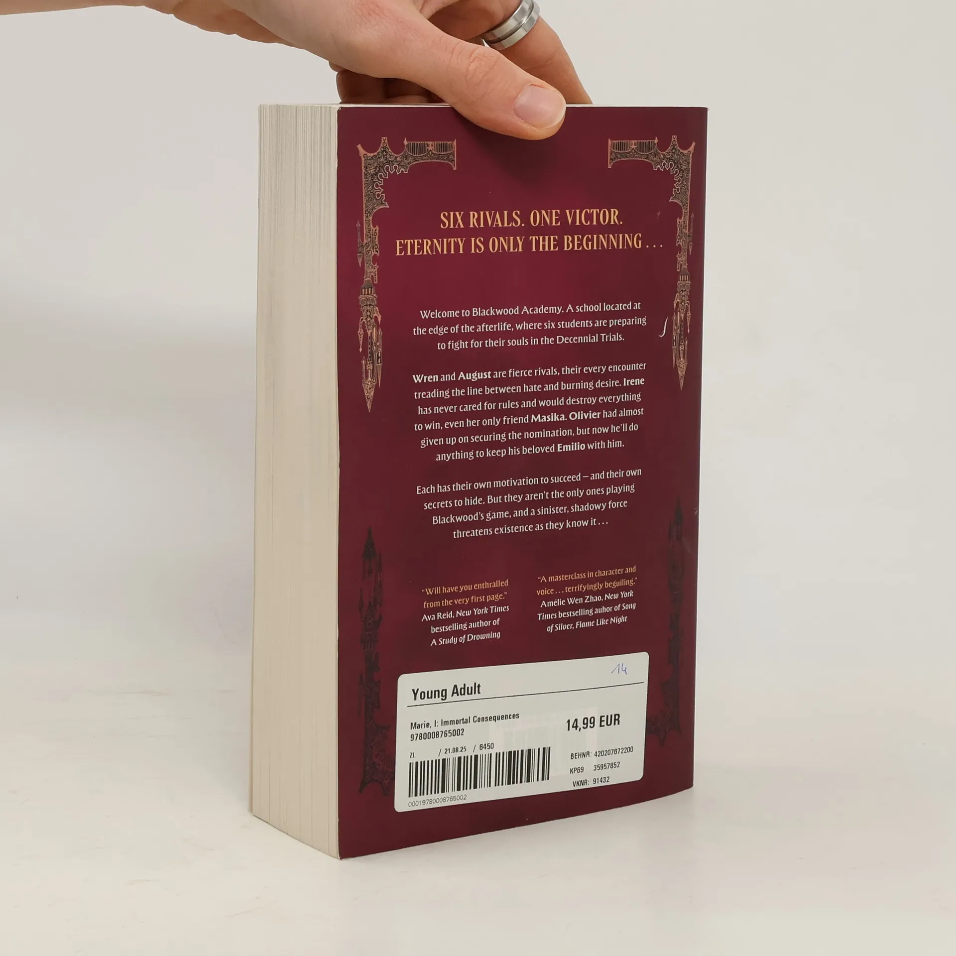 New for 2025, the thrilling dark academia debut novel for young adult readers, set at a magical boarding school in purgatory. For fans of Leigh Bardugo's Ninth House Olivie Blake's The Atlas Six and Naomi Novik's A Deadly Education. Welcome to Blackwood Academy: a boarding school located on the fringes of the afterlife. No one knows why they end up at Blackwood; but when they enter the school's arched gates the only way out is to be chosen for the Decennial - a series of magical trials held once a decade. The chosen pupil is offered a choice: graduate and join Blackwood's magical elite, or venture into the unknown and cross over to the Other Side. Wren knows she has what it takes to win--unless, that is, her arch-rival (and subject of her tortured dreams) Augustine steals her spot. Irene has never cared about playing by the rules and will break whatever (and whoever) stands in her way, including her only friend, Masika. Olivier has given up securing the nomination. But he'll stop at nothing to keep Emilio, from crossing over to the Other Side. All are determined to be Blackwood's chosen candidate. All are determined to win. But this Decennial will be unlike any before. Six nominees. Four trials. One victor. The competitors are about to learn that there are some fates worse than death.