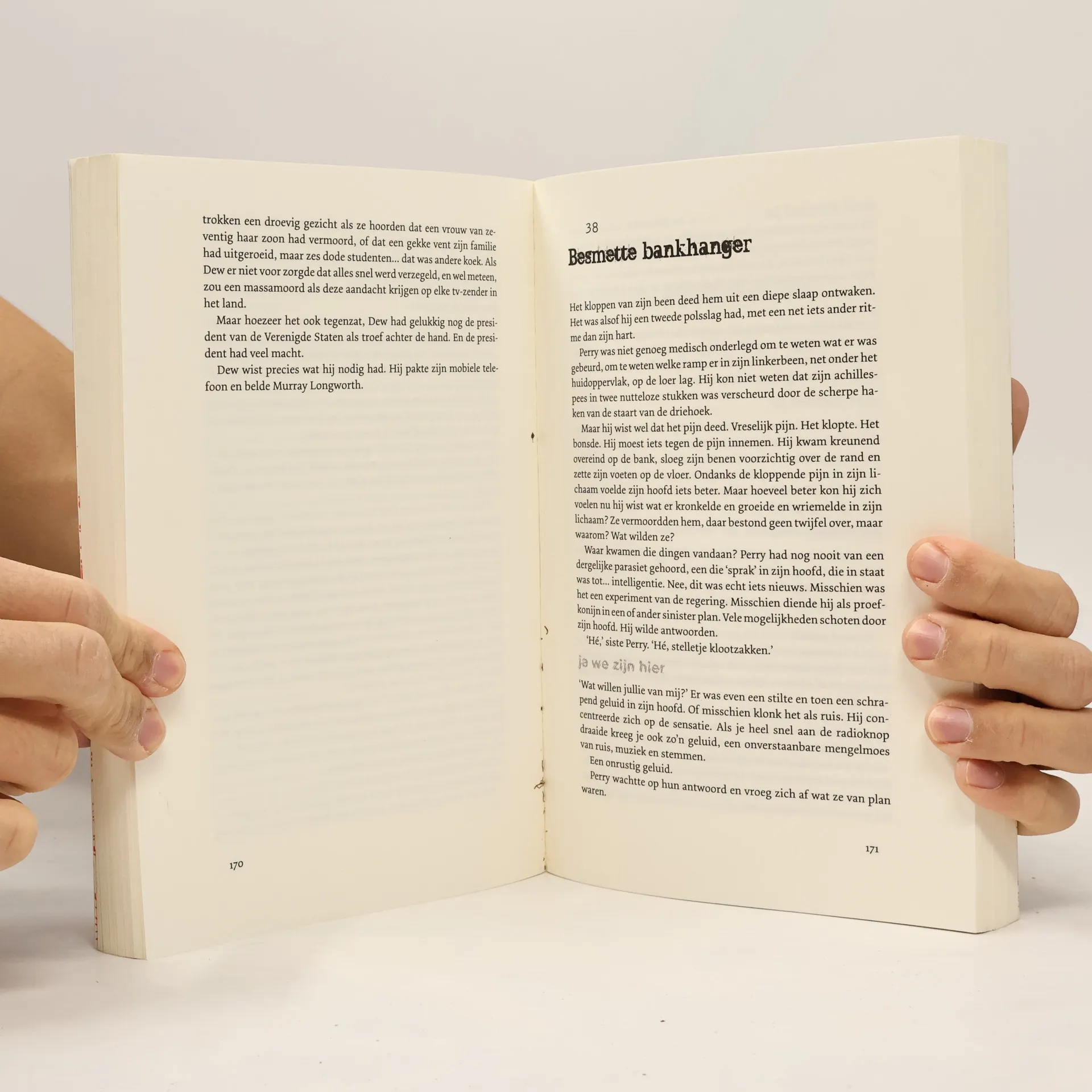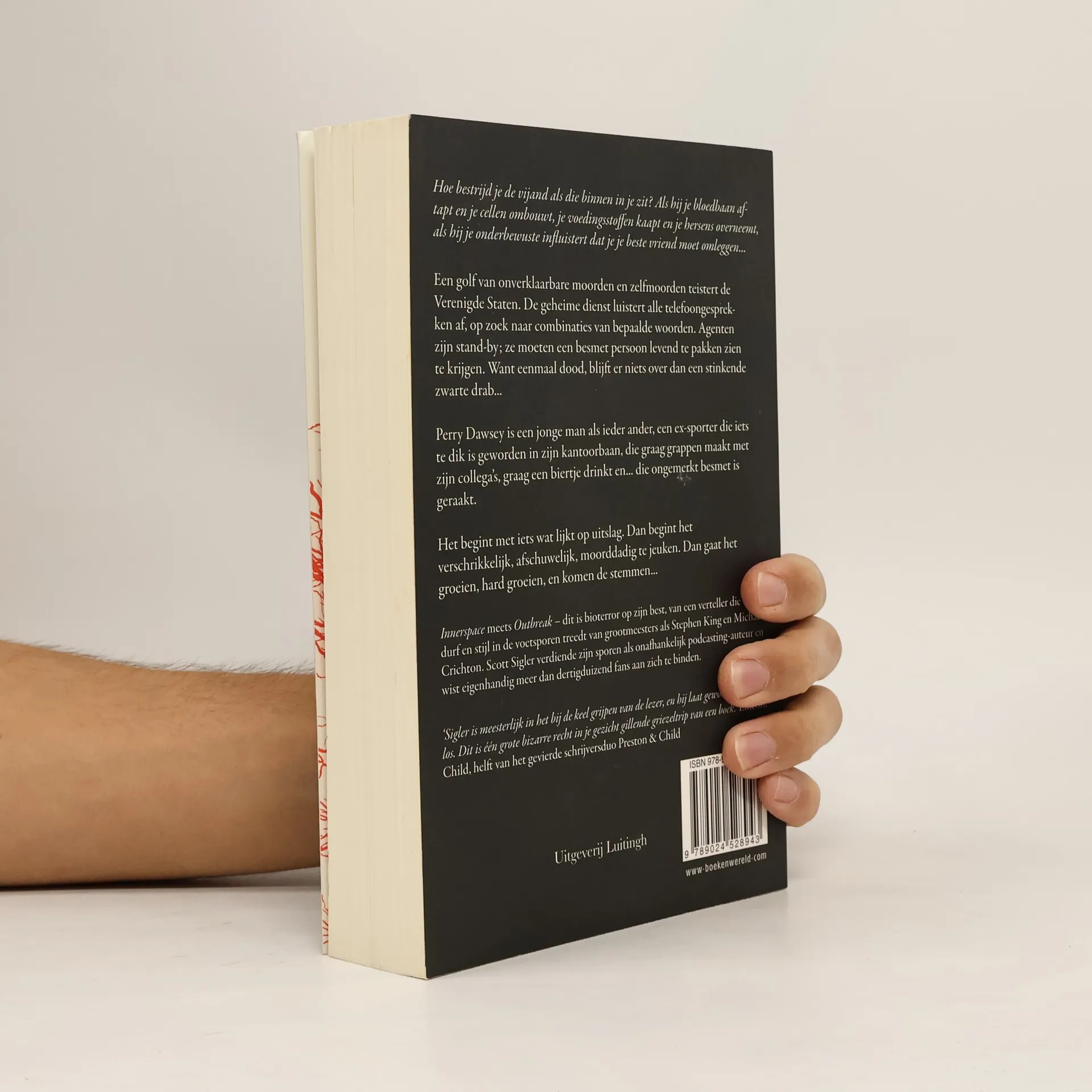Hoe bestrijd je de vijand als die binnen in je zit? Als hij je bloedbaan aftapt en je cellen ombouwt, je voedingsstoffen kaapt en je hersens overneemt, als hij je onderbewuste influistert dat je je beste vriend moet omleggen... Een golf van onverklaarbare moorden en zelfmoorden teistert de Verenigde Staten. De geheime dienst luistert alle telefoongesprekken af, op zoek naar combinaties van bepaalde woorden. Agenten zijn stand-by; ze moeten een besmet persoon levend te pakken zien te krijgen. Want eenmaal dood, blijft er niets over dan een stinkende zwarte drab... Perry Dawsey is een jonge man als ieder ander, en ex-sporter die iets te dik is geworden in zijn kantoorbaan, die graag grappen maakt met zijn collega's, graag een biertje drinkt en... die ongemerkt besmet is geraakt. Het begint met iets wat lijkt op uitslag. Dan begint het verschrikkelijk, afschuwelijk, moorddadig te jeuken. Dan gaat het groeien, hard groeien, en komen de stemmen... Innerspace meets Outbreak – dit is bioterror op zijn best, van een verteller die met durf en stijl in de voetsporen treedt van grootmeesters als Stephen King en Michael Crichton. Scott Sigler verdiende zijn sporen als onafhankelijk podcasting-auteur en wist eigenhandig meer dan dertigduizend fans aan zich te binden.