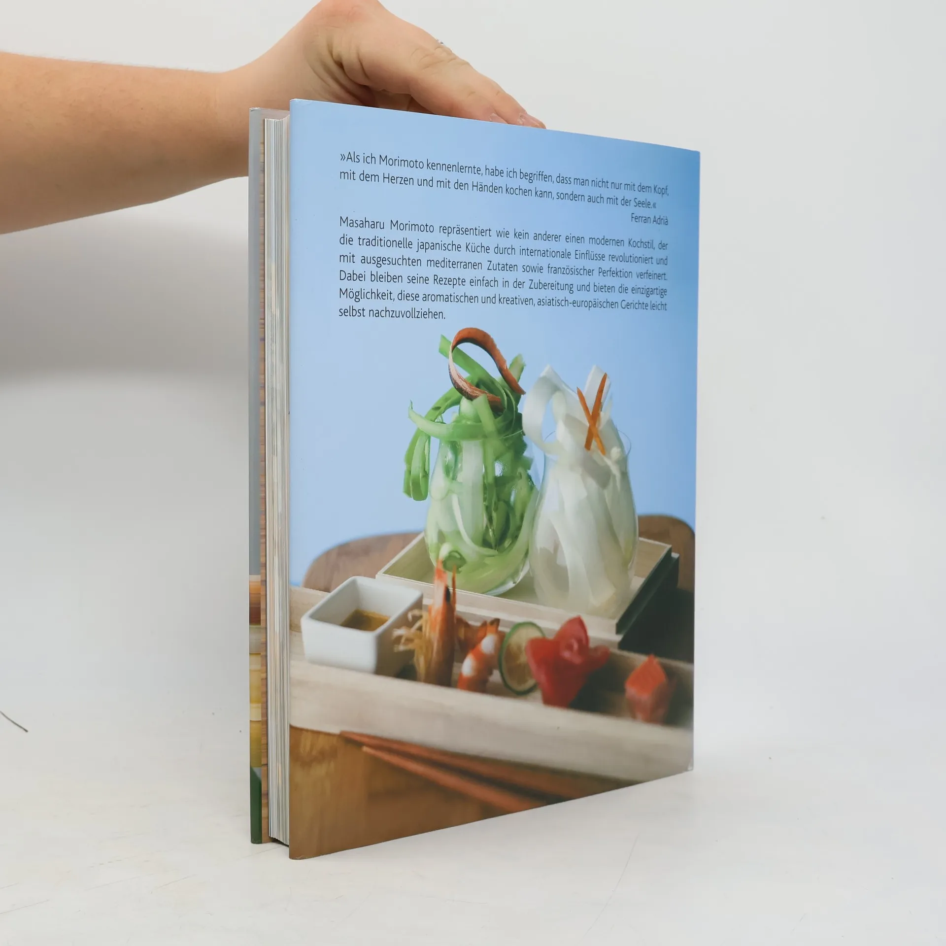 Kein Geringerer als Ferran Adrià, der beste Koch der Welt, hat Masaharu Morimoto, dem wohl bekanntesten Koch aus Japan, den Ritterschlag verliehen. In der Tat vermag Morimoto mit seinen Kochkreationen jeden zu begeistern: Er revolutioniert die japanische Küche mit internationalen Einflüssen, mediterranen Zutaten und französicher Perfektion. Nun gibt es erstmals die Gelegenheit, diese kreativen und innovativen asiatisch-europäischen Gerichte des japanischen Küchengottes selbst nachzukochen. »Als ich Morimoto kennenlernte, habe ich begriffen, dass man nicht nur mit dem Herzen und den Händen kochen kann, sondern auch mit der Seele.« Ferran Adrià