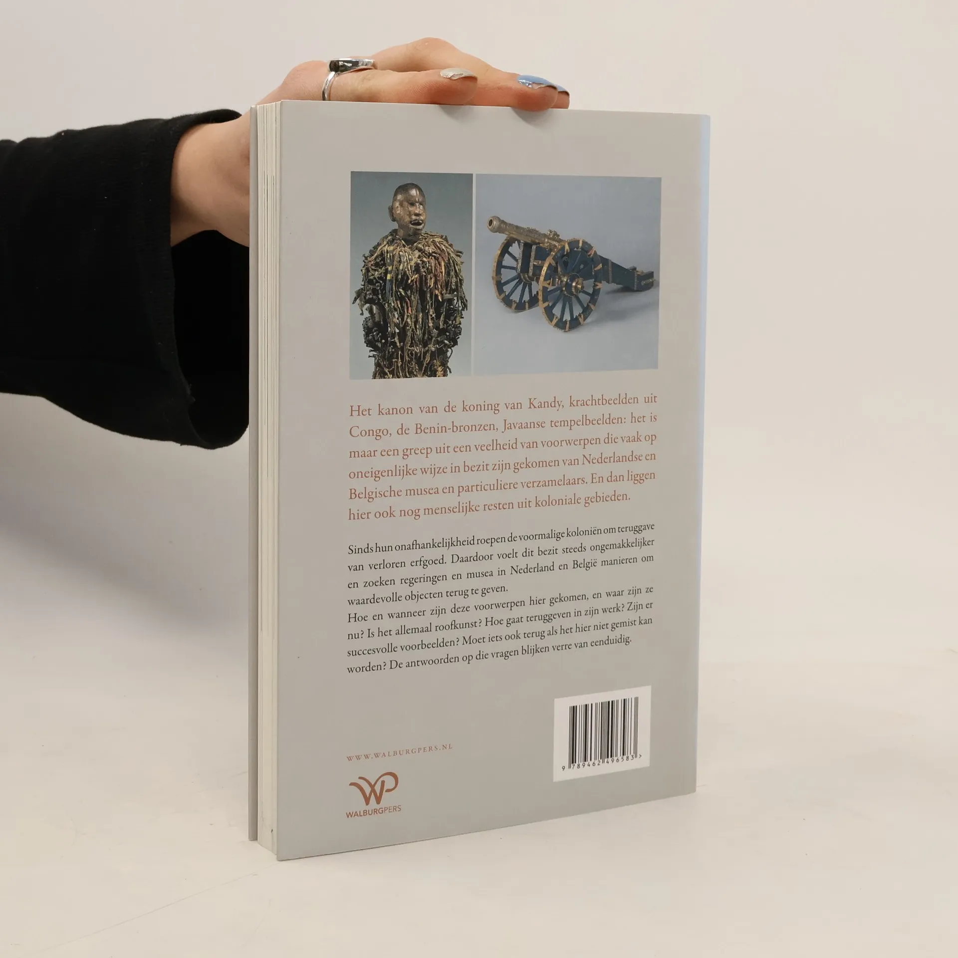 "The Lombok treasure, the cannon of the king of Kandy, a nail statue from Congo, the skull of the Congolese hero Lusinga, the Benin bronzes: these are just a few examples of a wealth of objects that can be found in various ways - often improperly - have come into the possession of Dutch and Belgian museums. And private collections have also been enriched over the centuries with numerous objects from the colonies. These possessions now feel uncomfortable and attempts are being made to return valuable objects. Can museums and private individuals in the Netherlands and Belgium unconcernedly exhibit and keep in possession of (art)historical objects from the former colonies? Belgium and the Netherlands are starting to rub off. Since their independence, the former colonies are calling for the return of lost ones heritage. The Low Countries have given something back in the past, but more often they have ignored the call for it. Governments, museums and private owners in the Netherlands and Belgium now believe that this is no longer sustainable. How and when did those objects get here, and where are they now? Is it all looted art? How does giving back work? Are there successful examples? Should something also be returned, if it cannot be missed here?" "De Lombok-schat, het kanon van de koning van Kandy, een spijkerbeeld uit Congo, de schedel van de Congolese held Lusinga, de Benin-bronzen: het zijn slechts enkele voorbeelden van een schat aan voorwerpen die op allerlei manieren - vaak oneigenlijk - in bezit zijn gekomen van Nederlandse en Belgische musea. En ook particuliere collecties werden in de loop der eeuwen met tal van voorwerpen uit de koloniën verrijkt. Inmiddels voelt dit bezit ongemakkelijk en worden pogingen gedaan waardevolle objecten terug te geven. Kunnen musea en particulieren in Nederland en België (kunst)historische voorwerpen uit de voormalige koloniën onbekommerd tentoonstellen en in bezit houden? Het antwoord op die vraag is niet langer eenduidig. Bevolkingsgroepen op het zuidelijk halfrond voelen nog altijd de pijn van het verlies van waardevolle voorwerpen, terwijl het bezit ervan in België en Nederland begint te schuren. Sinds hun onafhankelijkheid roepen de voormalige koloniën om teruggave van verloren erfgoed. De Lage Landen hebben in het verleden weleens iets teruggegeven, maar vaker de roep erom genegeerd. Dat is niet langer vol te houden, vinden nu ook regeringen, musea en particuliere bezitters in Nederland en België. Hoe en wanneer zijn die voorwerpen hier gekomen, en waar zijn ze nu? Is het allemaal roofkunst? Hoe gaat teruggeven in zijn werk? Zijn er succesvolle voorbeelden? Moet iets ook terug, als het hier niet gemist kan worden?"