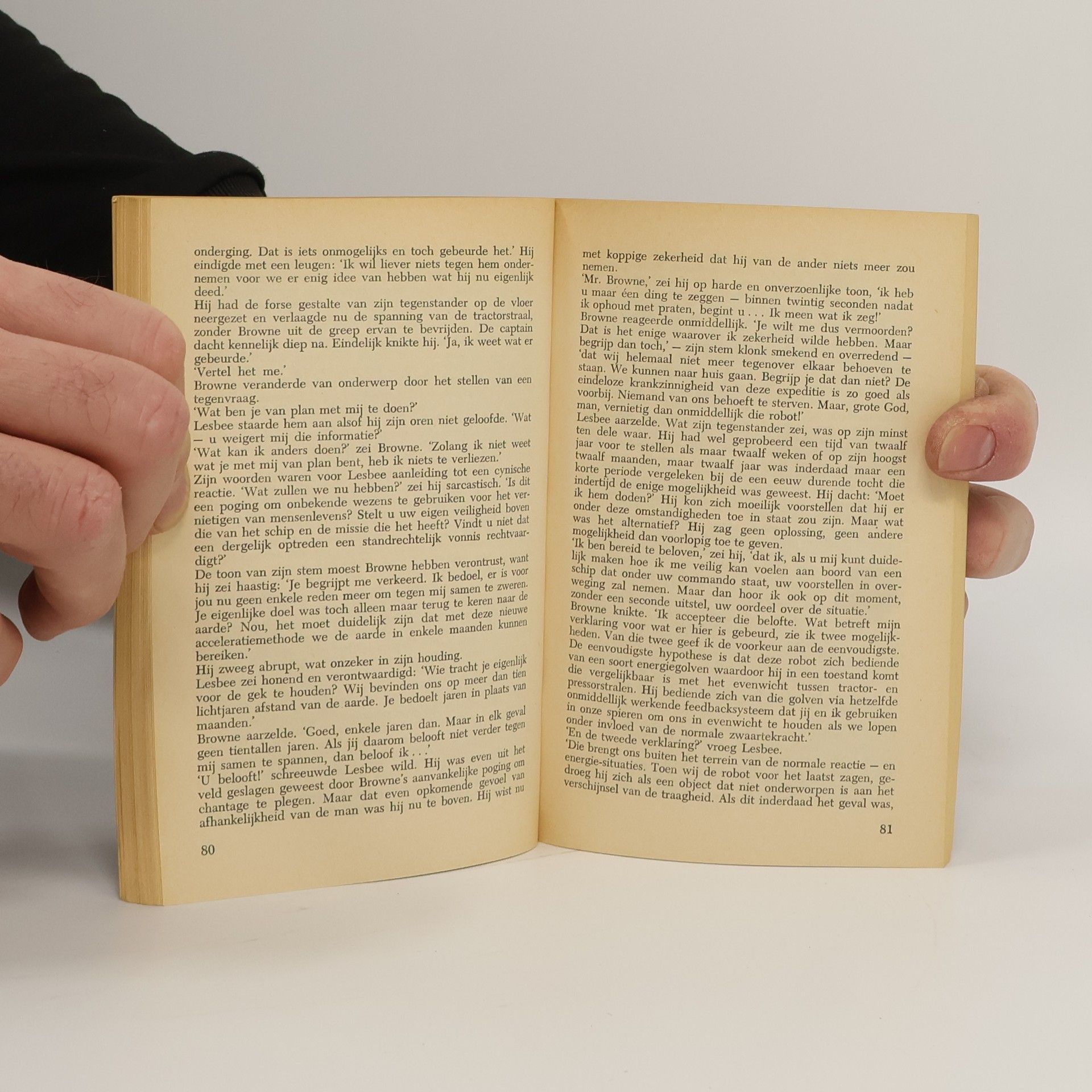 De jonge Lesbee zag Ganarette kijken naar de klok op het instrumentenpaneel. 'Ik heb je iets te zeggen, John,' zei hij. 'En het lijkt me het beste om dat nu te doen. Vijf minuten na het begin van de film neemt mijn groep de leiding van dit schip over. Het is onze bedoeling jou het commando te geven - maar alleen onder voorwaarde dat je je bereid verklaart terug te keren naar de aarde. Wij willen de oude knarren geen kwaad doen - als ze zich behoorlijk gedragen. Wat jou betreft - als je probeert iemand te waarschuwen, zullen we ons plan om jou kapitein te maken, opnieuw moeten bezien ...' Het aardse ruimteschip Hope of Man, al meer dan twintig jaar onderweg, heeft nog negen jaar voor de boeg voordat het Centaurus bereikt. Velen aan boord vinden het nu welletjes, maar voor de oude kapitein Lesbee is er al lang geen terug meer als de rebellen zich tegen hem keren ..