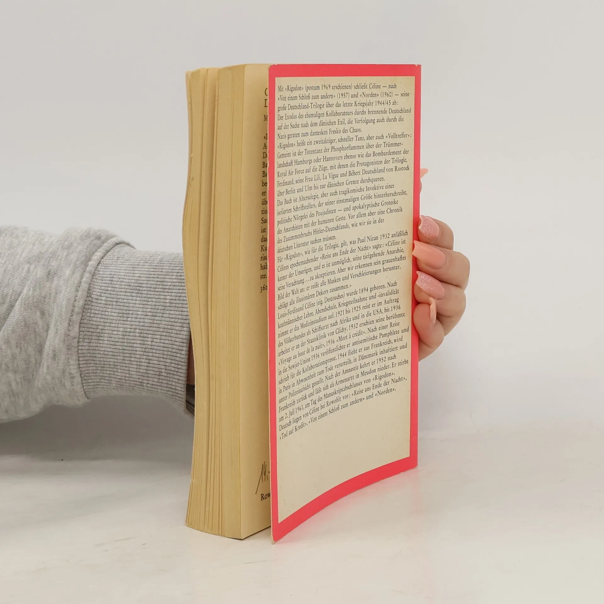 Mit "Rigodon" (postum 1969 erschienen) schließt Céline - nach "Von einem Schloß zum andern" (1957) und "Norden" (1960) - seine große Deutschland-Trilogie über das letzte Kriegsjahr 1944/45 ab: Der Exodus des ehemaligen Kollaborateurs durchs brennende Deutschland auf der Suche nach dem dänischen Exil, die Verfolgung auch durch die Nazis geraten zum dantesken Fresko des Chaos.