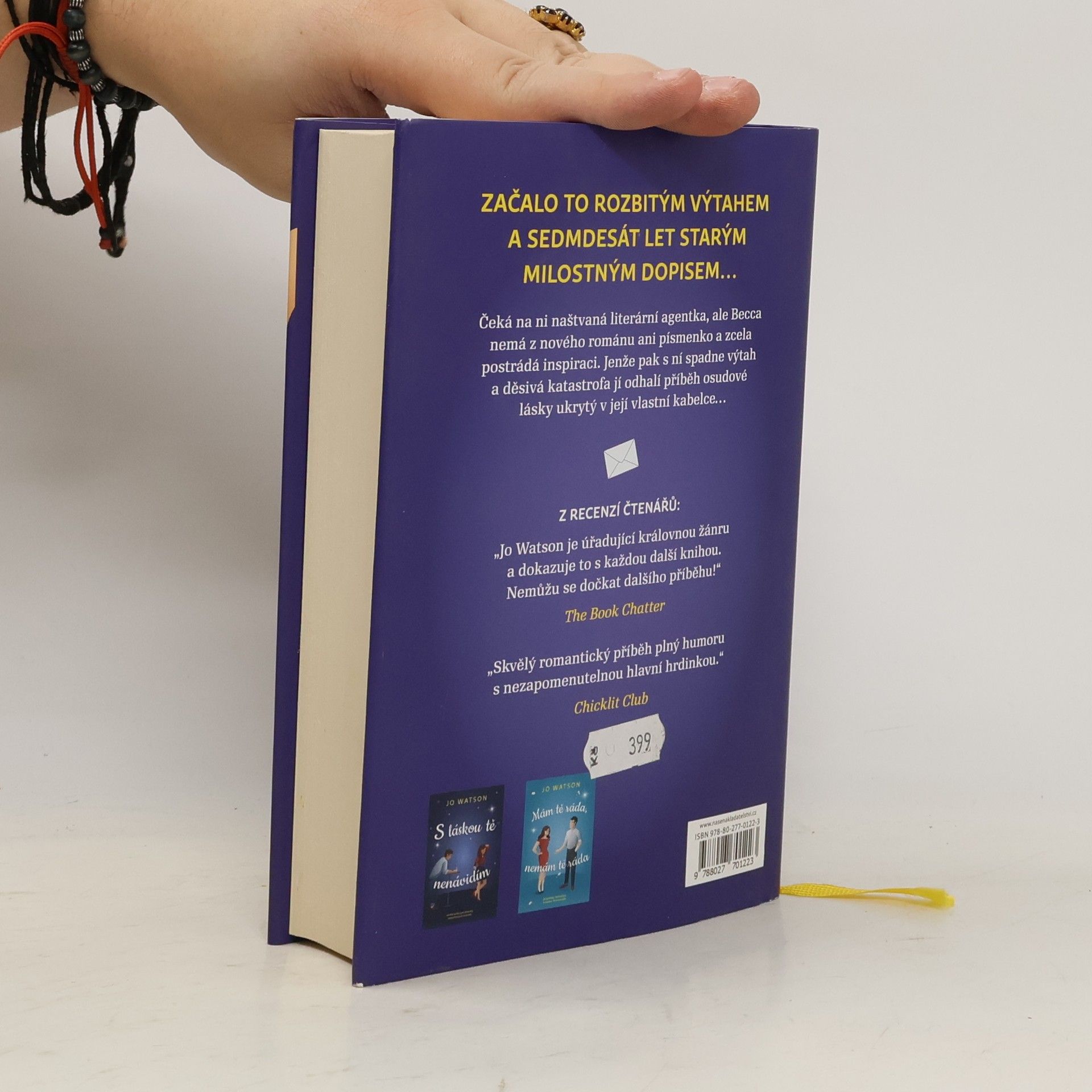 Všechno to začalo v rozbitém výtahu. A také jedním milostným dopisem... Spisovatelka Becca Thorneová potřebuje nápad – a to rychle! Má sice na kontě úspěšný bestseller, ale teď se blíží termín, kdy má odevzdat druhou knihu. Becca má strach, že přijde o kariéru, na které jí tolik záleží. Jenže osud s ní má jiné plány a Becca málem zahyne se dvěma dalšími ženami v rozbitém výtahu. I když se z něj vynoří celá, o její milované staré kabelce se to říct nedá a Becca zjistí, že inspiraci si nosila celou tu dobu s sebou. V roztržené podšívce kabelky totiž objeví štos nádherných milostných dopisů. Becca je sice nenapsala, ale nemůže ta romantická slova dostat z hlavy a cítí nutkání vypátrat, kdo je jejich autorem. Možná na ni však čeká víc než jen románek z dávných časů… Možná dostane šanci prožít svůj vlastní milostný příběh a vydat se na cestu, kterou pro ni osud zamýšlel. Nenechte si ujít ani další knihy Jo Watson, při nichž se budete smát nahlas: Mám tě ráda, nemám tě ráda, S láskou tě nenávidím, Svatba naoko nebo Hořící měsíc.