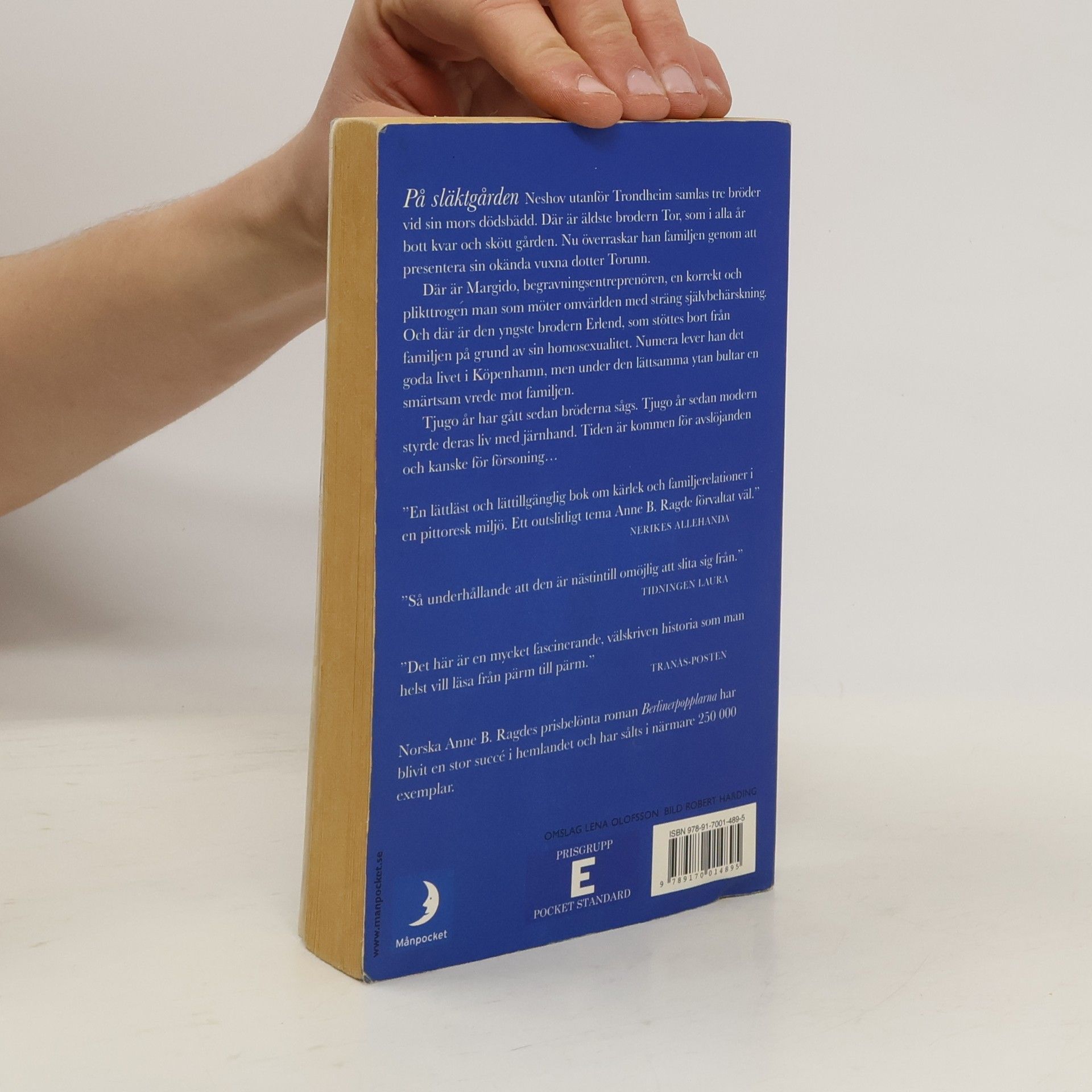 På släktgården Neshov utanför Trondheim samlas tre bröder vid sin mors dödsbädd. Där är äldre brodern Tor, som i alla år bott kvar och skött gården. Nu överraskar han familjen genom att presentera sin okända vuxna dotter Torunn. Där är Margido, begravningsenterprenören, en korrekt och plikttrogen man som möter omvärlden med sträng självbehärskning. Och där är den yngste brodern Erlend, som stöttes bort från familjen på grund av sin homosexualitet. Numera lever han det goda livet i Köpenhamn, men under den lättsamma ytan bultar en smärtsam vrede mot familjen. Tjugo år har gått sedan bröderna sågs. Tjugo år sedan mor styrdes deras liv med järnhand. Tiden är kommen för avslöjanden och kanske för försoning... "En lättläst och lättillgänglig bok om kärlek och familjerelationer i en pitoresk miljö. Ett outslitligt tema Anne B. Ragde förvaltat väl." - NERIKES ALLEHANDA "Så underhållande att den är nästintill omöjlig att slita sig från." - TIDNINGEN LAURA "Det här är en mycket fascinerande, välskriven historia som man helst vill läsa från pärm till pärm." - TRANÅS-POSTEN Norska Anne B. Ragdes prisbelönta roman "Berlinerpopplarna" har blivit en stor succé i hemlandet och har sålts i närmare 250 000 exemplar.