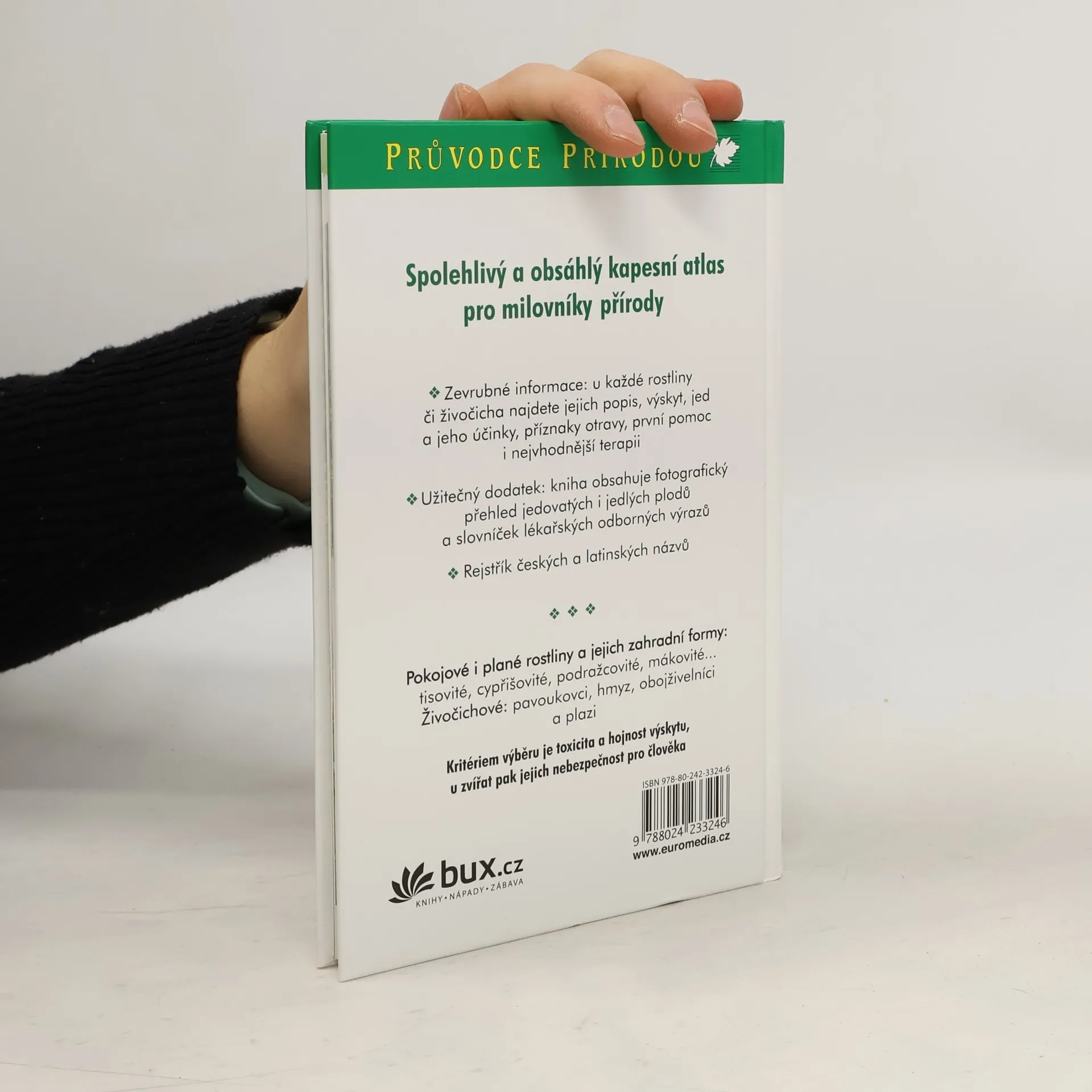 Pokojové i plané rostliny a jejich zahradní formy: tisovité, cypřišovité, podražcovité, pryskyřníkovité, mákovité, bukovité, silenkovité, brukvovité... Živočichové: pavoukovci, hmyz, obojživelníci a plazi... Zevrubné informace: u každé rostliny či živočicha najdete jejich popis, výskyt, jed a jeho účinky, příznaky otravy, první pomoc i nejvhodnější terapii Užitečný dodatek: kniha obsahuje fotografický přehled jedovatých i jedlých plodů, seznam nejedovatých stromů a keřů vhodných k výsadbě a slovníček lékařských odborných výrazů. Rejstříky latinských i českých názvů.