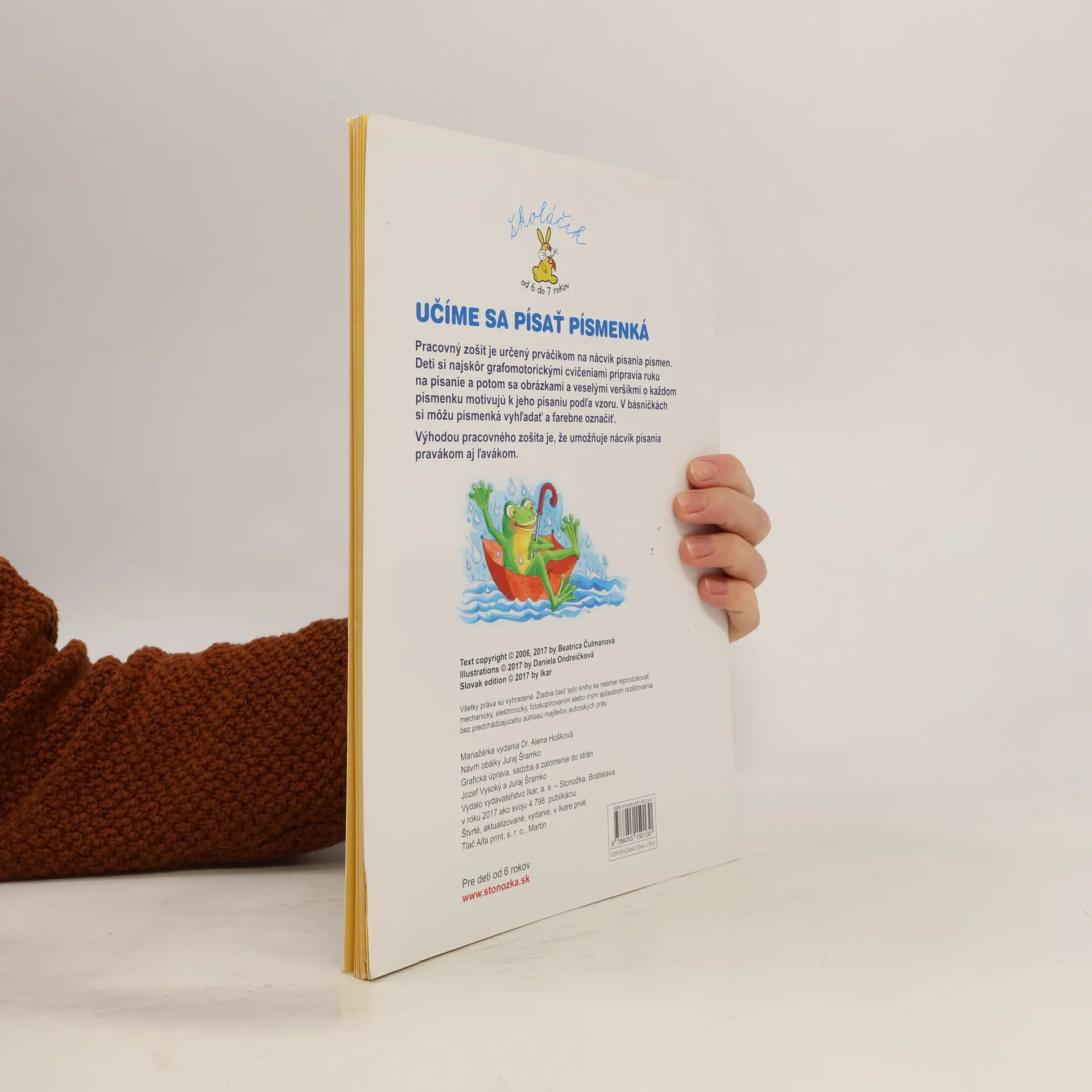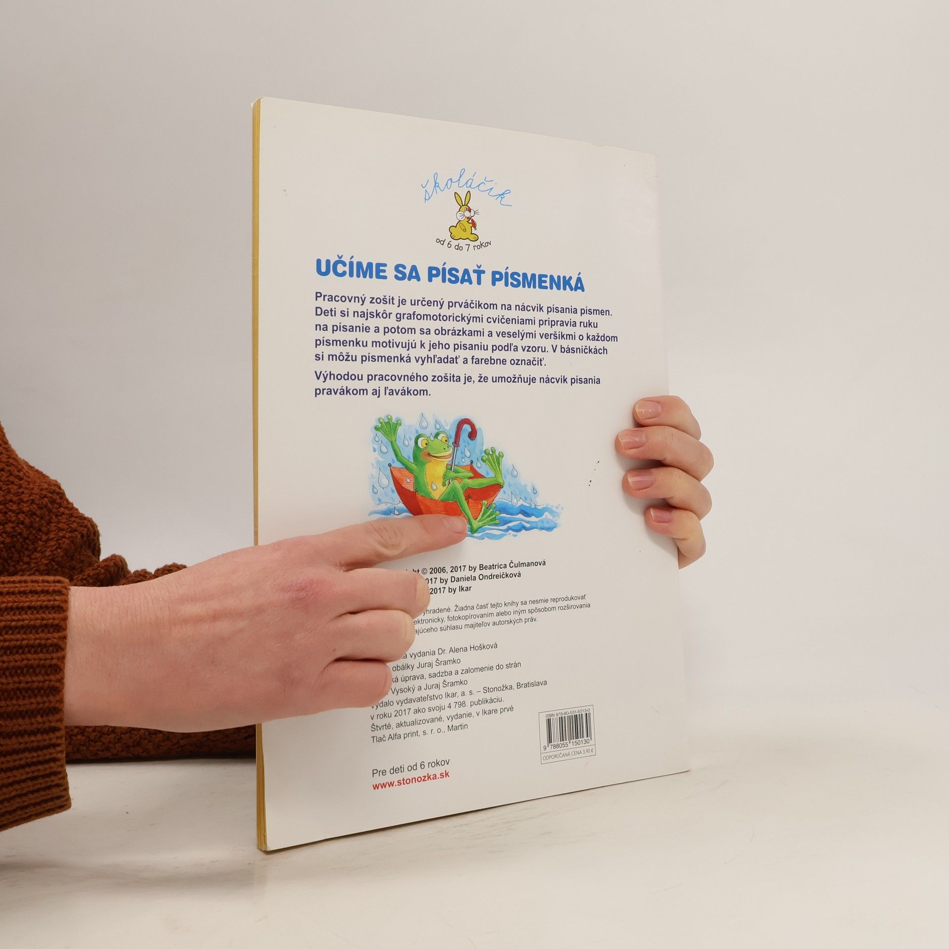 Pracovný zošit je určený prváčikom na nácvik písania písmen. Deti si najskôr grafomotorickými cvičeniami pripravia ruku na písanie a potom sa veselými obrázkami a veršíkmi o každom písmenku motivujú k jeho písaniu podľa vyznačeného vzoru. V básničkách si môžu písmenká vyhľadať a farebne vyznačiť. Výhodou pracovného zošita je, že umožňuje nácvik písania pravákom aj ľavákom. Ilustrovala Daniela Ondreičková.