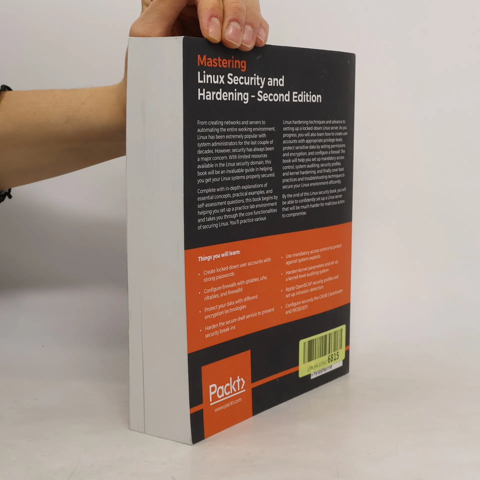 A comprehensive guide to securing your Linux system against cyberattacks and intruders Key Features Deliver a system that reduces the risk of being hacked Explore a variety of advanced Linux security techniques with the help of hands-on labs Master the art of securing a Linux environment with this end-to-end practical guide Book Description From creating networks and servers to automating the entire working environment, Linux has been extremely popular with system administrators for the last couple of decades. However, security has always been a major concern. With limited resources available in the Linux security domain, this book will be an invaluable guide in helping you get your Linux systems properly secured. Complete with in-depth explanations of essential concepts, practical examples, and self-assessment questions, this book begins by helping you set up a practice lab environment and takes you through the core functionalities of securing Linux. You'll practice various Linux hardening techniques and advance to setting up a locked-down Linux server. As you progress, you will also learn how to create user accounts with appropriate privilege levels, protect sensitive data by setting permissions and encryption, and configure a firewall. The book will help you set up mandatory access control, system auditing, security profiles, and kernel hardening, and finally cover best practices and troubleshooting techniques to secure your Linux environment efficiently. By the end of this Linux security book, you will be able to confidently set up a Linux server that will be much harder for malicious actors to compromise. What you will learn Create locked-down user accounts with strong passwords Configure firewalls with iptables, UFW, nftables, and firewalld Protect your data with different encryption technologies Harden the secure shell service to prevent security break-ins Use mandatory access control to protect against system exploits Harden kernel parameters and set up a kernel-level auditing system Apply OpenSCAP security profiles and set up intrusion detection Configure securely the GRUB 2 bootloader and BIOS/UEFI Who this book is for This book is for Linux administrators, system administrators, and network engineers interested in securing moderate to complex Linux environments. Security consultants looking to enhance their Linux security skills will also find this book useful. Working experience with the Linux command line and package management is necessary to understand the concepts covered in this book.