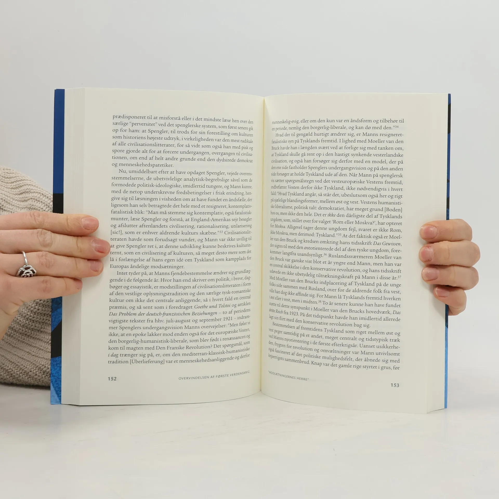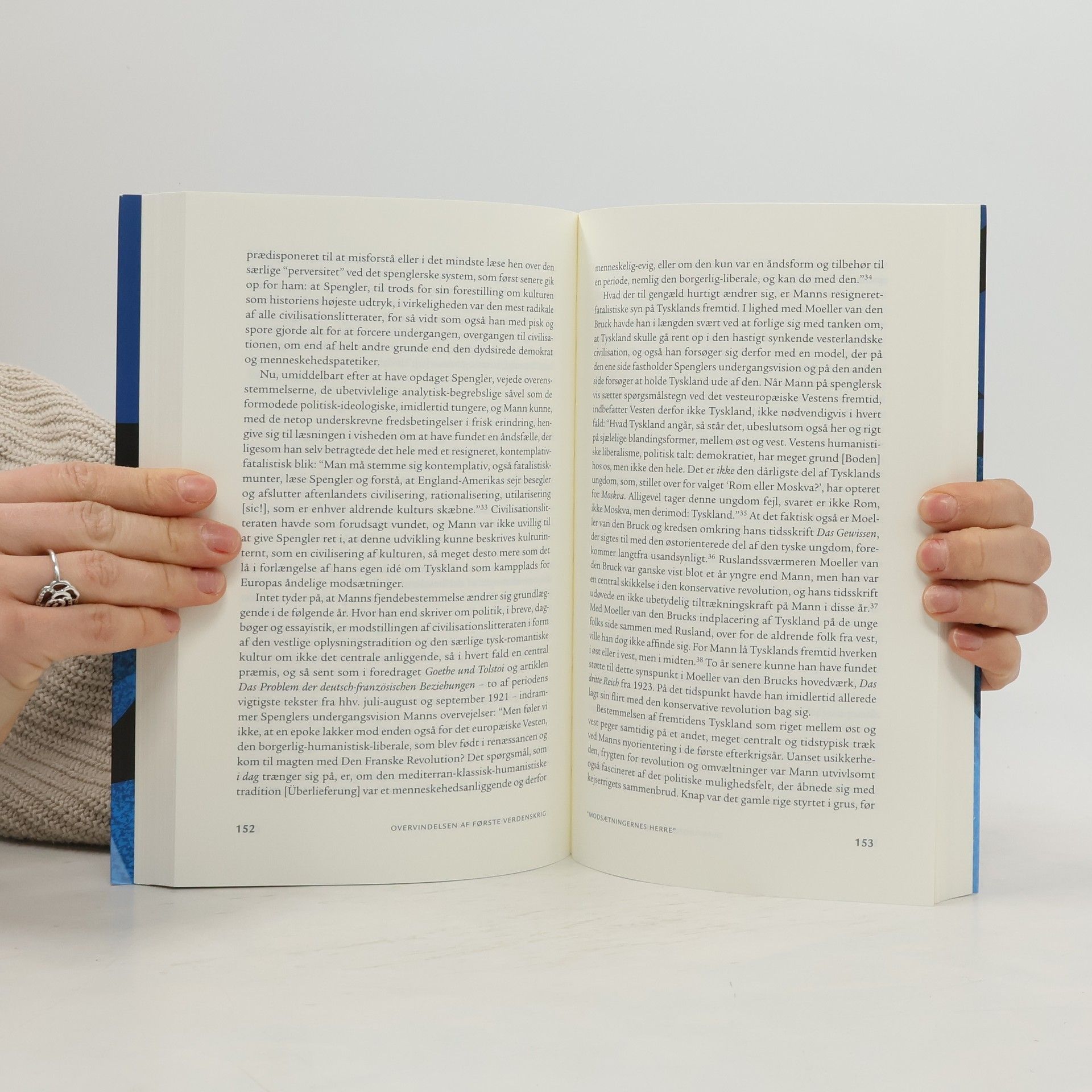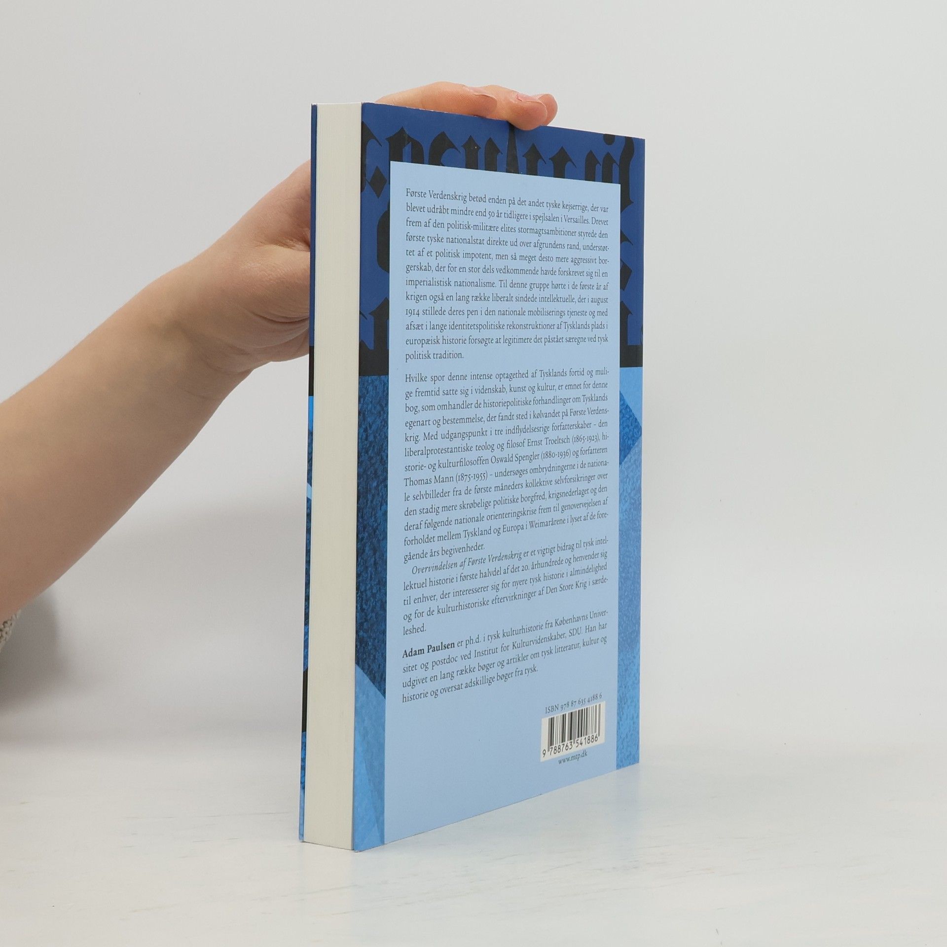 Første Verdenskrig betød enden på det andet tyske kejserrige, der var blevet udråbt mindre end 50 år tidligere i spejlsalen i Versailles. Drevet frem af den politisk-militære elites stormagtsambitioner styrede den første tyske nationalstat direkte ud over afgrundens rand, understøttet af et politisk impotent, men så meget desto mere aggressivt borgerskab, der for en stor dels vedkommende havde forskrevet sig til en imperialistisk nationalisme. Til denne gruppe hørte i de første år af krigen også en lang række liberalt sindede intellektuelle, der i august 1914 stillede deres pen i den nationale mobiliserings tjeneste og med afsæt i lange identitetspolitiske rekonstruktioner af Tysklands plads i europæisk historie forsøgte at legitimere det påstået særegne ved tysk politisk tradition. Hvilke spor denne intense optagethed af Tysklands fortid og mulige fremtid satte sig i videnskab, kunst og kultur, er emnet for denne bog, som omhandler de historiepolitiske forhandlinger om Tysklands egenart og bestemmelse, der fandt sted i kølvandet på Første Verdenskrig. Med udgangspunkt i tre indflydelsesrige forfatterskaber – den liberalprotestantiske teolog og filosof Ernst Troeltsch (1865-1923), historie- og kulturfilosoffen Oswald Spengler (1880-1936) og forfatteren Thomas Mann (1875-1955) – undersøges ombrydningerne i de nationale selvbilleder fra de første måneders kollektive selvforsikringer over den stadig mere skrøbelige politiske borgfred, krigsnederlaget og den deraf følgende nationale orienteringskrise frem til genovervejelsen af forholdet mellem Tyskland og Europa i Weimarårene i lyset af de foregående års begivenheder. Overvindelsen af Første Verdenskrig er et vigtigt bidrag til tysk intellektuel historie i første halvdel af det 20. århundrede og henvender sig til enhver, der interesserer sig for nyere tysk historie i almindelighed og for de kulturhistoriske eftervirkninger af Den Store Krig i særdeleshed.