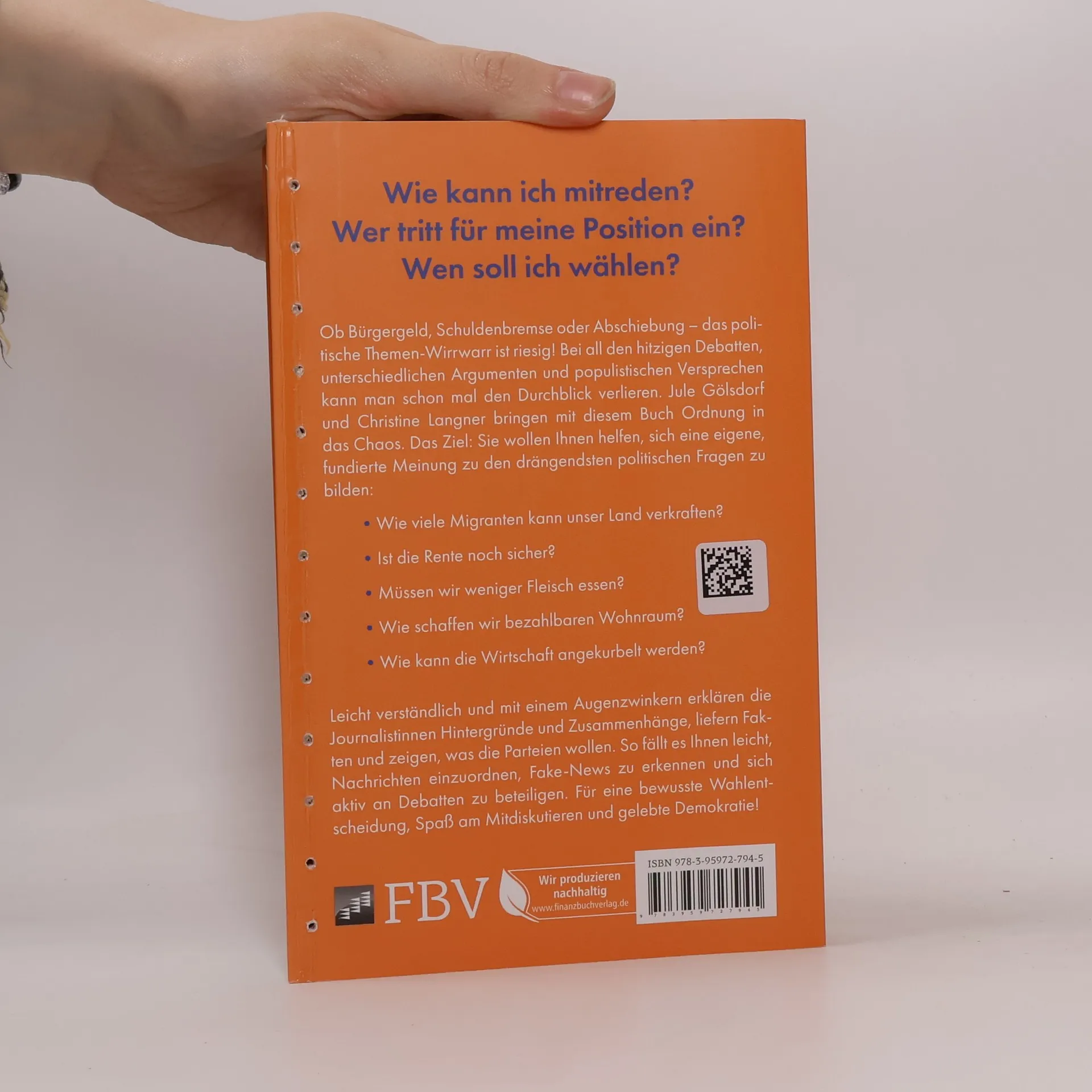 Wie kann ich mitreden? Wer tritt für meine Positionen ein? Wen soll ich wählen? Ob Bürgergeld, Schuldenbremse oder Haushaltsstreit – das politische Themen-Wirrwarr ist riesig. Bei all den hitzigen Debatten, unterschiedlichen Argumenten und populistischen Versprechen kann man schon mal den Durchblick verlieren. Jule Gölsdorf und Christine Langner bringen mit diesem Buch Ordnung in das Chaos. Das Ziel: Sie wollen Ihnen helfen, sich eine eigene, fundierte Meinung zu den drängendsten politischen Fragen zu bilden. - Wie viele Migranten kann unser Land verkraften? - Ist die Rente noch sicher? - Müssen wir weniger Fleisch essen? - Wie schaffen wir bezahlbaren Wohnraum? - Wie kann die Wirtschaft wieder angekurbelt werden? Leicht verständlich und mit einem Augenzwinkern erklären die Journalistinnen Hintergründe und Zusammenhänge, liefern Fakten und zeigen, was die Parteien wollen. So fällt es Ihnen leicht, Nachrichten einzuordnen, Fake-News zu erkennen und sich aktiv an Debatten zu beteiligen. Für eine bewusste Wahlentscheidung, Spaß am Mitdiskutieren und gelebte Demokratie!