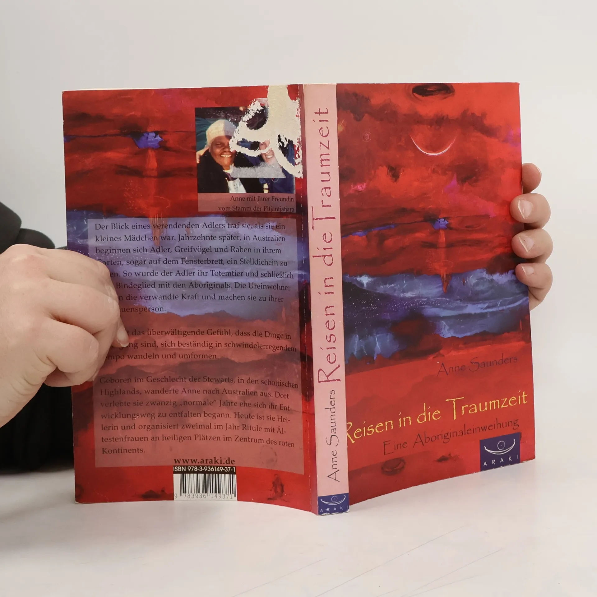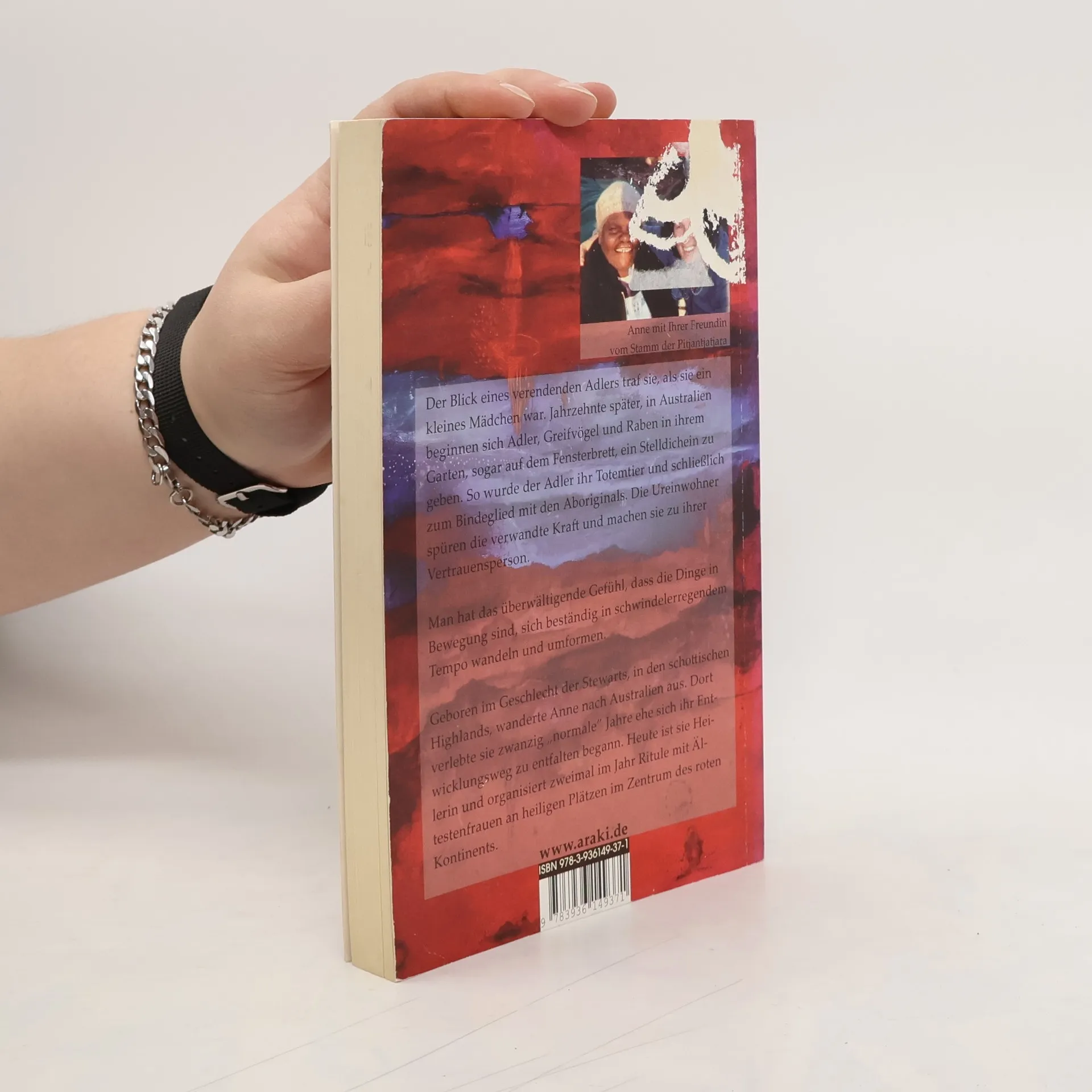 Anne ist eine der ersten weißen Vertrauenspersonen der Eingeborenen Australiens. In diesen von Aboriginals und Maoris ausdrücklich genehmigten Reportagen beschreibt sie ihre inneren und äußeren Reisen in der Terra Australis. Die gebürtige Schottin lebte schon einige Jahre in New South Wales, hatte Erfahrung mit verschiedenen heilerischen Methoden und sich die Landschaften erwandert. Schon als Kind hatte sie ein Erlebnis mit einem Adler und nun begannen Adler und Eulen in ihrem Garten, ja sogar am Küchenfenster mit ihr Kontakt aufzunehmen. Damit begann sie sich für die Aboriginals zu öffnen, deren Ahnen sich dieser Totem-Tiere bedienen. Eine weitere Station waren die Höhlen von Glastonbell in den Blue Mountains. Sie realisierte ihre Berufung die ein alter indianischer Medizinmann viele Jahre vorher mit ihrem Namen verliehen hatte: Graues-Pferd-zwischen-Nationen-wandernder-Friedebringer. Sie ist in die Organisation eines großen Treffens der ältesten Stammesmütter am Uluru involviert. Über den Araki Verlag können interessierte Frauen Kontakt mit ihr aufnehmen.