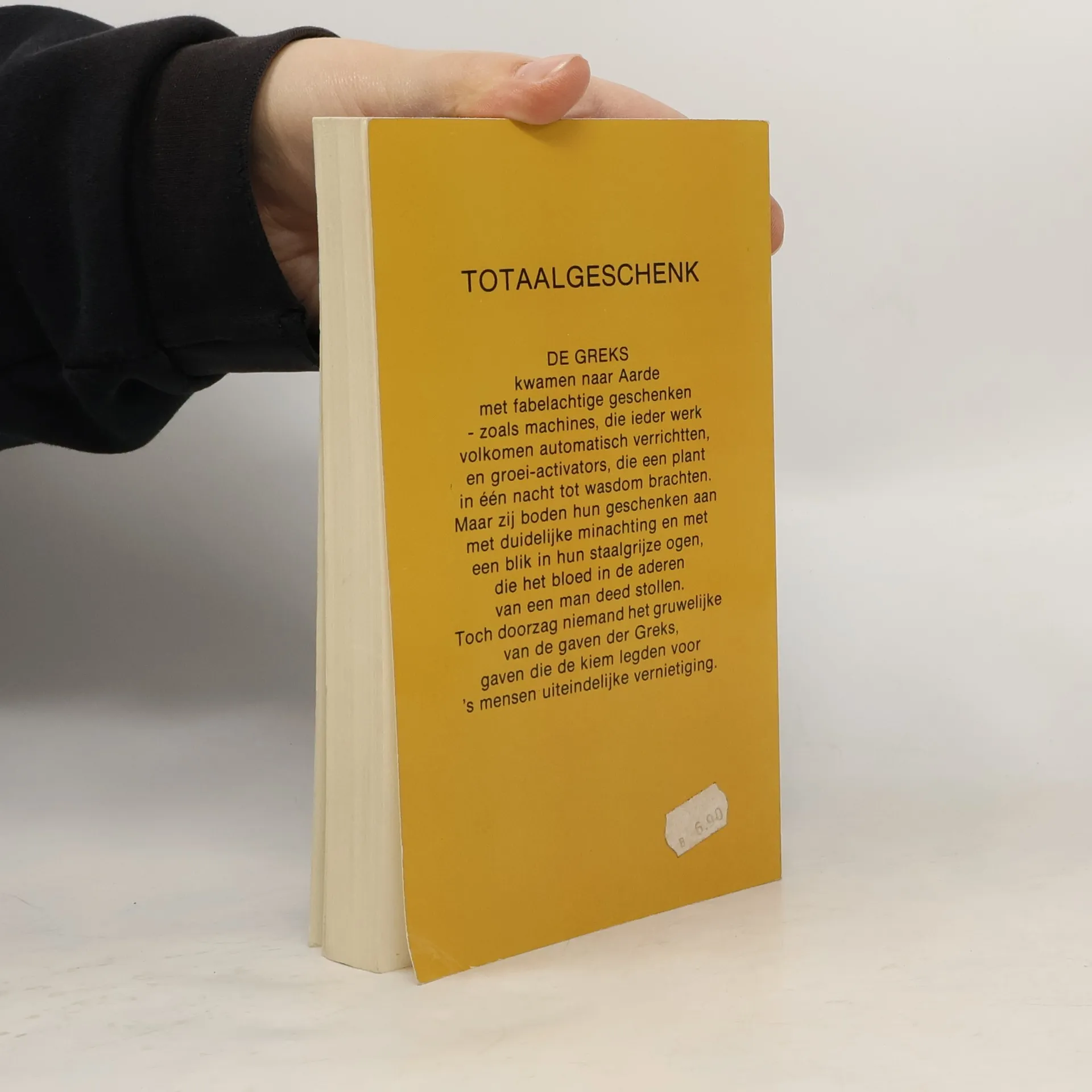 De Greks kwamen naar Aarde met fabelachtige geschenken - zoals machines, die ieder werk volkomen automatisch verrichtten, en groei-activators, die een plant in één nacht tot wasdom brachten. Maar zij boden hun geschenken aan met duidelijke minachting en met een blik in hun staalgrijze ogen, die het bloed in de aderen van een man deed stollen. Toch doorzag niemand het gruwelijke van de gaven der Greks, gaven die de kiem legden voor 's mensen uiteindelijke vernietiging.