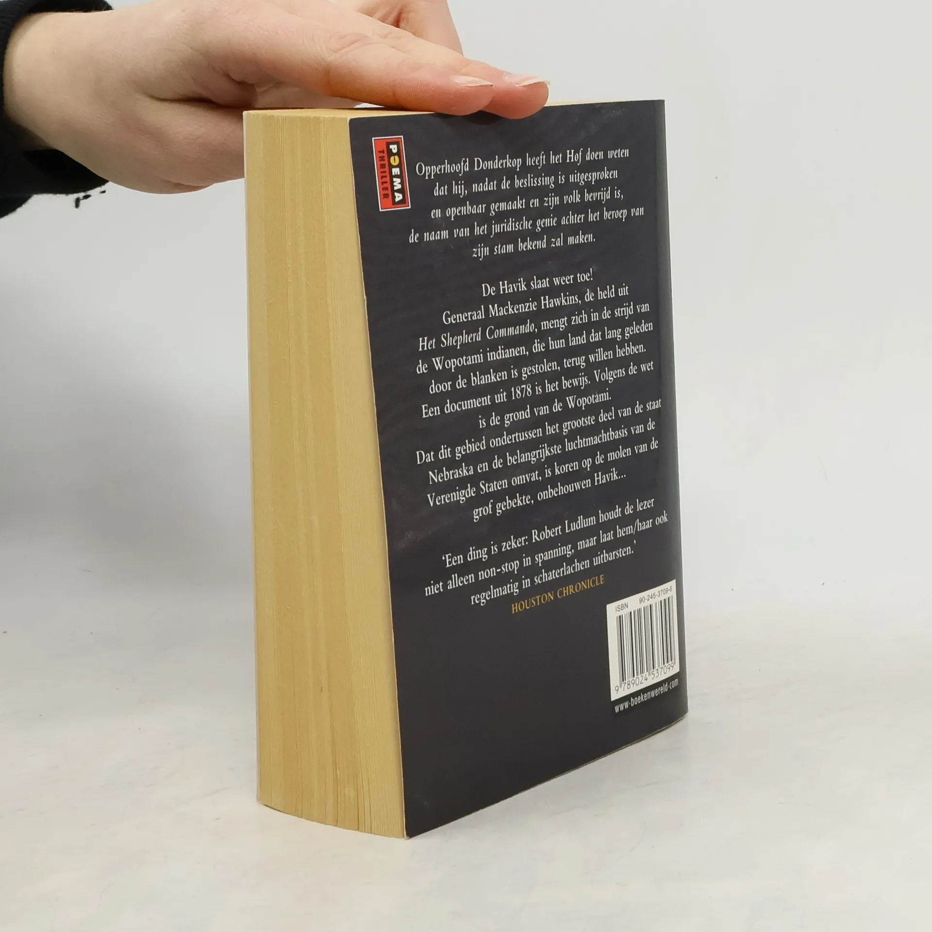 'Opperhoofd Donderkop heeft het hof doen weten dat hij, nadat de beslissing is uitgesproken en openbaar gemaakt en zijn volk bevrijd is, de naam van het juridisch genie achter het beroep van zijn stam bekend zal maken.' Dé Havik slaat weer toe! Generaal Mackenzie -Het Shepherd Commando - Hawkins mengt zich in de strijd van de Wopotami indianen, die hun land - lang geleden gestolen door de blanken - terug willen hebben. -Een document uit 1878 is het bewijs: volgens de wet is de grond van de Wopotami. Dat dit gebied de staat Omaha en de belangrijkste luchtmachtbasis van de Verenigde Staten omvat, is koren op de molen van de grofgebekte, onbehouwen Havik...
