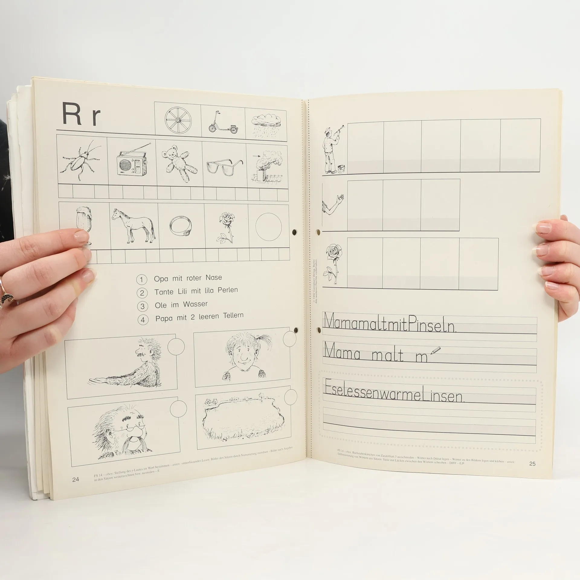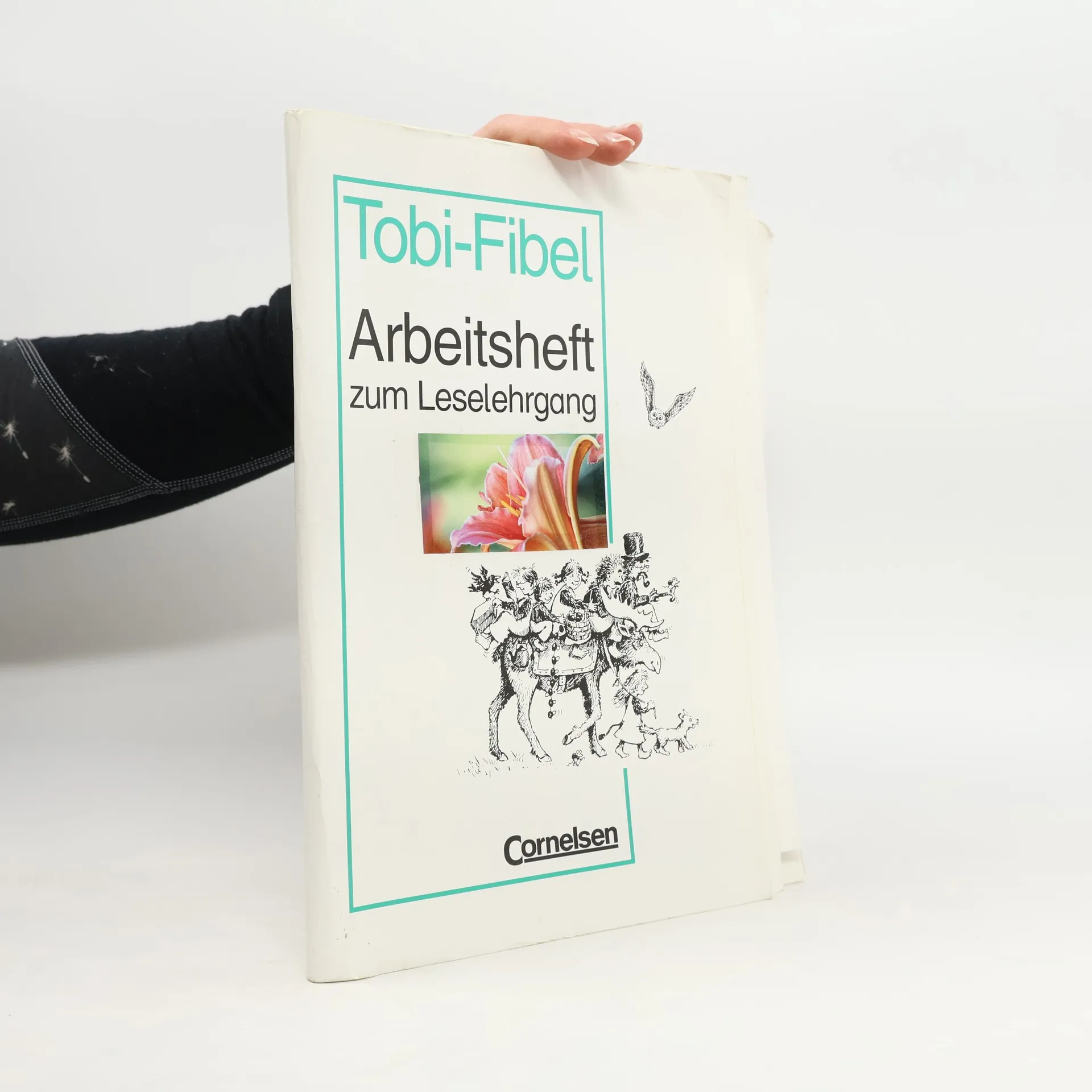 Workbook teaching phonics (letters and dipthongs) using illustrations and themes from the Tobi-Fibel.