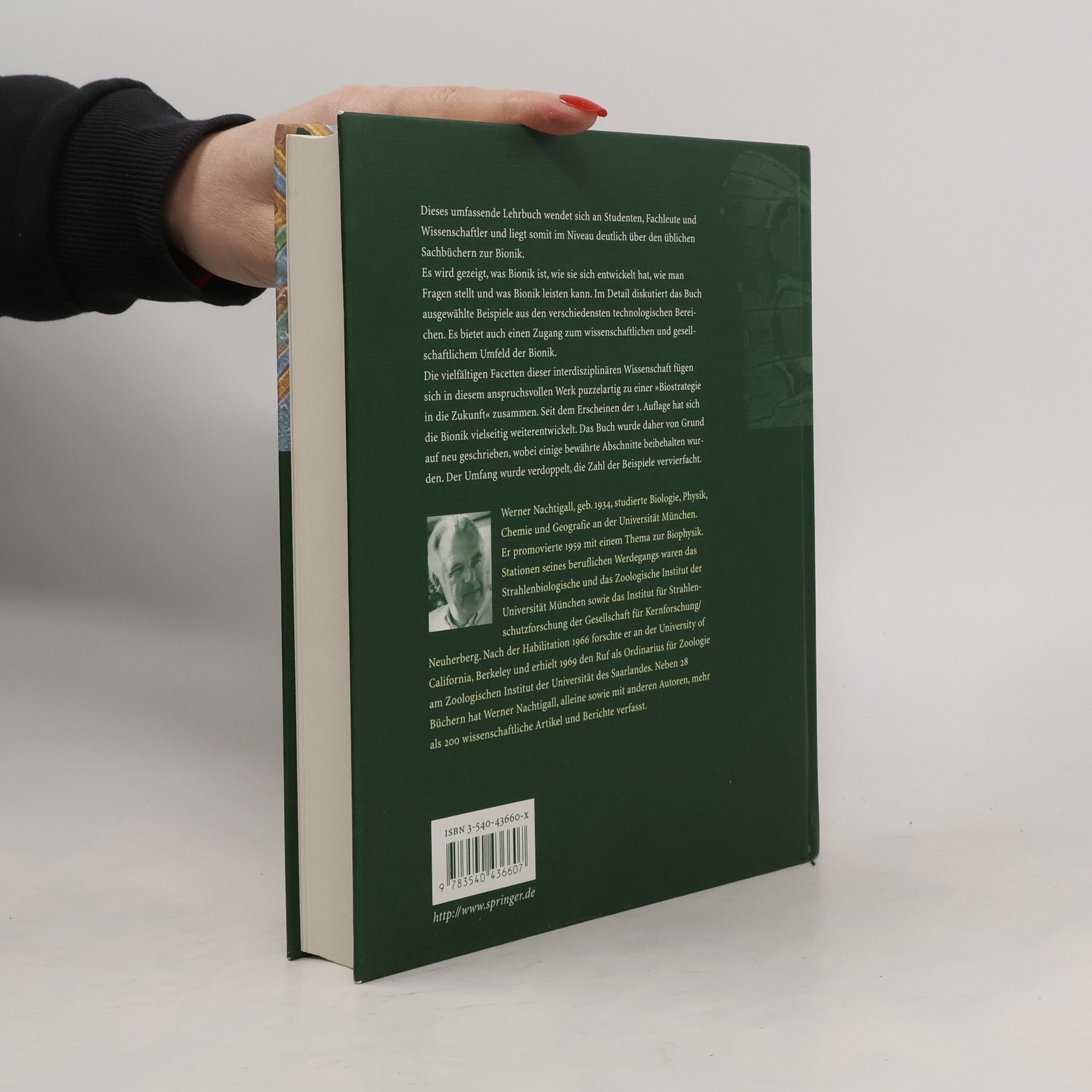 Dieses umfassende Lehrbuch wendet sich an Studenten, Fachleute und Wissenschaftler und liegt somit im Niveau deutlich über den üblichen Sachbüchern zur Bionik. Es wird gezeigt, was Bionik ist, wie sie sich entwickelt hat, wie man Fragen stellt und was Bionik leisten kann. Im Detail diskutiert das Buch ausgewählte Beispiele aus den verschiedensten technologischen Bereichen. Es bietet auch einen Zugang zum wissenschaftlichen und gesellschaftlichen Umfeld der Bionik. Die vielfältigen Facetten dieser interdisziplinären Wissenschaft fügen sich in diesem anspruchsvollen Werk puzzleartig zu einer "Biostrategie in die Zukunft" zusammen. Seit dem Erscheinen der 1. Auflage hat sich die Bionik vielseitig weiterentwickelt. Das Buch wurde daher von Grund auf neu geschrieben, wobei einige bewährte Abschnitte beibehalten wurden. Der Umfang wurde verdoppelt, die Zahl der Beispiele vervierfacht.