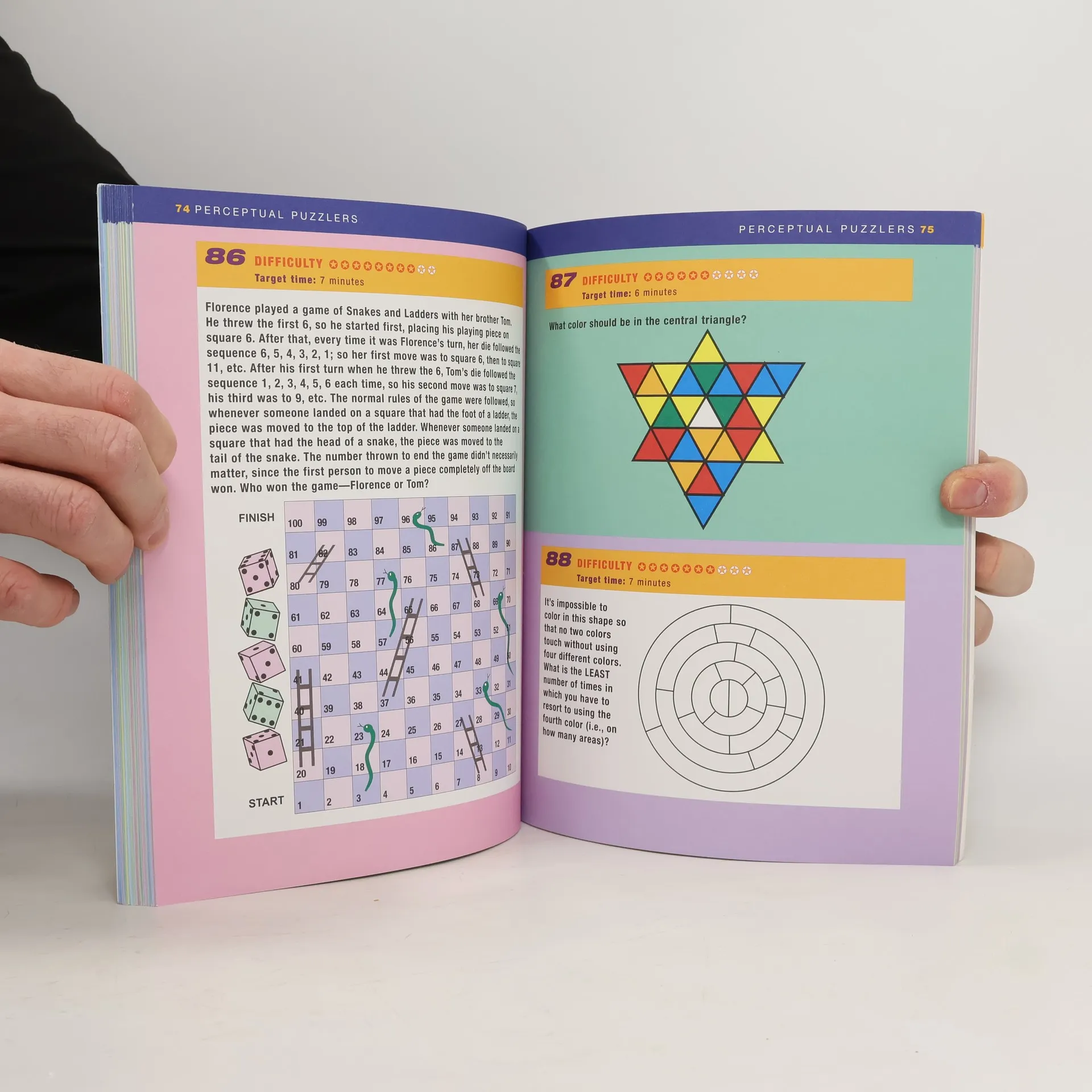 Containing over 100 exercises, Perceptual Puzzlers challenges even the cleverest puzzle solver. For fun or for sport, these puzzles are perfect for car trips or airplane rides or even to find out who is the real puzzle wizard in the family. Puzzlers used to old-fashioned black-and-white puzzles will be happy to move up to this techno-colorful puzzle book.