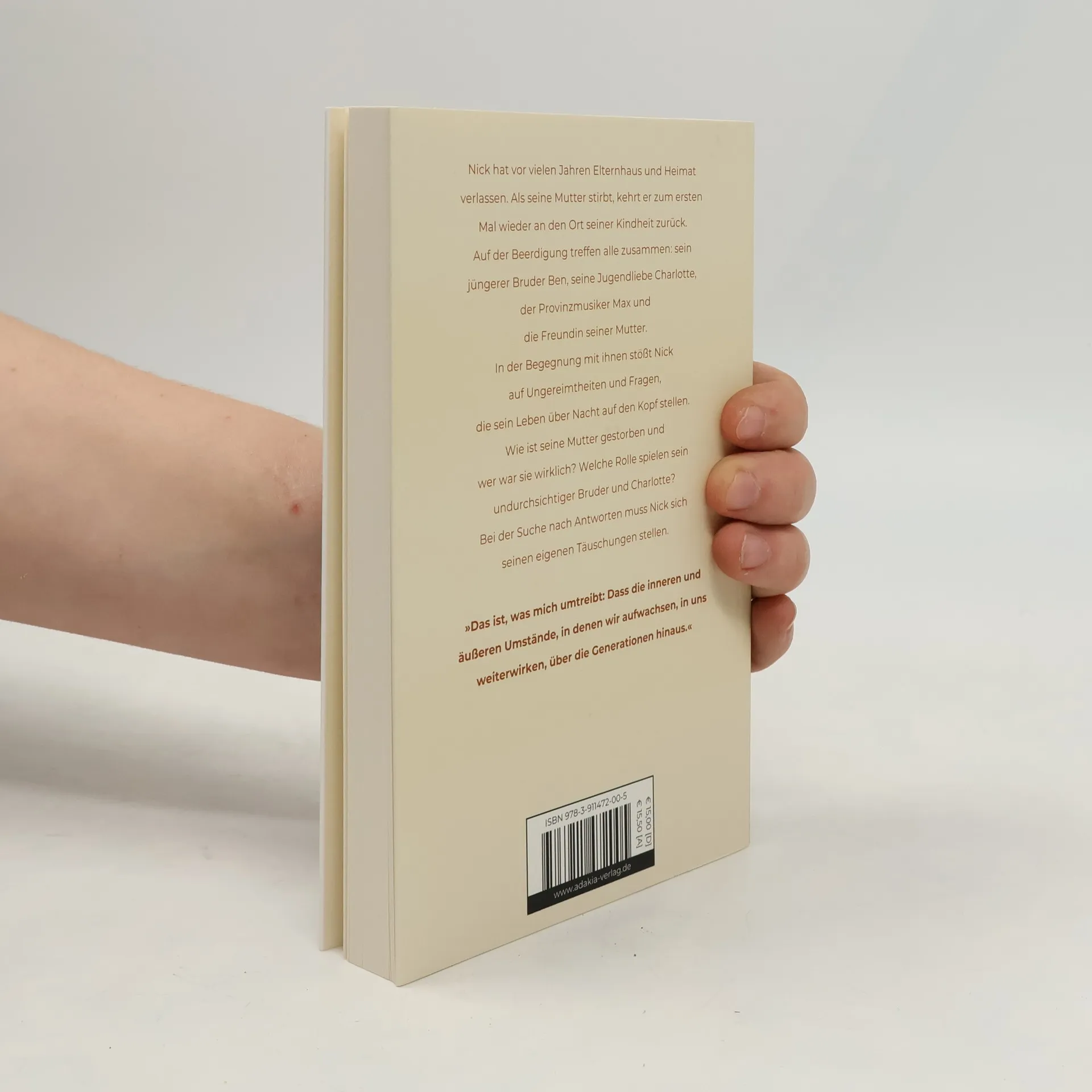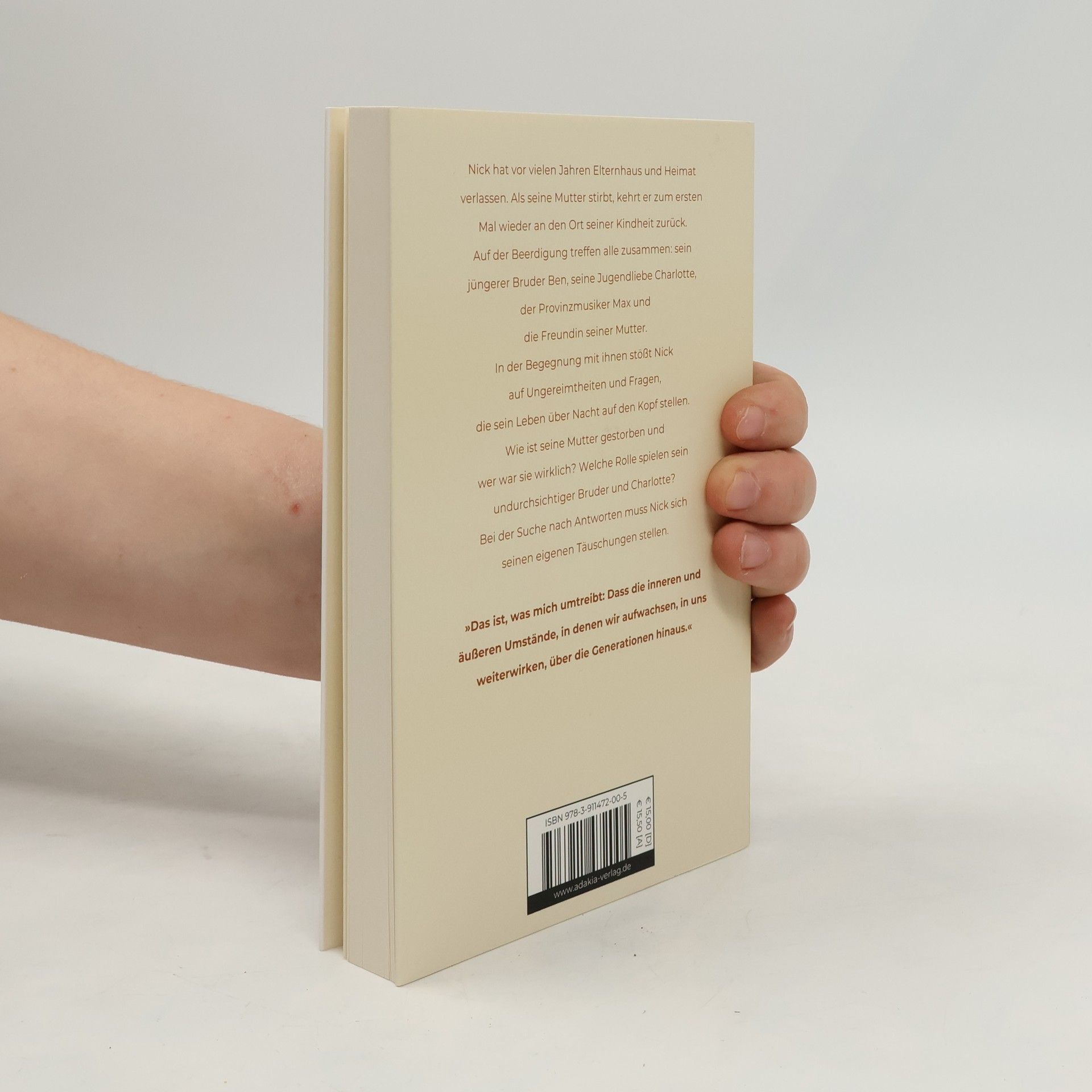Nick hat vor vielen Jahren Elternhaus und Heimat verlassen. Als seine Mutter stirbt, kehrt er zum ersten Mal wieder an den Ort seiner Kindheit zurück. Auf der Beerdigung treffen alle zusammen: sein jüngerer Bruder Ben, seine Jugendliebe Charlotte, der Provinzmusiker Max und die Freundin seiner Mutter. In der Begegnung mit ihnen stößt Nick auf Ungereimtheiten und Fragen, die sein Leben über Nacht auf den Kopf stellen. Wie ist seine Mutter gestorben und wer war sie wirklich? Welche Rolle spielen sein undurchsichtiger Bruder und Charlotte? Bei der Suche nach Antworten muss Nick sich seinen eigenen Täuschungen stellen. »Das ist, was mich umtreibt: Dass die inneren und äußeren Umstände, in denen wir aufwachsen, in uns weiterwirken, über die Generationen hinaus.«