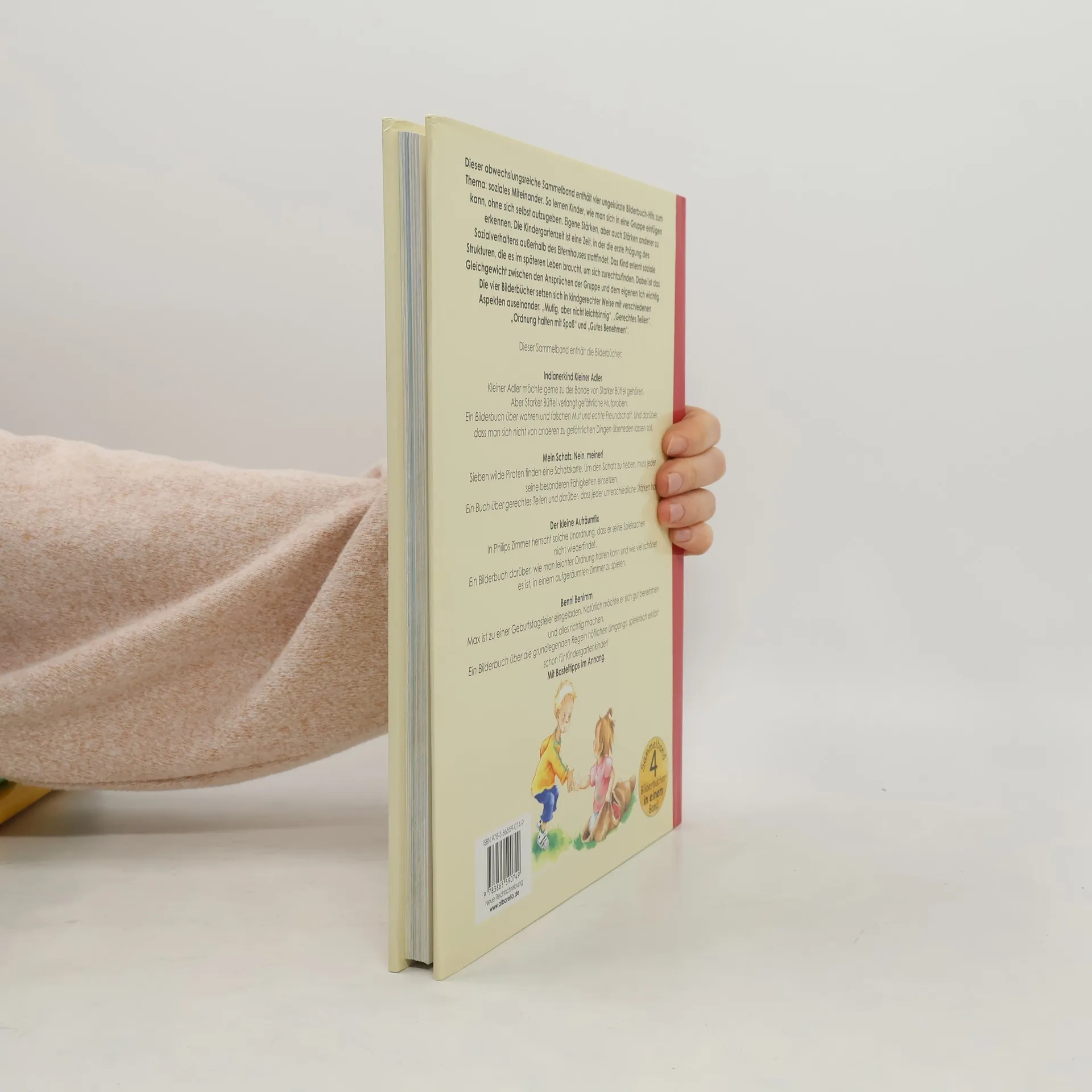 Dieser abwechslungsreiche Sammelband enthält vier ungekürzte Bilderbuch-Hits zum Thema: soziales Miteinander. So lernen Kinder, wie man sich in eine Gruppe einfügen kann, ohne sich selbst aufzugeben. Eigene Stärken, aber auch Stärken anderer zu erkennen. Die Kindergartenzeit ist eine Zeit, in der die erste Prägung des Sozialverhaltens außerhalb des Elternhauses stattfindet. Das Kind erlernt soziale Strukturen, die es im späteren Leben braucht, um sich zurechtzufinden. Dabei ist das Gleichgewicht zwischen den Ansprüchen der Gruppe und dem eigenen Ich wichtig. Die vier Bilderbücher setzen sich in kindgerechter Weise mit verschiedenen Aspekten auseinander: „Mutig, aber nicht leichtsinnig“, „Gerechtes Teilen“, „Ordnung halten mit Spaß“ und „Gutes Benehmen“. Dieser Sammelband enthält die Bilderbücher: 'Indianerkind Kleiner Adler' Kleiner Adler möchte gerne zu der Bande von Starker Büffel gehören. Aber Starker Büffel verlangt gefährliche Mutproben. Ein Bilderbuch über wahren und falschen Mut und echte Freundschaft. Und darüber, dass man sich nicht von anderen zu gefährlichen Dingen überreden lassen soll. 'Mein Schatz. Nein, meiner!' Sieben wilde Piraten finden eine Schatzkarte. Um den Schatz zu heben, muss jeder seine besonderen Fähigkeiten einsetzen. Ein Buch über gerechtes Teilen und darüber, dass jeder unterschiedliche Stärken hat. 'Der kleine Aufräumfix' In Philips Zimmer herrscht solche Unordnung, dass er seine Spielsachen nicht wiederfindet. Ein Bilderbuch darüber, wie man leichter Ordnung halten kann und wie viel schöner es ist, in einem aufgeräumten Zimmer zu spielen. 'Benni Benimm' Max ist zu einer Geburtstagsfeier eingeladen. Natürlich möchte er sich gut benehmen und alles richtig machen. Ein Bilderbuch über die grundlegenden Regeln höflichen Umgangs, spielerisch erklärt schon für Kindergartenkinder!