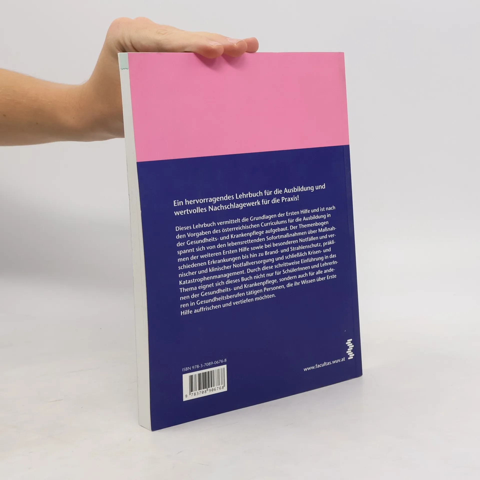 Ein hervorragendes Lehrbuch für die Ausbildung und wertvolles Nachschlagewerk für die Praxis! Dieses Lehrbuch vermittelt die Grundlagen der Ersten Hilfe und ist nach den Vorgaben des österreichischen Curriculums für die Ausbildung in der Gesundheits- und Krankenpflege aufgebaut. Der Themenbogen spannt sich von den lebensrettenden Sofortmaßnahmen über Maßnahmen der weiteren Ersten Hilfe sowie bei besonderen Notfällen und verschiedenen Erkrankungen bis hin zu Brand- und Strahlenschutz, präklinischer und klinischer Notfallversorgung und schließlich Krisen- und Katastrophenmanagement. Durch diese schrittweise Einführung in das Thema eignet sich dieses Buch nicht nur für SchülerInnen und LehrerInnen der Gesundheits- und Krankenpflege, sondern auch für alle anderen in Gesundheitsberufen tätigen Personen, die ihr Wissen über Erste Hilfe auffrischen und vertiefen möchten.
