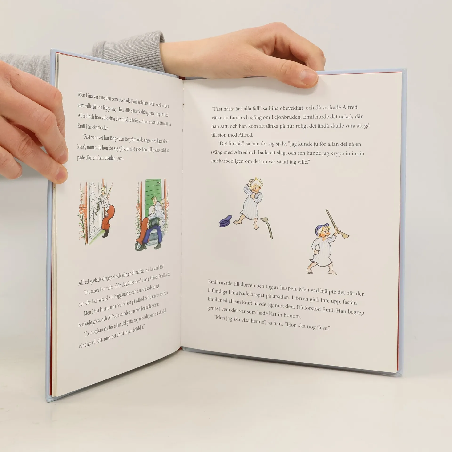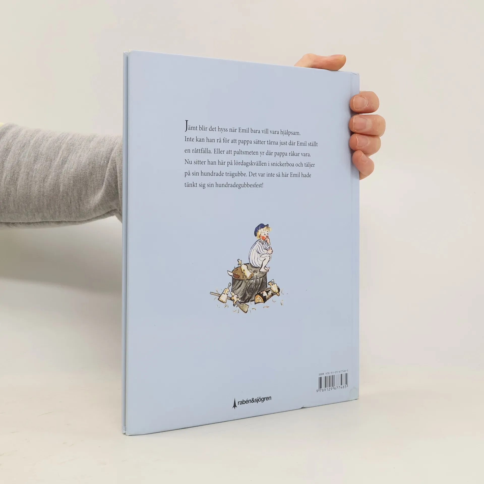 Pappa Anton är täckt med blodig paltsmet! Stackars Emil - jämt blir det hyss när han bara vill hjälpa till. Inte kan Emil rå för att pappa sätter tårna just där Emil har ställt en råttfälla. Eller att paltsmeten yr precis där pappa råkar vara. Nu sitter Emil på lördagskvällen och täljer på sin hundrade trägubbe. Och till råga på allt sitter Lina och vänslas med Emils egen Alfred. Det var inte så här Emil hade tänkt sig sin hundradegubbesfest ...