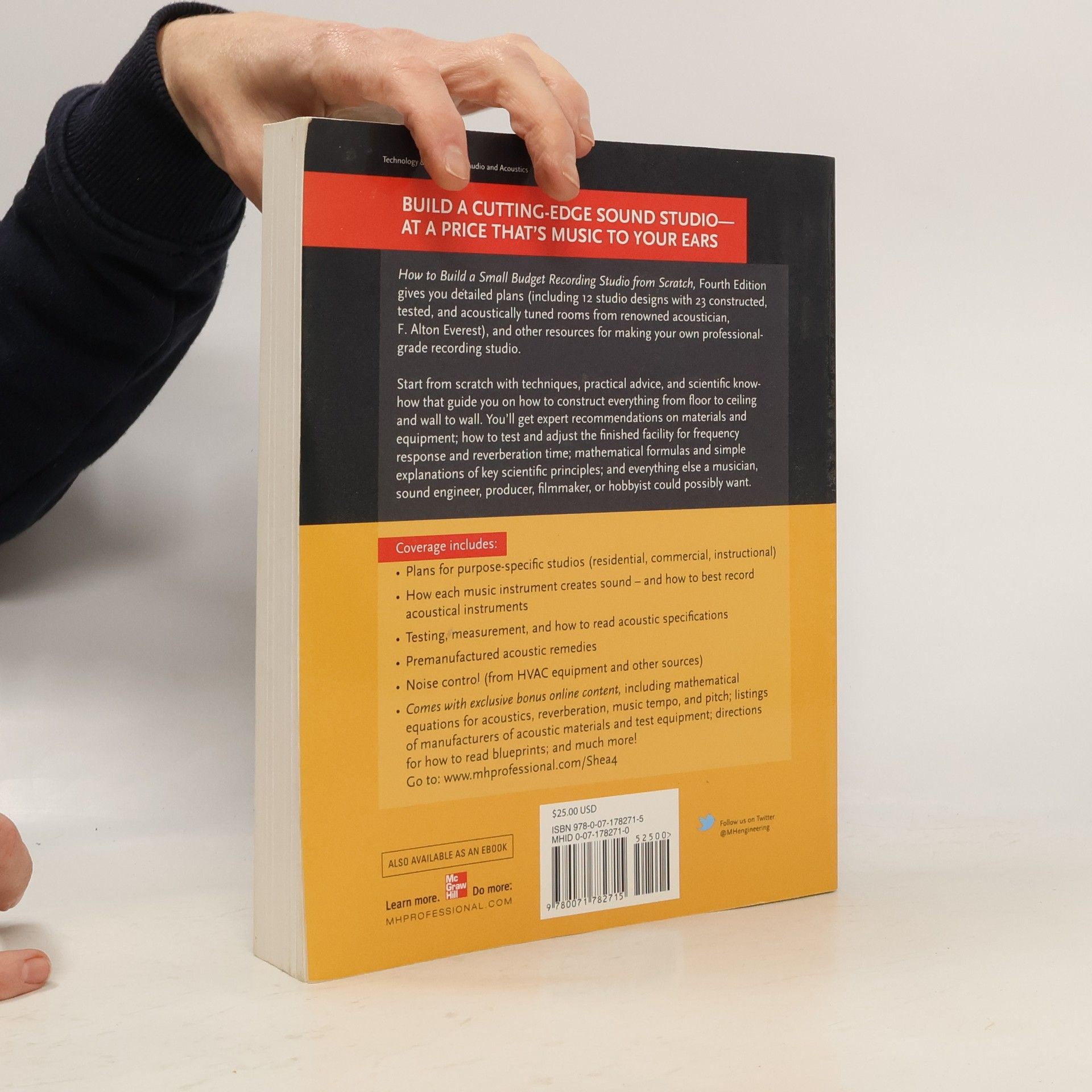 Publisher's Note: Products purchased from Third Party sellers are not guaranteed by the publisher for quality, authenticity, or access to any online entitlements included with the product. Build a cutting-edge sound studio--at a price that's music to your ears How to Build a Small Budget Recording Studio from Scratch , Fourth Edition gives you detailed plans (including 12 studio designs with 23 constructed, tested, and acoustically tuned rooms from renowned acoustician, F. Alton Everest), and other resources for making your own professional-grade recording studio. Start from scratch with techniques, practical advice, and scientific know-how that guide you on how to construct everything from floor to ceiling and wall to wall. You'll get expert recommendations on materials and equipment, how to test and adjust the finished facility for frequency response and reverberation time; mathematical formulas and simple explanations of key scientific principles; and everything else a musician, sound engineer, producer, filmmaker, or hobbyist could possibly want. Coverage includes: Plans for purpose-specific studios (residential, commercial, instructional) How each music instrument creates sound -- and how to best record acoustical instruments Testing, measurement, and how to read acoustic specifications Premanufactured acoustic remedies Noise control (from HVAC equipment and other sources) Comes with exclusive bonus online content , including mathematical equations for acoustics, reverberation, music tempo, and pitch; listings of manufacturers of acoustic materials and test equipment; directions for how to read blueprints; and much more! Go to: www.mhprofessional.com/Shea4