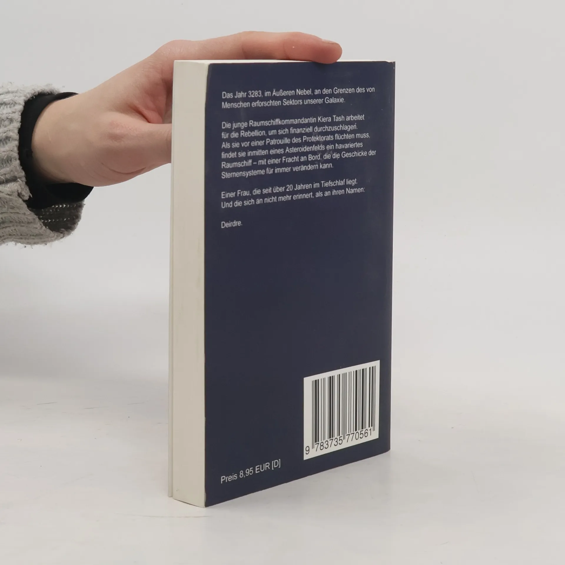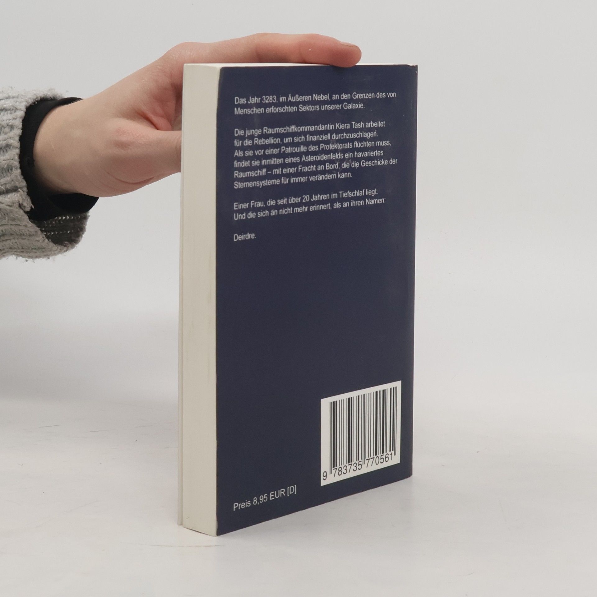 Das Jahr 3283, im Äußeren Nebel, an den Grenzen des von Menschen erforschten Weltraums. Die junge Raumschiffkommandantin Kiera Tash arbeitet für die Rebellion, um sich finanziell durchzuschlagen. Als sie vor einer Patrouille des Protektorats flüchten muss, findet sie inmitten eines Asteroidenfelds ein havariertes Raumschiff mit einer Fracht an Bord, die die Geschicke der Sternensysteme für immer verändern kann. Einer Frau, die seit über 20 Jahren im Tiefschlaf liegt. Und die sich an nicht mehr erinnert, als an ihren Namen: Deirdre.