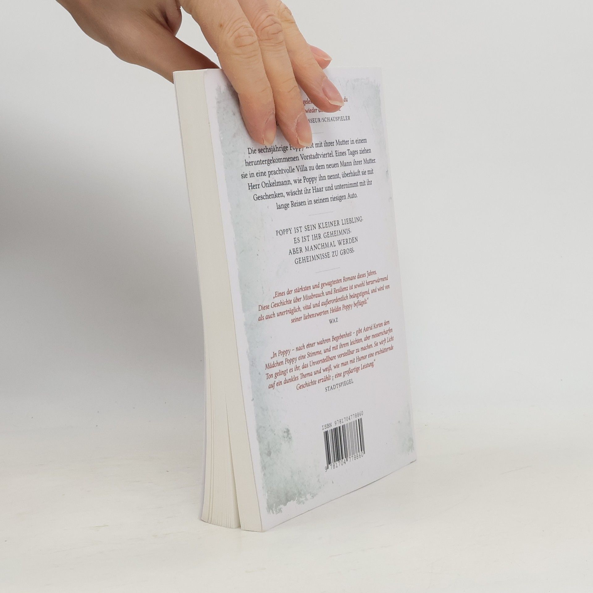 „Nachdem du Poppy gelesen hast, möchtest du das Mädchen nie wieder allein lassen.“ Tim Roberts – Regisseur/Schauspieler „Das ist unser neues Zuhause“, sagt Mama. „Poppy, du musst dich nie vor mir verstecken, weißt du das denn nicht?“, sagt er. „Der hat ein Gesicht wie eine Bowlingkugel“, sagt Oma Becker. „Euch klar ausdrücken, Leute, sagt einfach klar und deutlich, was ihr meint“, sagt der Lehrer. Hilfe, denkt Poppy. Die sechsjährige Poppy lebt mit ihrer Mutter in einem heruntergekommenen Vorstadtviertel. Eines Tages ziehen sie in eine prachtvolle Villa zu dem neuen Mann ihrer Mutter. Der neuer „Papa“ erfüllt Poppy jeden Wunsch. Er sagt, er liebt sie, kann mit ihr Erwachsenengespräche führen, und überhäuft sie mit Geschenken. Poppys Mutter ist glücklich. Sie kann sich endlich kau-fen, was immer sie möchte. Alles wäre gut, gäbe es da nicht die eine Sache … Erste Stimmen: „Nachdem du Poppy gelesen hast, möchtest du das Mäd-chen nie wieder allein lassen.“ Tim Robbins – Regisseur/Schauspieler „Eines der stärksten und gewagtesten Romane dieses Jahres, der auf wahre Begebenheiten beruht. Diese Geschichte über Psychospiele, Missbrauch und Resilienz ist sowohl herzerwärmend als auch unerträglich, vital und außerordentlich beängstigend, und wird von seiner liebenswerten Heldin Poppy beflügelt.“ WAZ „In Poppy – nach einer wahren Begebenheit – gibt Astrid Korten dem Mädchen Poppy eine Stimme, und mit ihrem leichten, aber messerscharfen Ton gelingt es ihr, das Un-vorstellbare vorstellbar zu machen. Sie wirft Licht auf ein dunkles Thema und weiß, wie man mit Humor eine er-schütternde Geschichte erzählt - eine großartige Leistung.“ Stadtspiegel Die Geschichte von Poppy hat mich tief berührt und auch unglaublich wütend gemacht. Auf der anderen Seite besticht das Buch durch eine oft brillante Situationsko-mik, die nie im Widerspruch zu den erschütternden Be-gebenheiten, die Poppy ertragen musste, steht. Astrid Korten hat Humor, Ironie und das Leid des Mädchens auf herzerwärmende und gleichzeitig unerträg-liche Weise zum Ausdruck gebracht. Es fällt mir schwer, die vielfältigen Gefühle, die die Geschichte des Mäd-chens in mir geweckt haben, zu beschreiben. Ich spreche Astrid Korten und der heute erwachsenen Poppy meine Hochachtung aus für ihren Mut, die wahre Geschichte der kleinen Poppy zu erzählen. Ich habe beim Lesen gelacht und geweint. Christine Hochberger, Buchreif