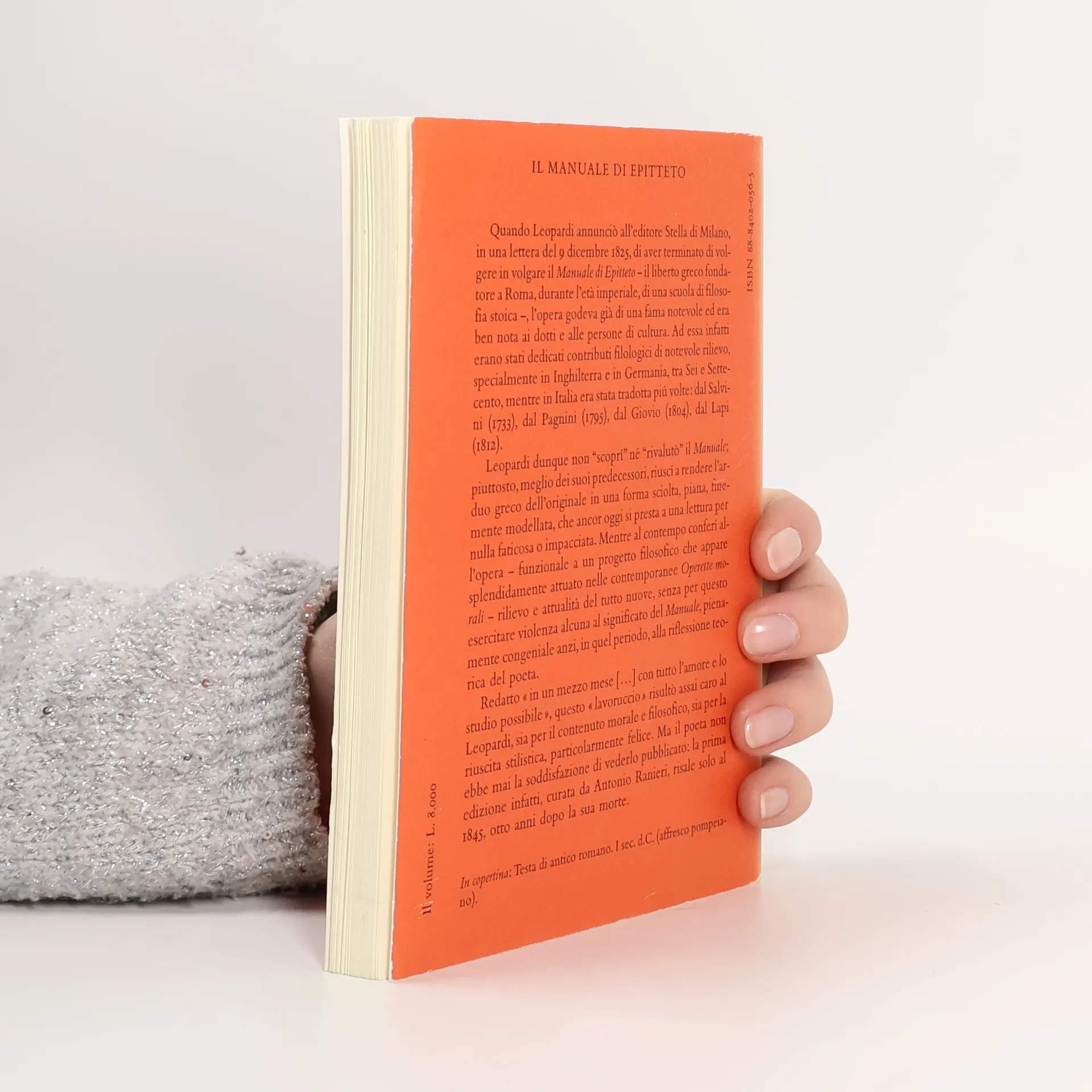 Quando Leopardi annunciò all’editore Stella di Milano in una lettere del 9 dicembre 1825, di aver terminato di volgere in volgare il Manuale di Epitteto – il liberto greco fondatore a Roma, durante l’età imperiale, di una scuola di filosofia stoica –, l’opera godeva già di una fama notevole ed era ben nota ai dotti e alle persone di cultura. Ad essa infatti erano stati dedicati contributi filologici di notevole rilievo, specialmente in Inghilterra e in Germania, tra Sei e Settecento, mentre in Italia era stata tradotta più volte: dal Salvini (1733), dal Pagnini (1795), dal Giovio (1804), dal Lapi (1812). Leopardi dunque non “scoprì” né “rivalutò” il Manuale; piuttosto, meglio dei suoi predecessori, riuscì a rendere l’arduo greco dell’originale in una forma sciolta, piana, finemente modellata, che ancor oggi si presta a una lettura per nulla faticosa o impacciata. Mentre al contempo conferì all’opera – funzionale ad un progetto filosofico che appare splendidamente attuato nelle contemporanee Operette morali – rilievo e attualità del tutto nuove, senza per questo esercitare violenza alcuna al significato del Manuale, pienamente congeniale, anzi, in questo periodo, alla riflessione teorica del poeta. Redatto «in un mezzo mese (…) con tutto l’amore e lo studio possibile», questo «lavoruccio» risultò assai caro al Leopardi, sia per il contenuto morale e filosofico, sia per la riuscita stilistica, particolarmente felice. Ma il poeta non ebbe mai la soddisfazione di vederlo pubblicato: la prima edizione infatti, curata da Antonio Ranieri, risale solo al 1854, otto anni dopo la sua morte.