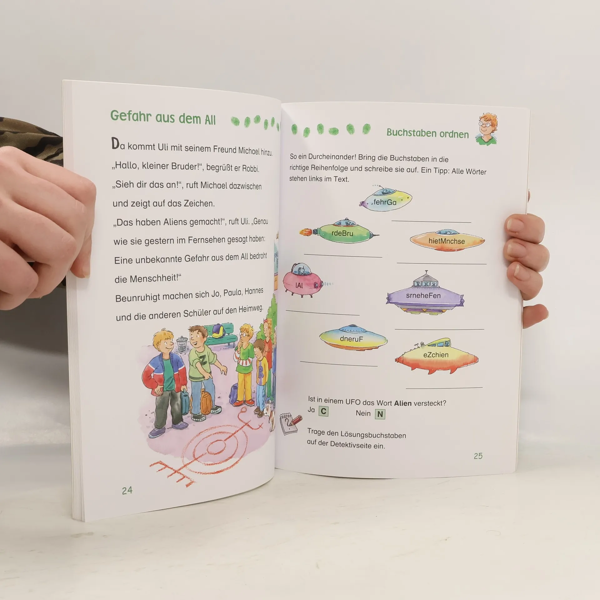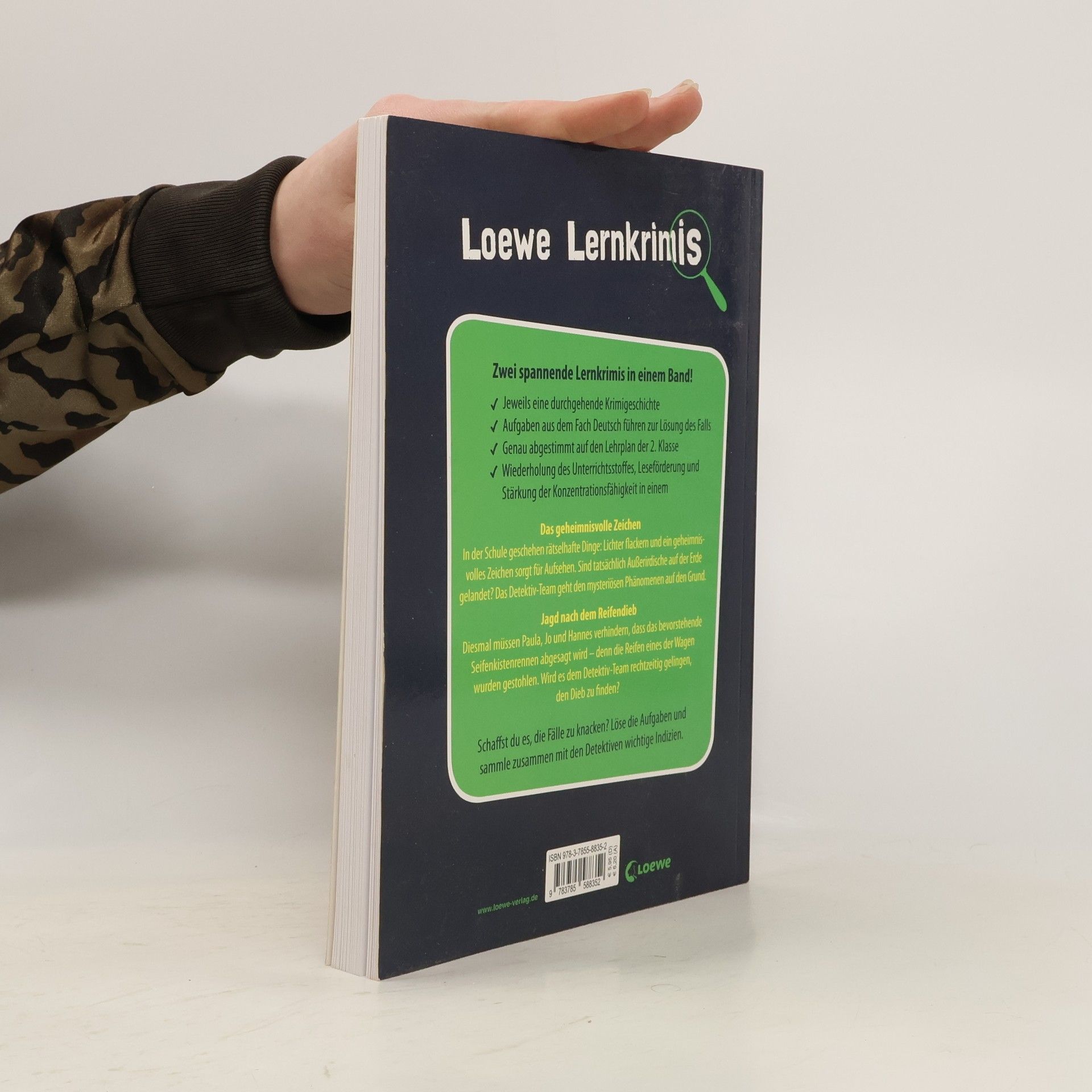 Das Buch ist bei deiner Buchhandlung vor Ort und bei vielen Online-Buchshops erhältlich! Zwei spannende Fälle warten nur darauf, von schlauen Meisterdetektiv en gelöst zu werden! Knifflige Krimigeschichten werden durch abwechslungsreiche Rätsel ergänzt, deren Lösung zur Aufklärung der Verbrechen führt. Schulkinder können so spielerisch den Unterrichtsstoff in Deutsch wiederholen – genau abgestimmt auf den Lehrplan der zweiten Klasse . Lösungsseiten in Spiegelschrift bestätigen den Rätselerfolg. - Jeweils eine durchgehende Krimigeschichte - Aufgaben aus dem Fach Deutsch führen zur Lösung des Falls - Genau abgestimmt auf den Lehrplan für die 2. Klasse - Wiederholung des Unterrichtsstoffes, Leseförderung und Stärkung der Konzentrationsfähigkeit in einem Das geheimnisvolle Zeichen In der Schule geschehen rätselhafte Dinge: Lichter flackern und ein geheimnisvolles Zeichen sorgt für Aufsehen. Sind tatsächlich Außerirdische auf der Erde gelandet? Das Detektiv-Team geht den mysteriösen Phänomenen auf den Grund. Jagd nach dem Reifendieb Diesmal müssen Paula, Jo und Hannes verhindern, dass das bevorstehende Seifenkistenrennen abgesagt wird – denn die Reifen eines der Wagen wurden gestohlen. Wird es dem Detektiv-Team rechtzeitig gelingen, den Dieb zu finden? Schaffst du es, die Fälle zu knacken? Löse die Aufgaben und sammle zusammen mit den Detektiven wichtige Indizien.