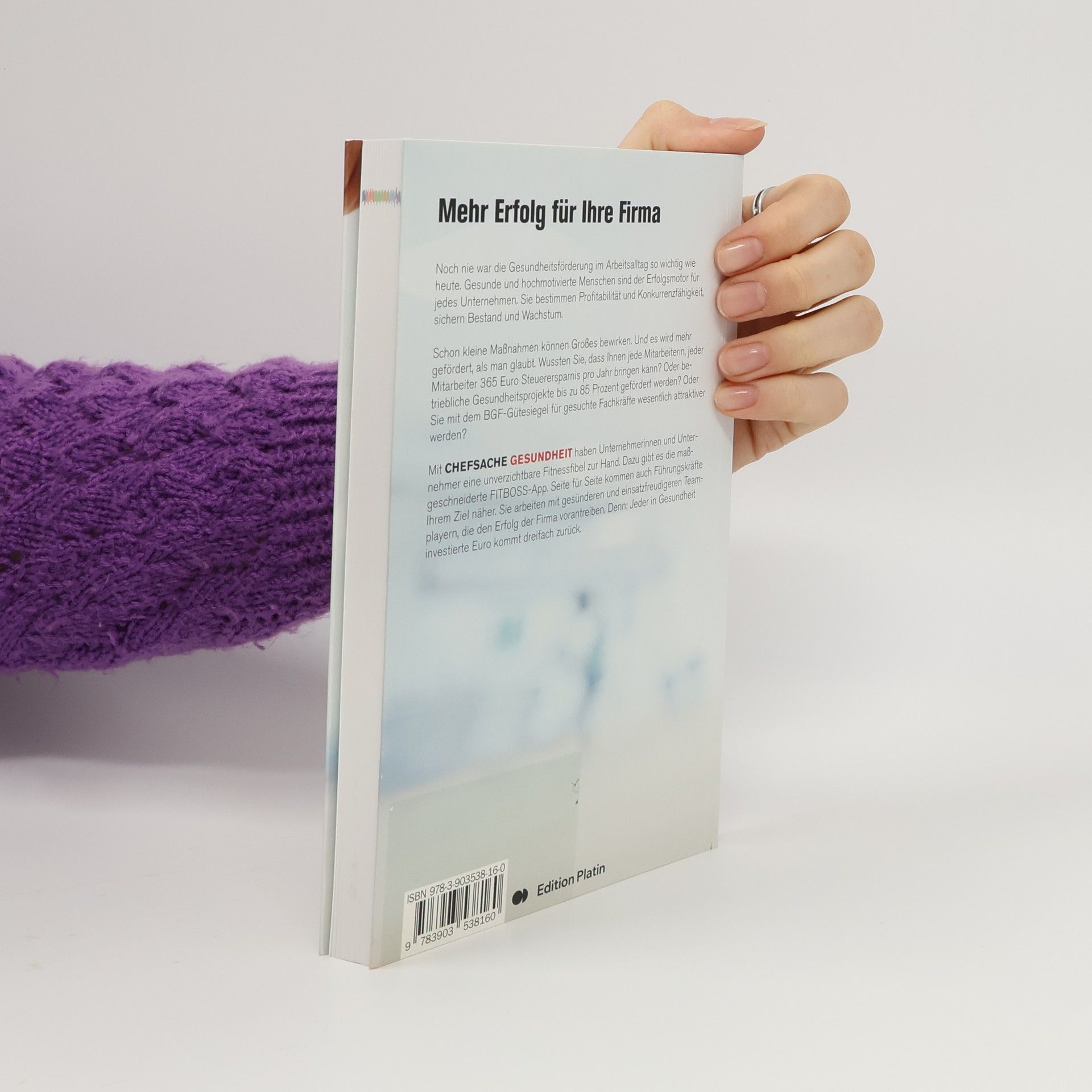 Jeder Euro, der in Gesundheit investiert wird, kommt dreifach zurück. Schon kleine Maßnahmen können Großes bewirken. Mit «Chefsache Gesundheit« haben Unternehmerinnen und Unternehmer eine Fitnessfibel zur Hand, dazu gibt es eine maßgeschneiderte App. Seite für Seite kommen auch Führungskräfte ihrem Ziel näher. Sie arbeiten mir gesünderen und einsatzfreudigeren Teamplayern, die den Erfolg der Firma vorantreiben. Alle Inhalte stammen von Experten auf ihrem Gebiet und zeigen, wie schnell und leicht man ein Unternehmen zukunftsfit machen kann.