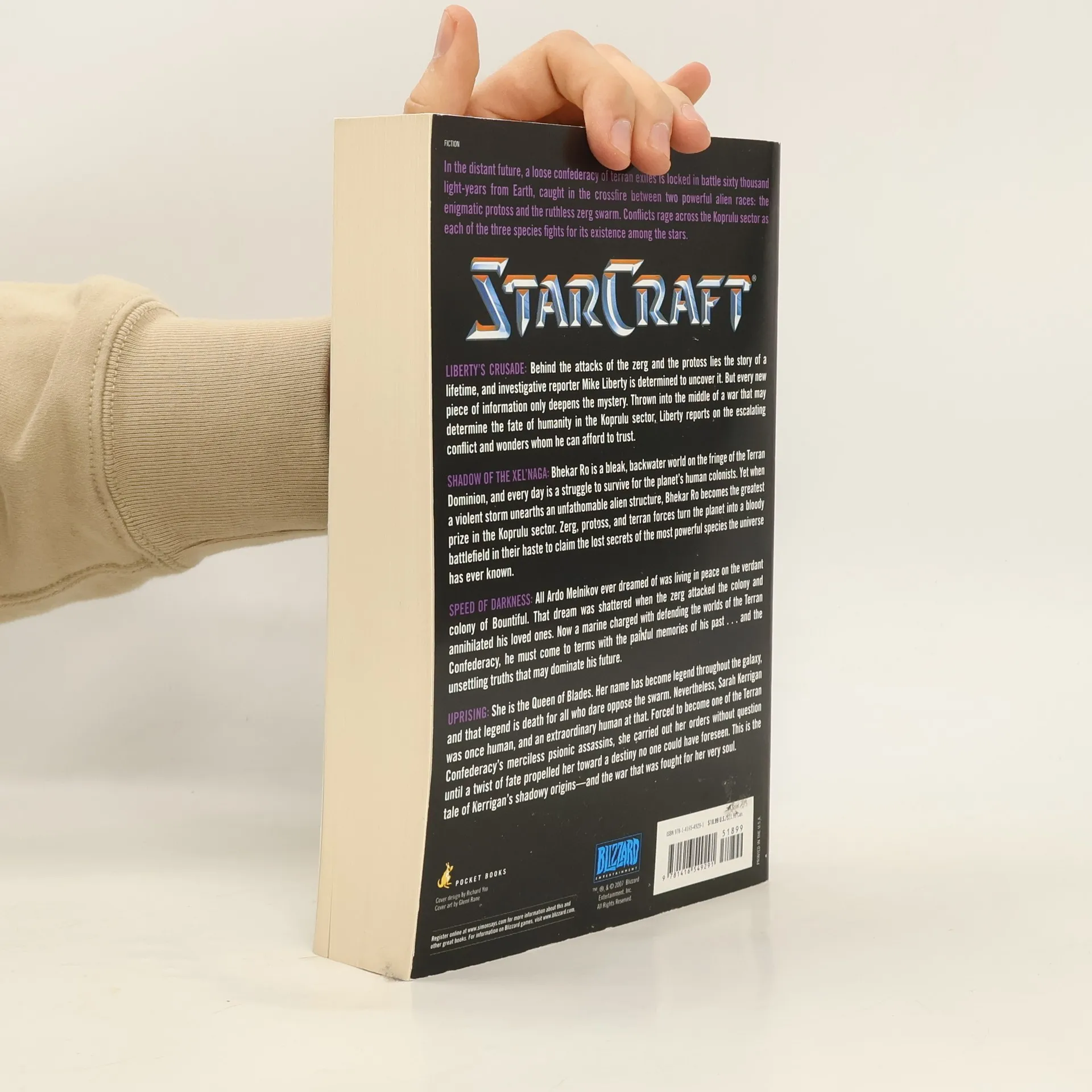 In the distant future, a loose confederacy of terran exiles is locked in battle sixty thousand light-years from Earth, caught in the crossfire between two powerful alien races: the enigmatic protoss and the ruthless zerg swarm. Conflicts rage across the Koprulu sector as each of the three species fights for its existence among the stars. LIBERTY'S CRUSADE: Behind the attacks of the zerg and the protoss lies the story of a lifetime, and investigative reporter Mike Liberty is determined to uncover it. But every new piece of information only deepens the mystery. Thrown into the middle of a war that may determine the fate of humanity in the Koprulu sector, Liberty reports on the escalating conflict and wonders whom he can afford to trust. SHADOW OF THE XEL'NAGA: Bhekar Ro is a bleak, backwater world on the fringe of the Terran Dominion, and every day is a struggle to survive for the planet's human colonists. Yet when a violent storm unearths an unfathomable alien structure, Bhekar Ro becomes the greatest prize in the Koprulu sector. Zerg, protoss, and terran forces turn the planet into a bloody battlefield in their haste to claim the lost secrets of the most powerful species the universe has ever known. SPEED OF DARKNESS: All Ardo Melnikov ever dreamed of was living in peace on the verdant colony of Bountiful. That dream was shattered when the zerg attacked the colony and annihilated his loved ones. Now a marine charged with defending the worlds of the Terran Confederacy, he must come to terms with the painful memories of his past...and the unsettling truths that may dominate his future. UPRISING: She is the Queen of Blades. Her name has become legend throughout the galaxy, and that legend is death for all who dare oppose the swarm. Nevertheless, Sarah Kerrigan was once human, and an extraordinary human at that. Forced to become one of the Terran Confederacy's merciless psionic assassins, she carried out her orders without question until a twist of fate propelled her toward a destiny no one could have foreseen. This is the tale of Kerrigan's shadowy origins -- and the war that was fought for her very soul.