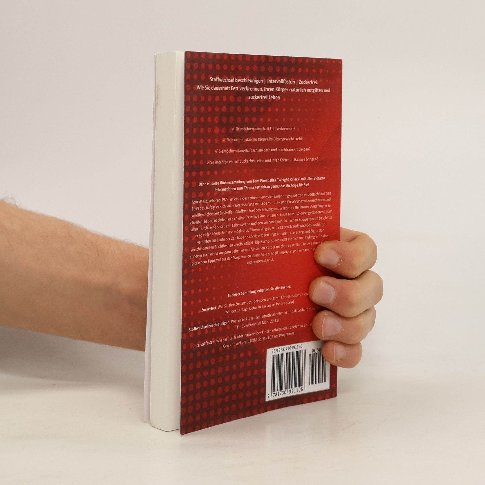 ★ ★ ★ Aktion endet in Kürze! ★ ★ ★ Stoffwechsel beschleunigen | Intervallfasten | Zuckerfrei: Wie Sie dauerhaft Fett verbrennen, Ihren Körper natürlich entgiften und zuckerfrei Leben ✓ Sie möchten dauerhaft Fett verbrennen? ✓ Sie möchten, dass ihr Körper im Gleichgewicht steht? ✓ Sie möchten dauerhaft schlank sein und durchtrainiert bleiben? ✓ Sie möchten endlich zuckerfrei Leben und Ihren Körper in Balance bringen? Dann ist diese Büchersammlung von Tom Wiest alias "Weight Killers" mit allen nötigen Informationen zum Thema Fettabbau genau das Richtige für Sie! Tom Wiest, geboren 1975, ist einer der renommiertesten Ernährungsexperten in Deutschland. Seit 1999 beschäftigt er sich voller Begeisterung mit Lebensmittel- und Ernährungswissenschaften und veröffentlichte den Bestseller »Stoffwechsel beschleunigen«. Er lebt bei Heilbronn. Angefangen zu schreiben hat er, nachdem er sich eine freiwillige Auszeit aus seinem sonst so durchgetakteten Leben nahm. Durch seine sportliche Lebensweise und den vorhandenen fachlichen Kompetenzen beschloss er so vielen Menschen wie möglich auf ihrem Weg zu mehr Lebensfreude und Gesundheit zu verhelfen. Im Laufe der Zeit haben sich viele Ideen angesammelt, die er regelmäßig in den verschiedensten Buchthemen veröffentlicht. Die Bücher sollen nicht einfach nur Bildung enthalten, sondern auch einen Ansporn geben etwas für seinen Körper machen zu wollen. Jedes seiner Bücher gibt einem Tipps mit auf den Weg, wie du deine Ziele schnell umsetzen und einfach in dein Leben integrieren kannst. In dieser Sammlung erhalten Sie die Bücher: 1. Zuckerfrei: Wie Sie Ihre Zuckersucht beenden und Ihren Körper natürlich entgiften (Mit der 14-Tage Detox in ein zuckerfreies Leben) 2. Stoffwechsel beschleunigen: Wie Sie in kurzer Zeit intuitiv abnehmen und dauerhaft dünn bleiben - Fett verbrennen! Nicht Zucker! 3. Intervallfasten: Wie Sie durch intermittierendes Fasten erfolgreich abnehmen und dauerhaft Gewicht verlieren: BONUS: Das 10 Tage Programm Folgende Boni erhalten Sie zusätzlich: 14-Tage Detox Plan 10 Tage Plan für ein erfolgreiches Fasten Eine Menge Rezepte für ausreichend Abwechslung Und der beste BONI ist der LIVE SUPPORT VON DEN WEIGHT KILLERS Und vieles, vieles mehr ☆ ★ ☆ Erwerben Sie jetzt diese tolle Büchersammlung zum absoluten Sonderpreis! ☆ ★ ☆
