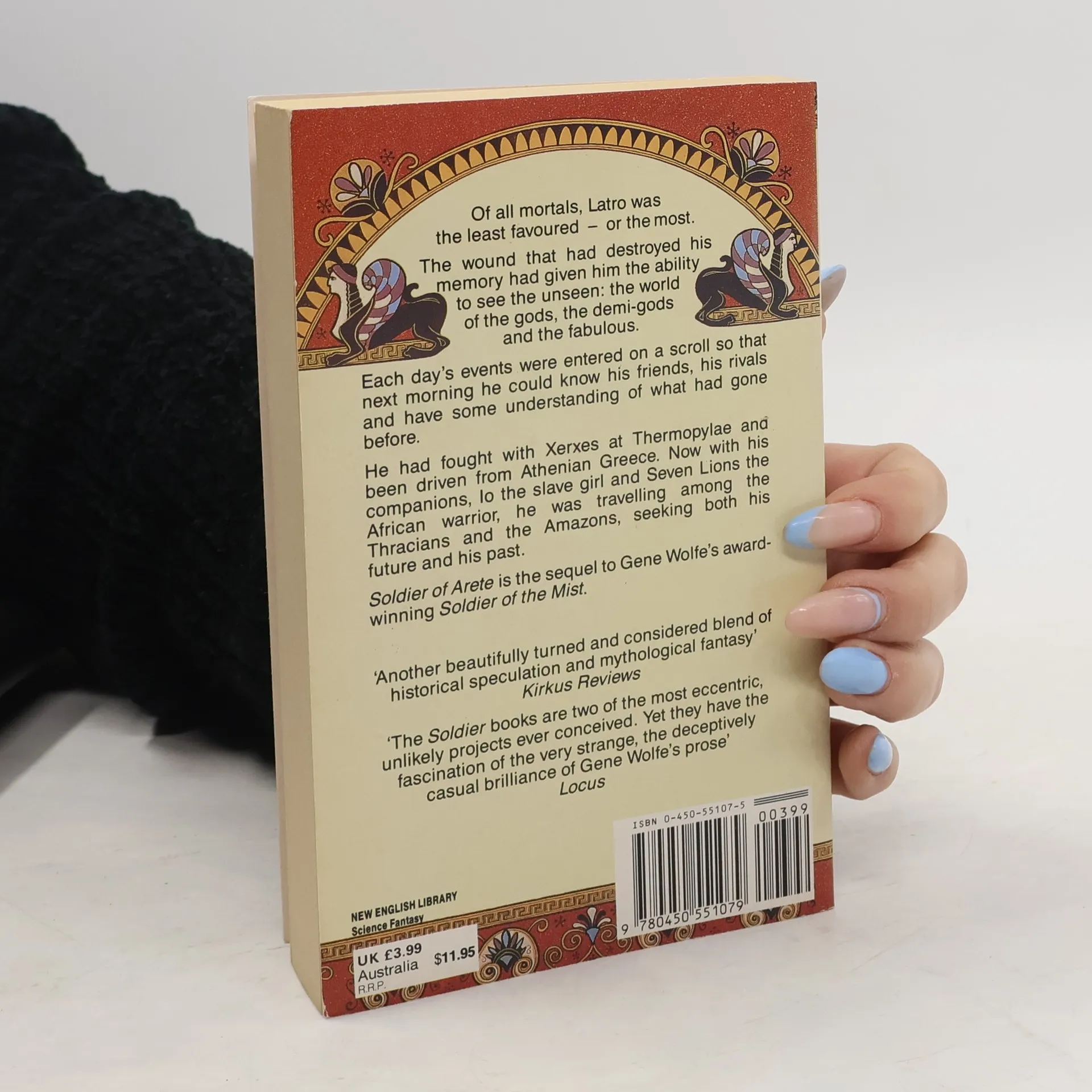 Of all mortals, Latro was the least favoured - or the most. The wound that had destroyed his memory had given him the ability to see the unseen: the world of the gods, the demi-gods and the fabulous. Each day events were entered on a scroll so that the next morning he could know his friends, his rivals and have some understanding of what had gone before. He had fought with Xerxes at Thermopylae and been driven from Athenian Greece. Now with his companions, Io the slave girl and Seven Lions the African warrior, he was travelling among the Thracians and the Amazons, seeking both his future and his past. Soldier of Arete is the sequel to Gene Wolfe's award winning Soldier of the Mist.