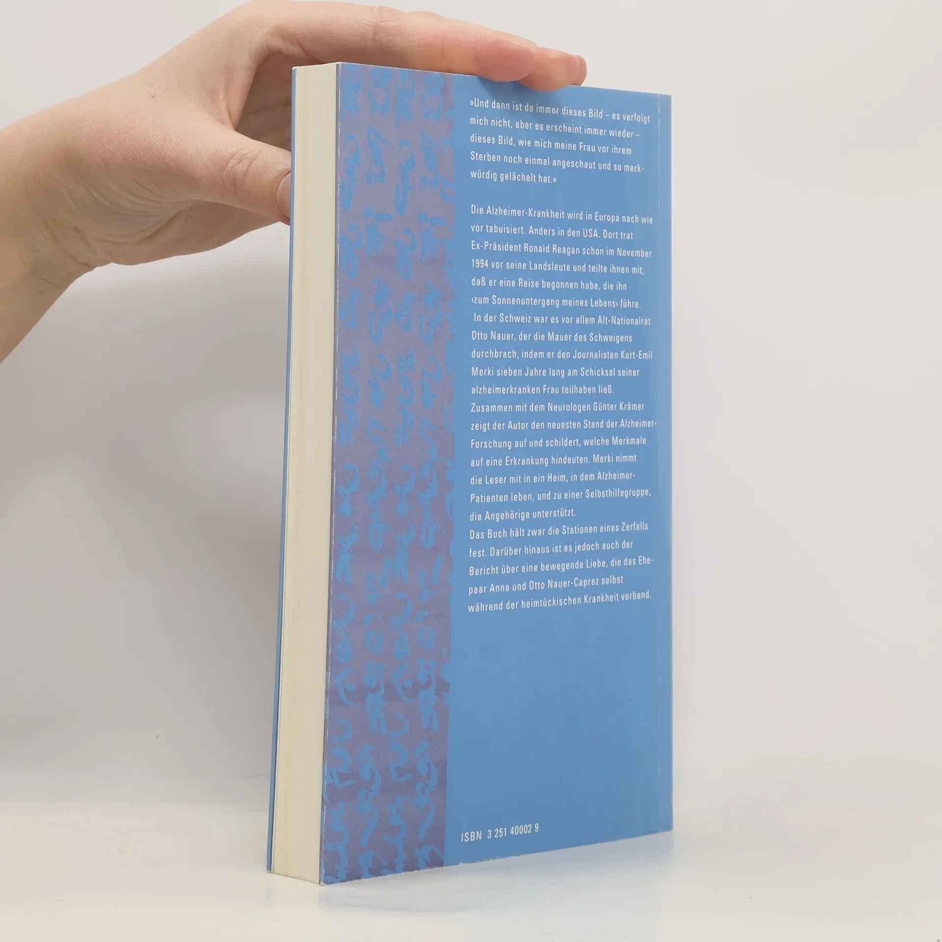 Die Alzheimer-Krankheit wird in Europa nach wie vor tabuisiert. In der Schweiz war es vor allem Alt-Nationalrat Otto Nauer, der die Mauer des Schweigens durchbrach, indem er den Journalisten Kurt-Emil Merki sieben Jahre lang am Schicksal seiner alzheimerkranken Frau teilhaben ließ. Zusammen mit dem Neurologen Günter Krämer zeigt der Autor den neuesten Stand der Alzheimer-Forschung auf und schildert, welche Merkmale auf eine Erkrankung hindeuten. Merki nimmt die Leser mit in ein Heim, in dem Alzheimer-Patienten leben, und zu einer Selbsthilfegruppe, die Angehörige unterstützt.§Das Buch hält nicht nur die Stationen eines Zerfalls fest, es ist darüber hinaus der Bericht über eine bewegende Liebe, die das Ehepaar Anna und Otto Nauer-Caprez selbst während der heimtückischen Krankheit verband.