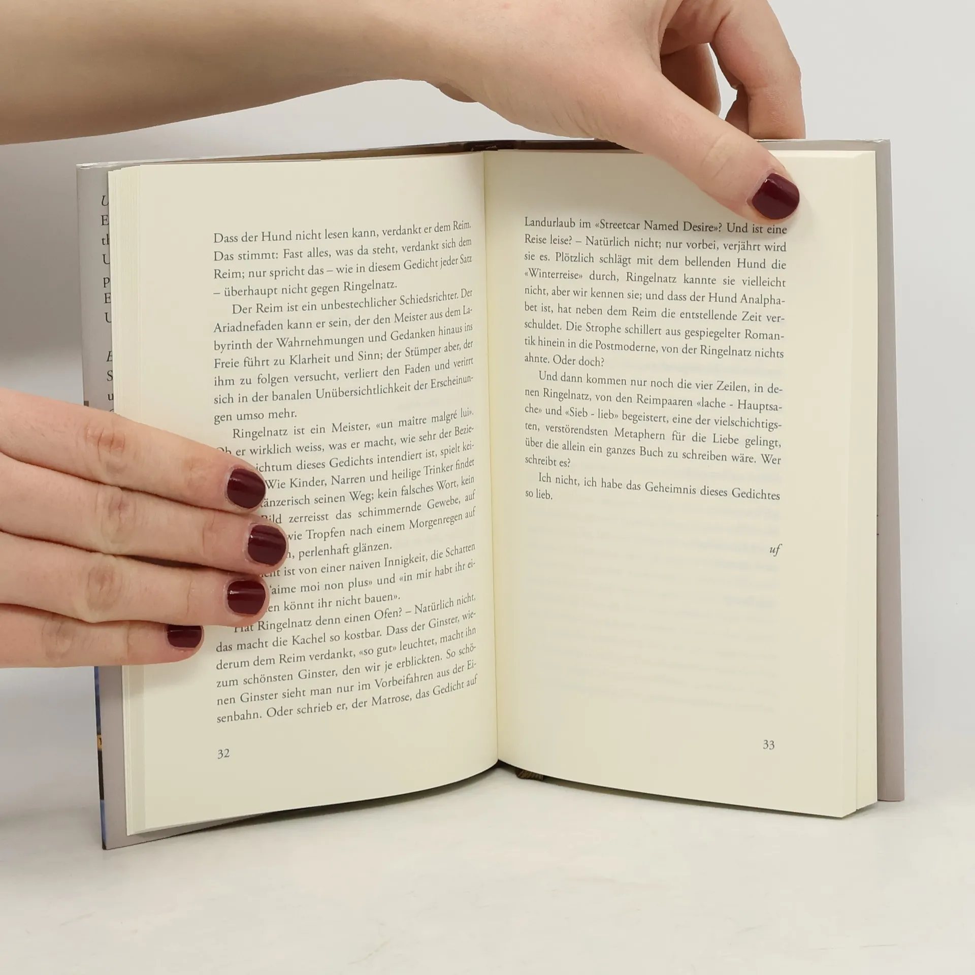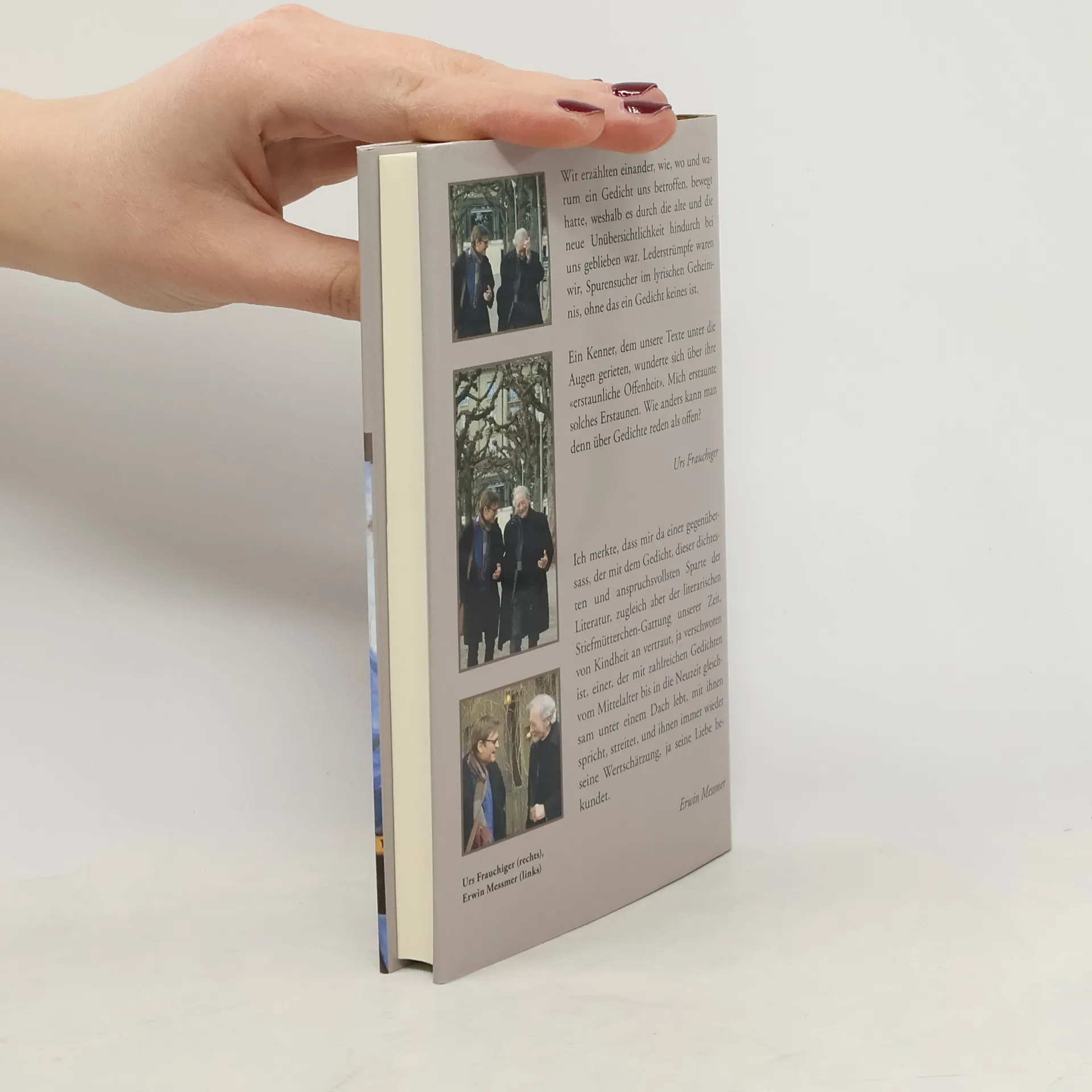 «Wir erzählten einander, wie, wo und warum ein Gedicht uns betroffen, bewegt hatte, weshalb es durch die alte und die neue Unübersichtlichkeit hindurch bei uns geblieben war. Lederstrümpfe waren wir, Spurensucher im lyrischen Geheimnis, ohne das ein Gedicht keines ist. Ein Kenner, dem unsere Texte unter die Augen gerieten, wunderte sich über ihre «erstaunliche Offenheit». Mich erstaunte solches Erstaunen. Wie anders kann man denn über Gedichte reden als offen?» Urs Frauchiger «Ich merkte, dass mir da einer gegenübersass, der mit dem Gedicht, dieser dichtesten und anspruchsvollsten Sparte der -Literatur, zugleich aber der literarischen Stiefmütterchen-Gattung unserer Zeit, von Kindheit an vertraut, ja verschworen ist, einer, der mit zahlreichen Gedichten vom Mittelalter bis in die Neuzeit gleichsam unter einem Dach lebt, mit ihnen spricht, streitet, und ihnen immer wieder seine Wertschätzung, ja seine Liebe bekundet.» Erwin Messmer