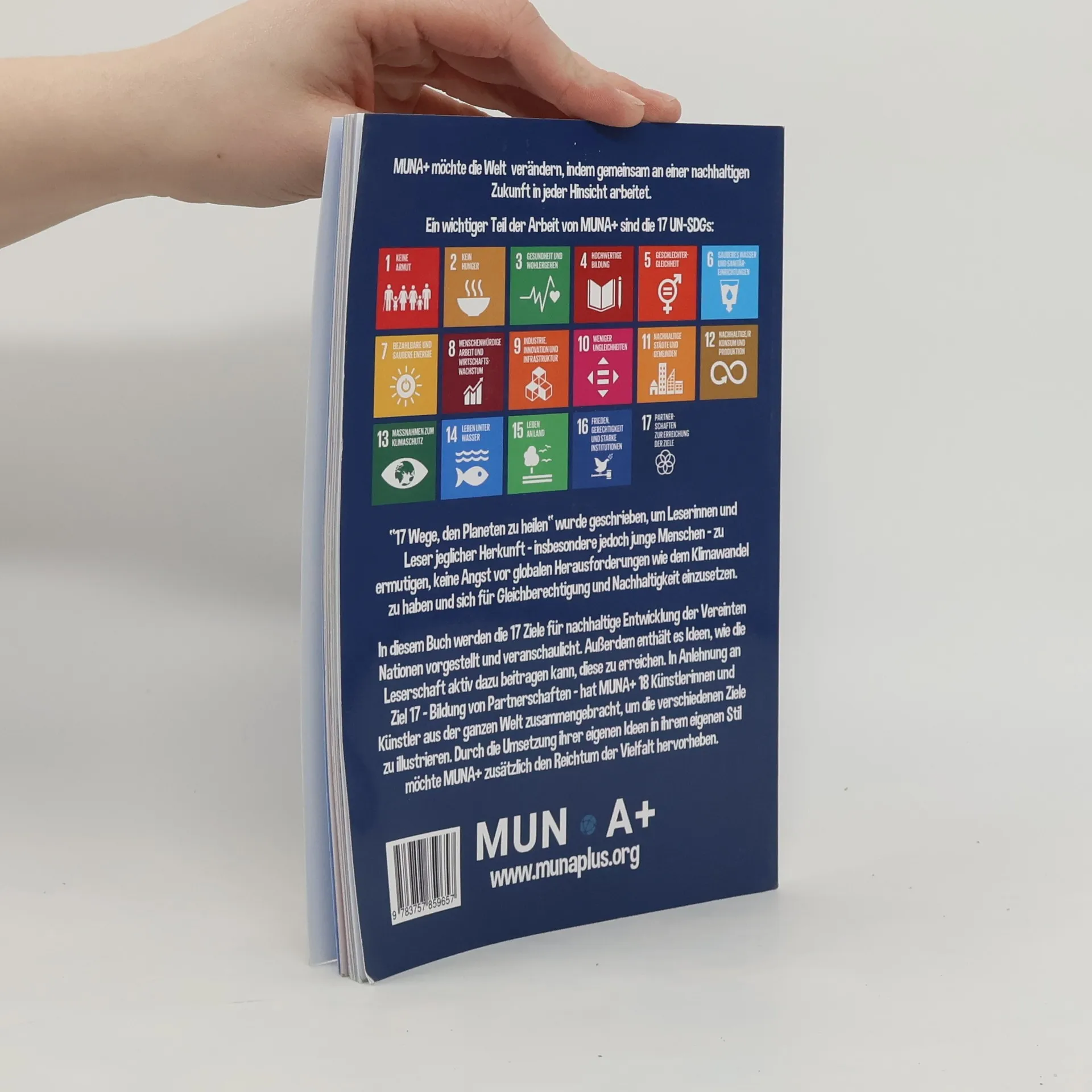 "17 Wege, den Planeten zu heilen" wurde geschrieben, um Leserinnen und Leser jeglicher Herkunft - insbesondere jedoch junge Menschen - zu ermutigen, keine Angst vor globalen Herausforderungen wie dem Klimawandel zu haben und sich für Gleichberechtigung und Nachhaltigkeit einzusetzen. In diesem Buch werden die 17 Ziele für nachhaltige Entwicklung der Vereinten Nationen vorgestellt und veranschaulicht. Außerdem enthält es Ideen, wie die Leserschaft aktiv dazu beitragen kann, diese zu erreichen. In Anlehnung an Ziel 17 - Bildung von Partnerschaften - hat MUNA+ 18 Künstlerinnen und Künstler aus der ganzen Welt zusammengebracht, um die verschiedenen Ziele zu illustrieren. Durch die Umsetzung ihrer eigenen Ideen in ihrem eigenen Stil möchte MUNA+ zusätzlich den Reichtum der Vielfalt hervorheben. Die Erlöse des Buches gehen in den Verein MUNA+ e.V., um Buchspenden an Kinder mit erschwertem Zugang zu ermöglichen und um weitere gemeinnützige Projekte, im Rahmen der Nachhaltigkeitsziele der Vereinten Nationen, zu finanzieren.